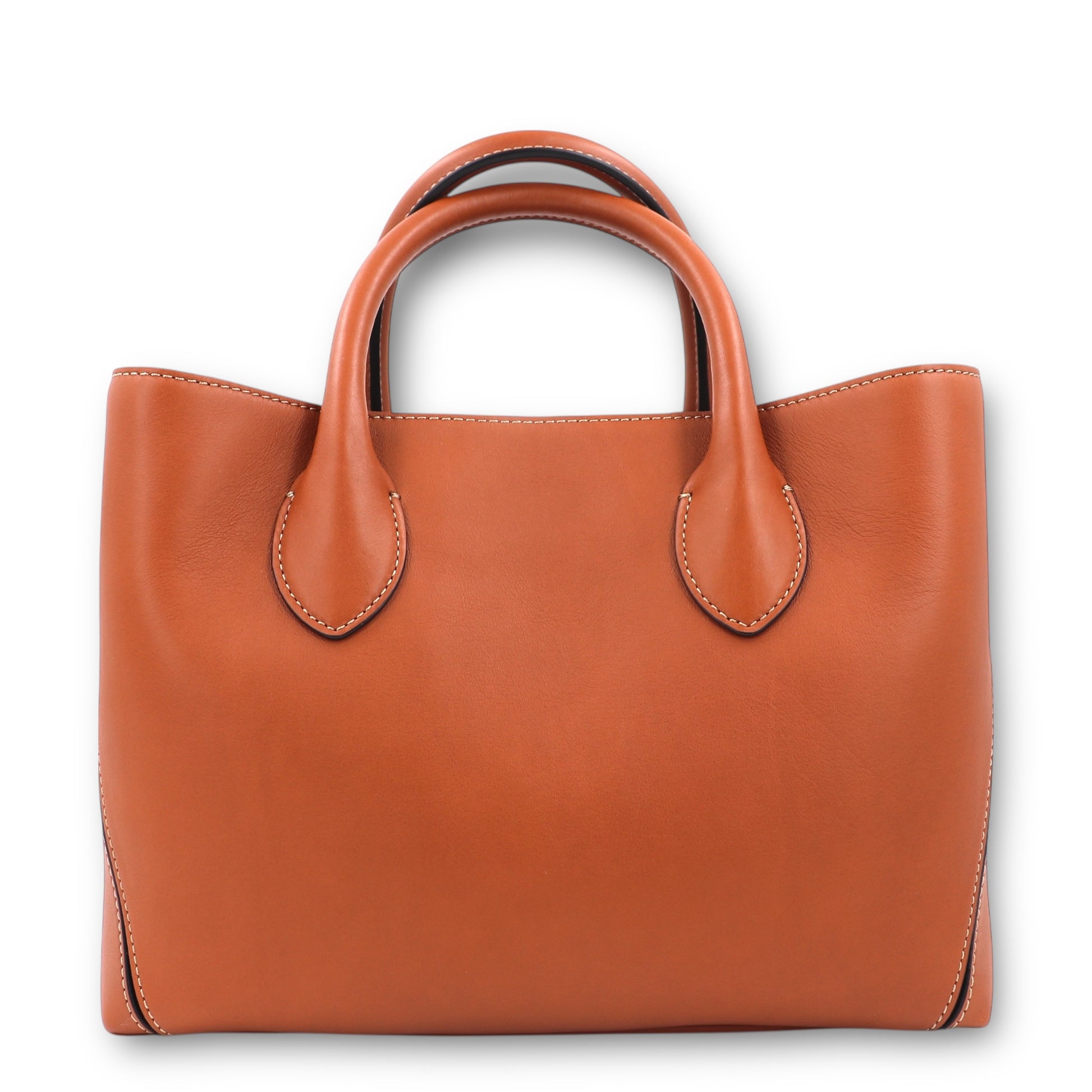 Dieses elegante Modell von Aspinal of London besticht durch sein glattes Leder in der Farbe „Tan“ und ist mit einem goldfarbenen Schriftzug und zwei Taschenanhängern verziert. Es verfügt über einen praktischen Magnetverschluss, zwei Lederhenkel von etwa 10 cm Höhe sowie einen abnehm- und verstellbaren Schulterriemen (ca. 115–127.5 cm). Die Innenausstattung aus beigem Textilfutter bietet drei übersichtliche Fächer: ein mittiges mit Reissverschluss, zwei Einschubfächer und ein weiteres Reissverschlussfach.