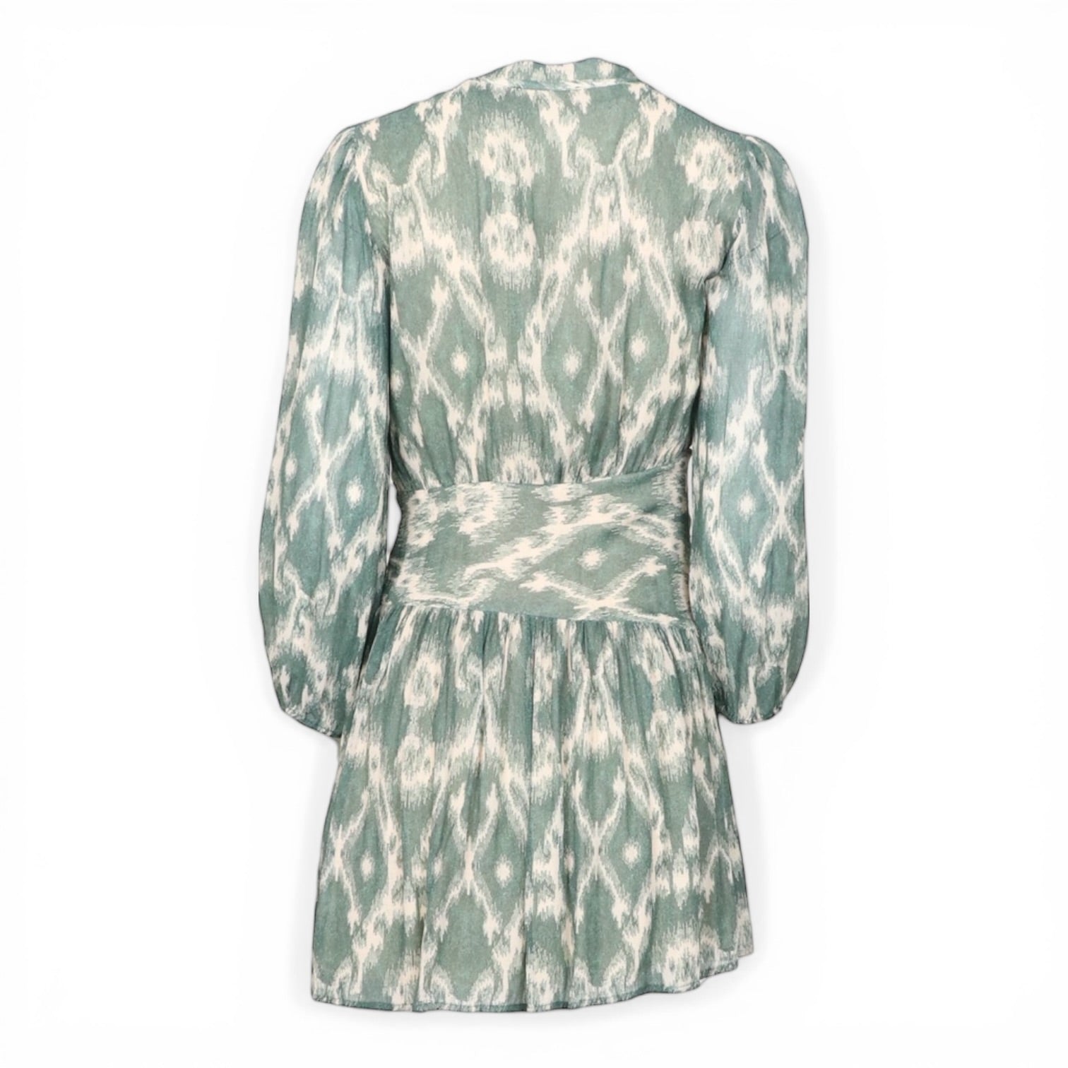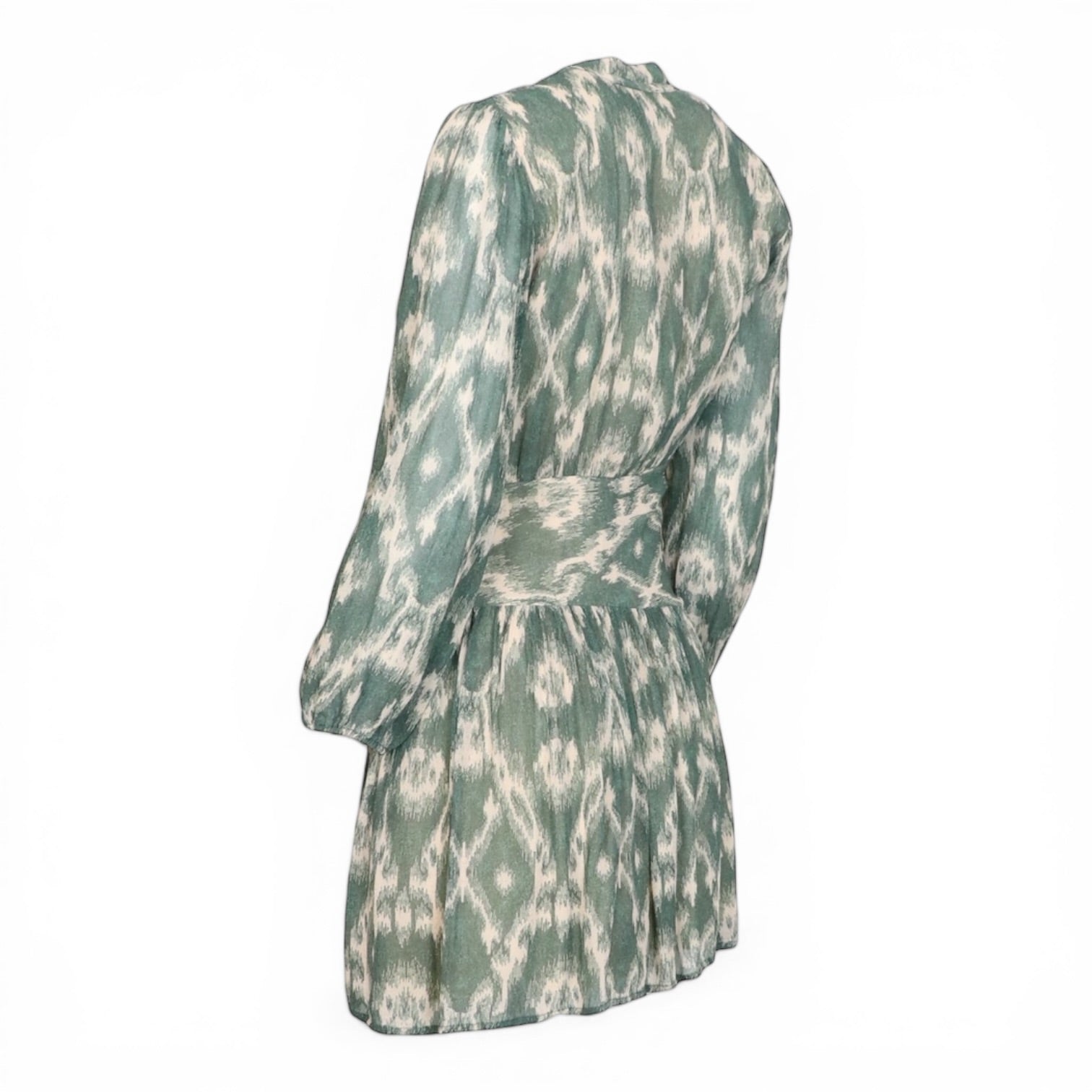 Feminin-leichtes Kleid von ba&sh mit dekorativem Muster in sanften Grün- und Cremetönen. Der fliessende Stoff, die leicht gerafften Ärmel und die betonte Taille sorgen für eine schmeichelhafte Silhouette und hohen Tragekomfort. Ein stilvolles Modell für entspannte, elegante Looks im Alltag oder an warmen Tagen.