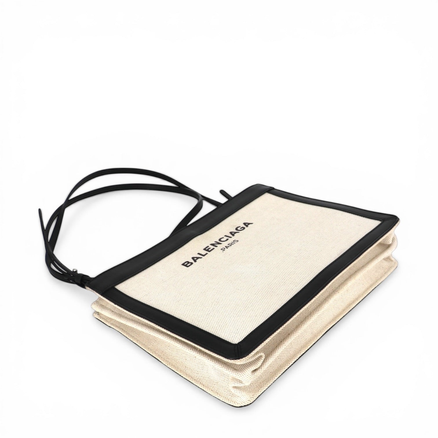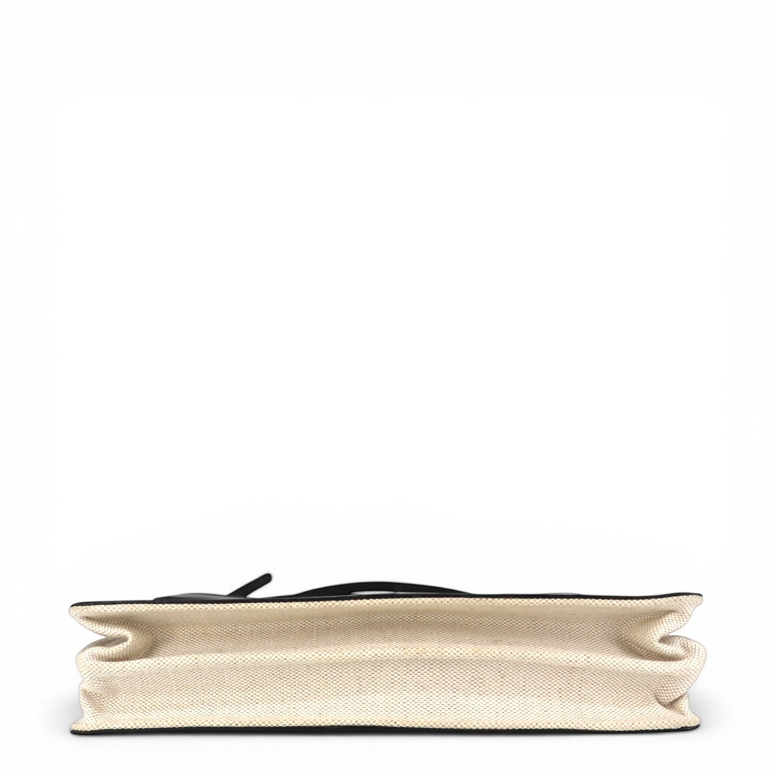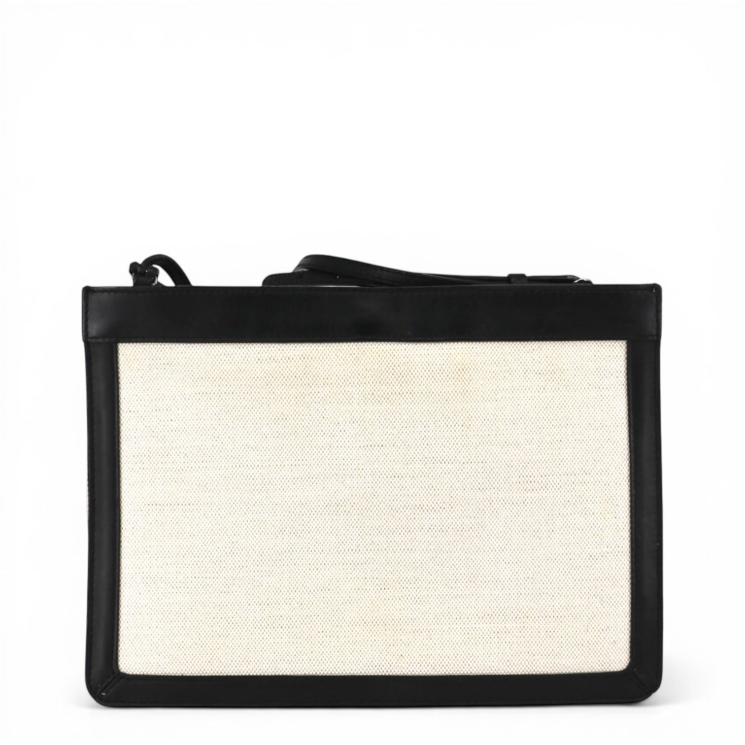 Die Tasche ist aus elfenbeinfarbener Baumwolle gefertigt, die der Tasche eine leichte und moderne Optik verleiht. Der Stoff bildet einen eleganten Kontrast zu den Besätzen aus schwarzem Kalbsleder, die für Stabilität sorgen und das Design hochwertig abrunden.