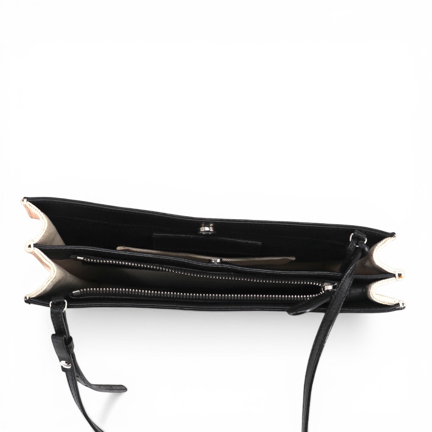 Im Inneren befinden sich zwei separate Fächer, eines mit Reissverschluss und eines mit Druckknopfverschluss. Letzteres bietet zudem ein flaches Einschubfach für kleinere Gegenstände.
