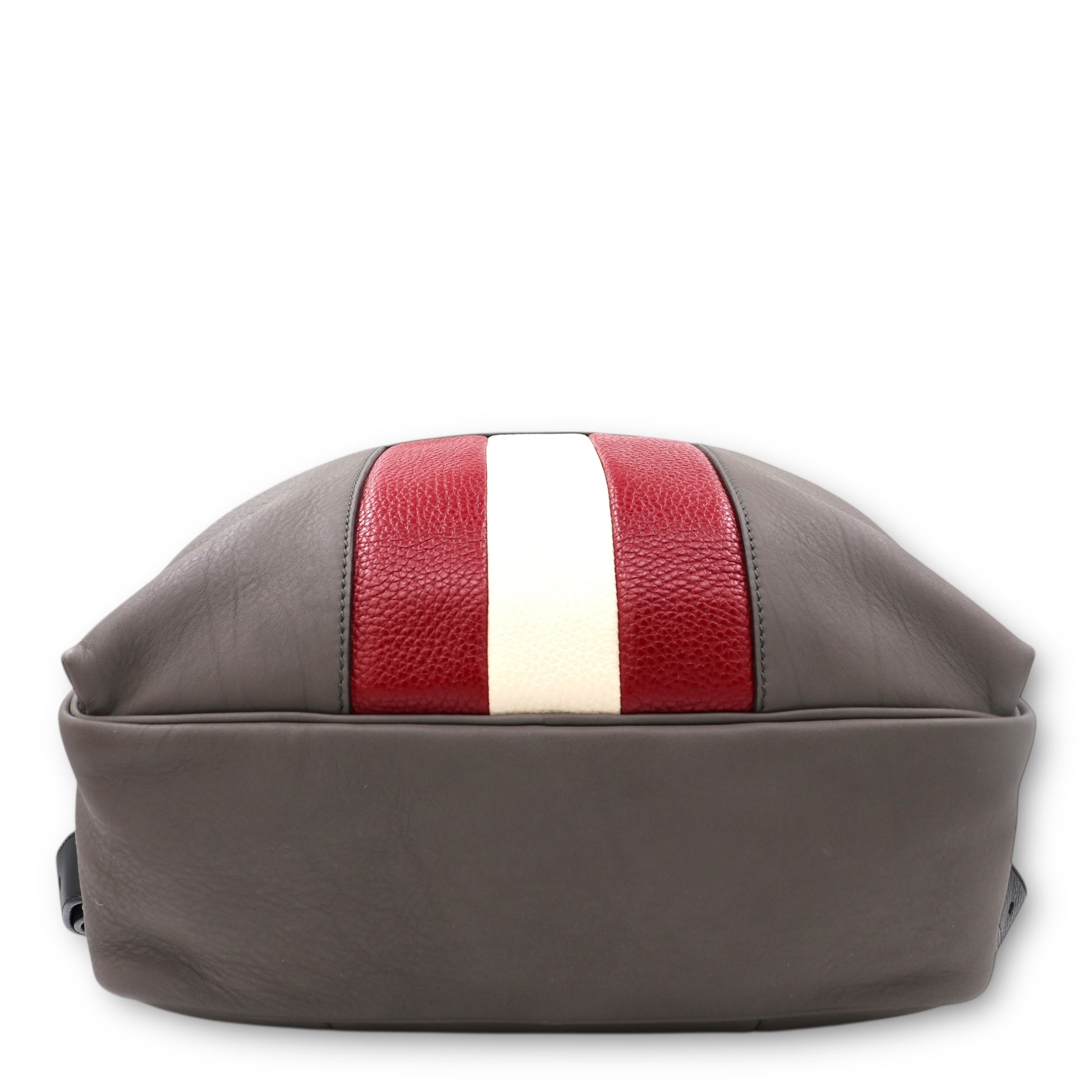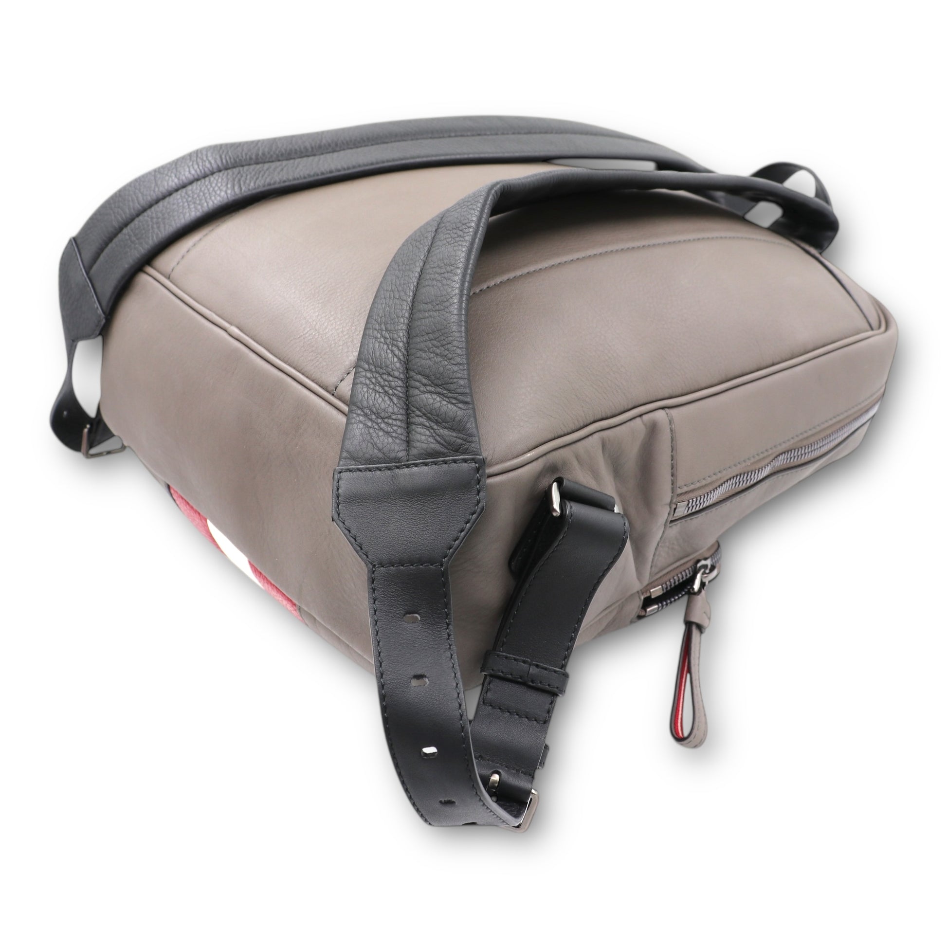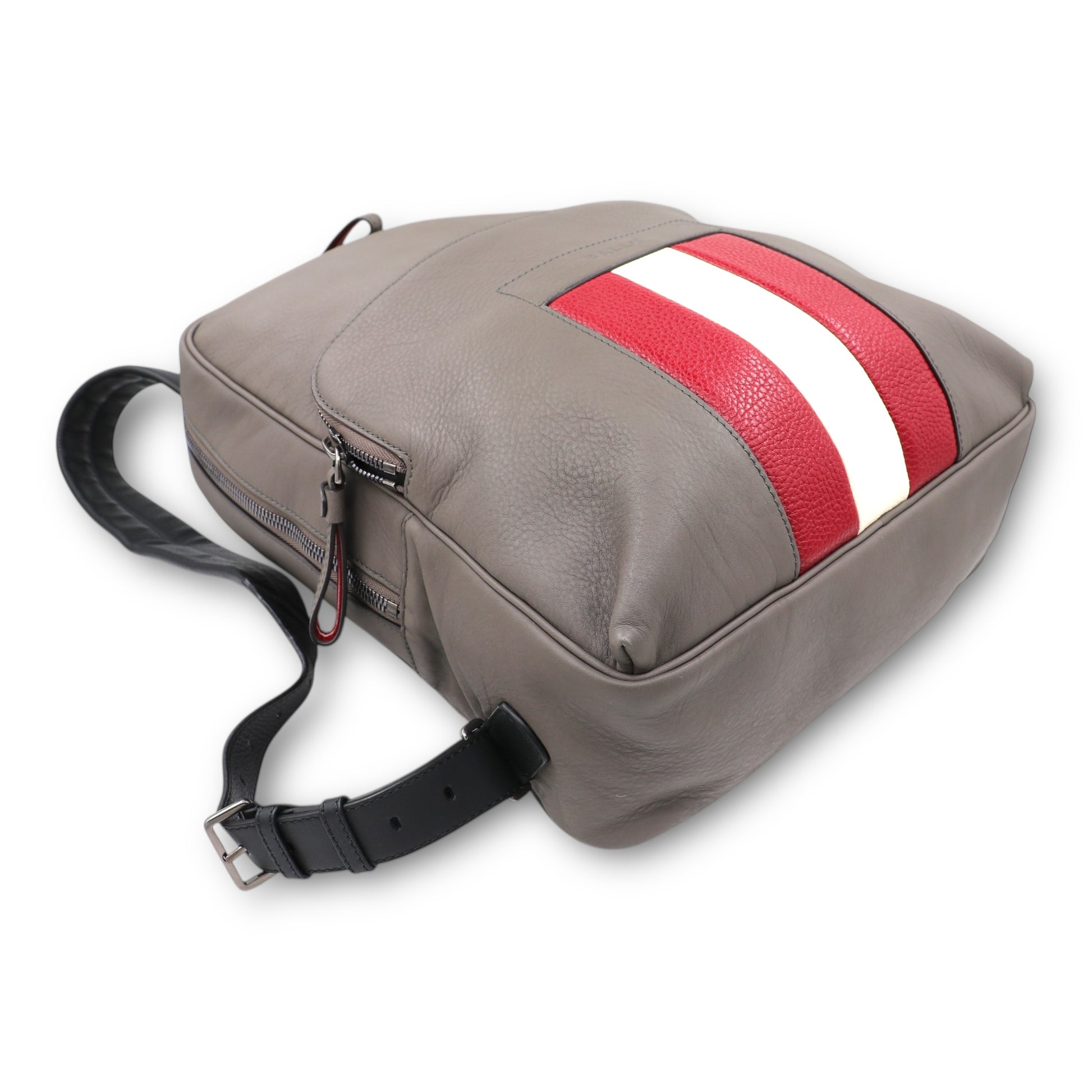 Gefertigt aus hochwertigem, genarbtem Leder in elegantem grau-Ton, überzeugt dieser Rucksack durch seine klare, maskuline Silhouette und seine erstklassige Verarbeitung. Auf der Vorderseite setzt das ikonische Bally-Streifen-Detail in Rot und Weiss einen markanten Akzent, der dem Modell eine sportlich-elegante Note verleiht.