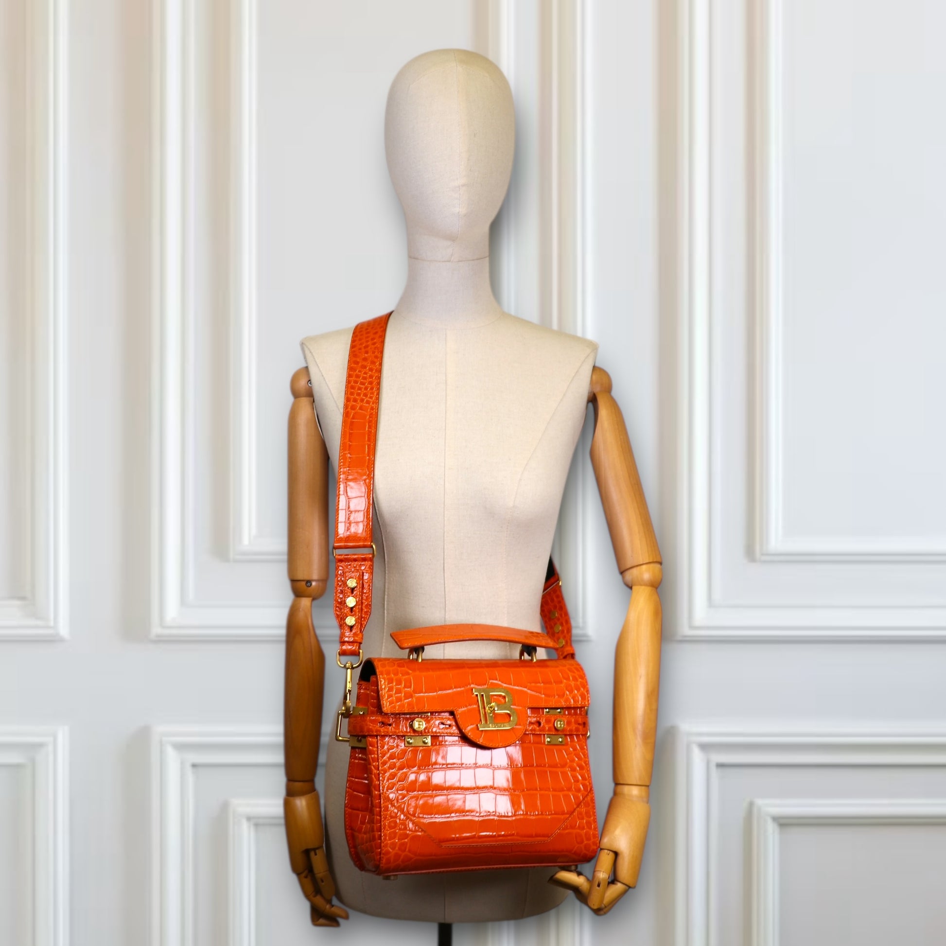 Diese eindrucksvolle B-Buzz 23 Tasche von Balmain verbindet luxuriöses Design mit moderner Ausdruckskraft. Gefertigt aus hochwertigem, orangefarbenem Leder mit markanter Kroko-Prägung, setzt sie ein kraftvolles Statement und verleiht jedem Look eine extravagante Note. Die intensive Farbe in Kombination mit den goldfarbenen Akzenten unterstreicht die charakteristische Handschrift des französischen Modehauses.
