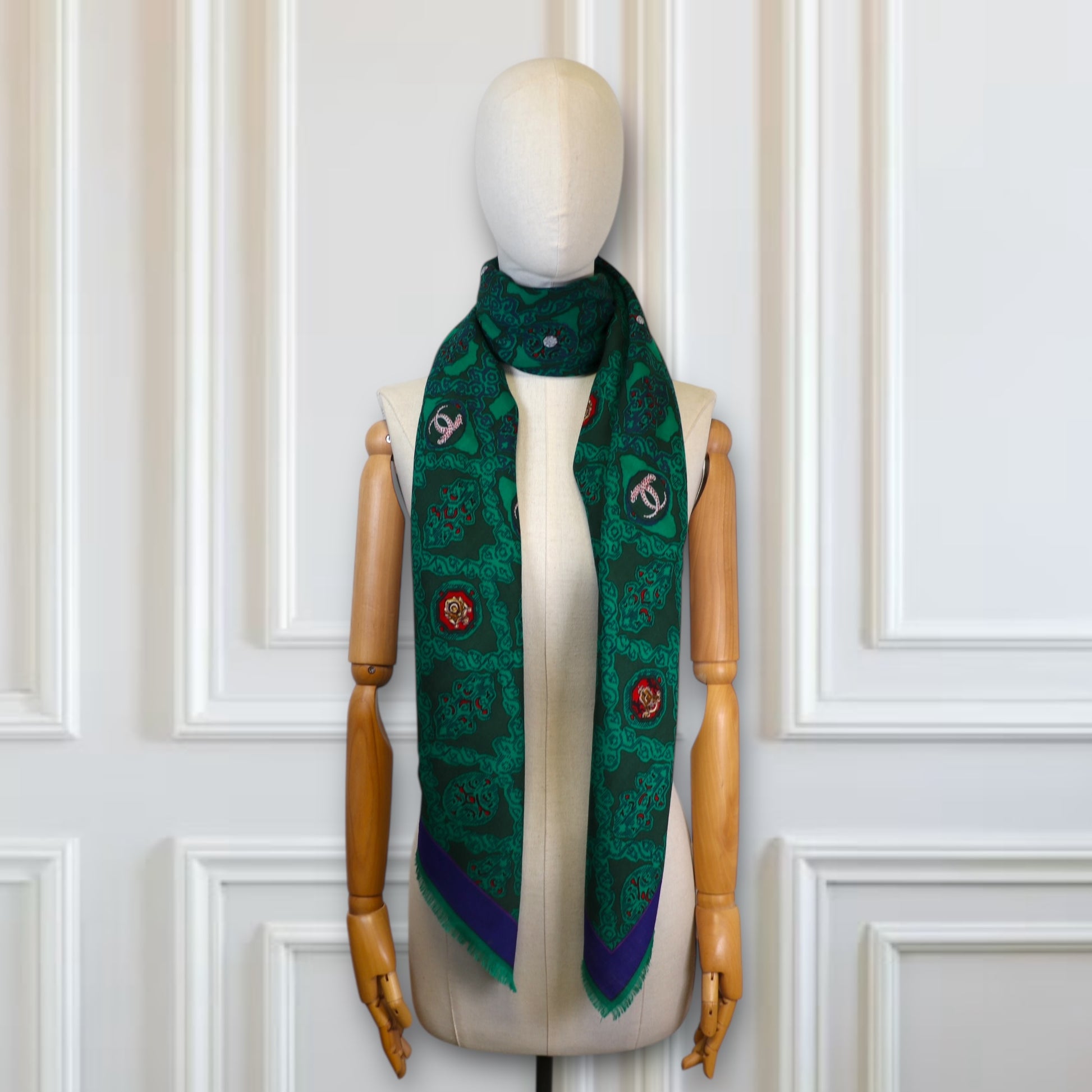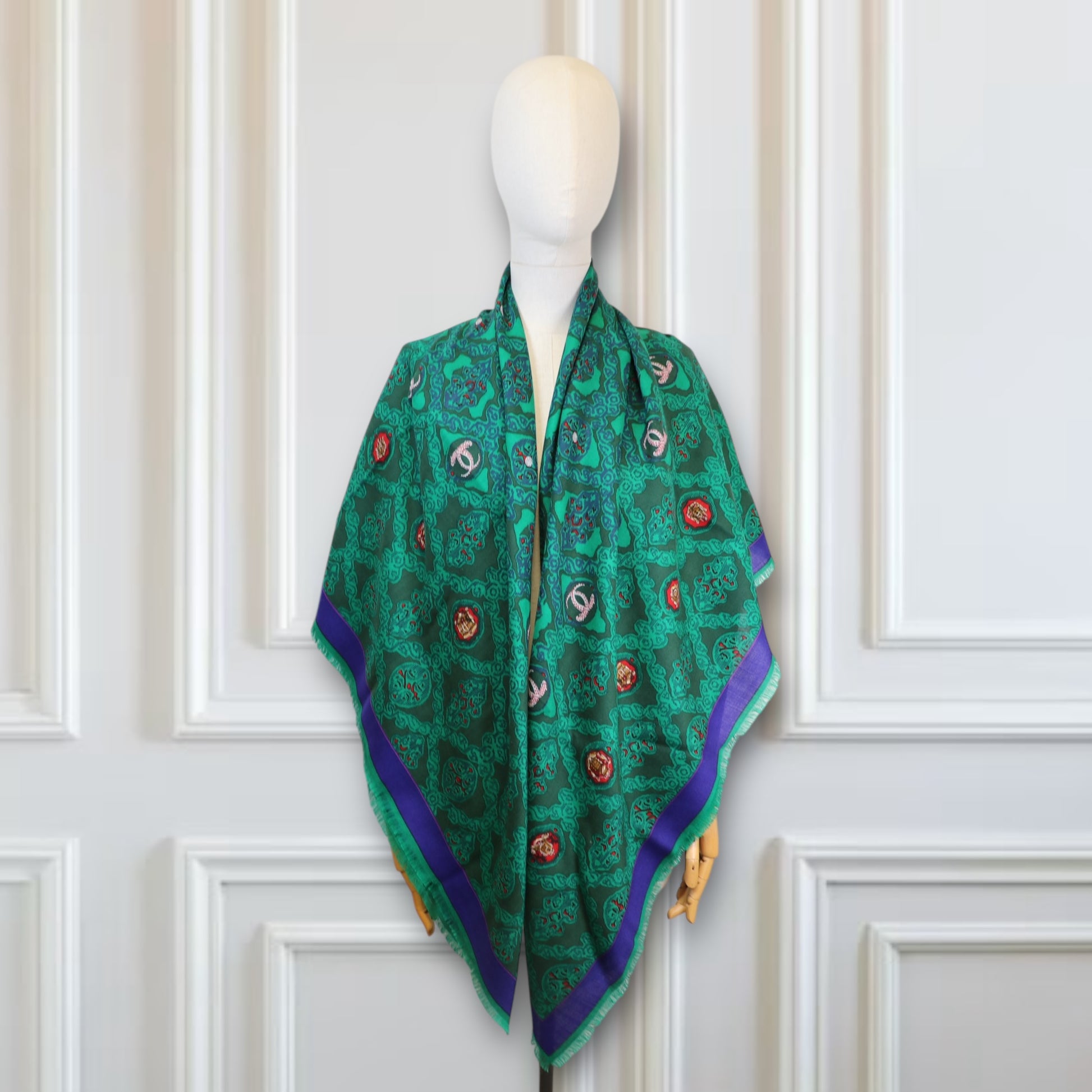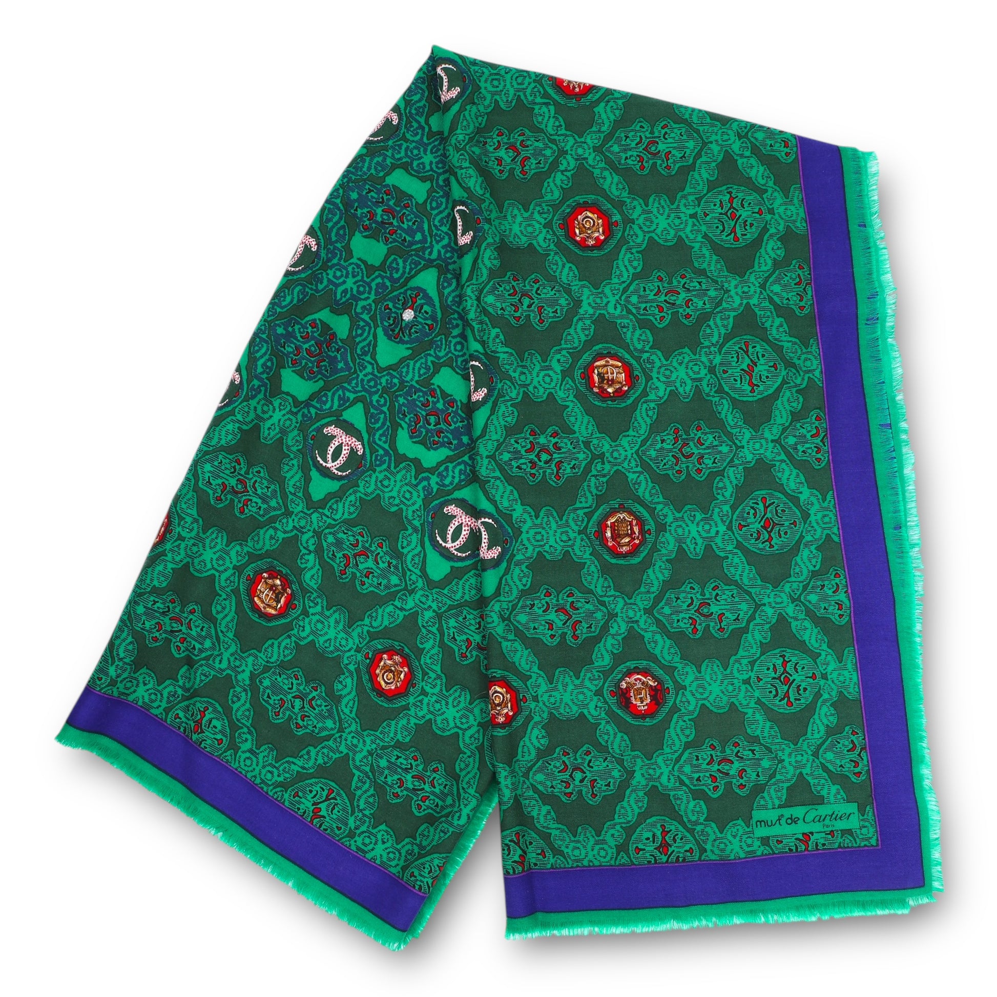 Das Tuch zeigt ein kunstvolles, reich verziertes Muster in sattem Smaragdgrün, durchzogen von ornamentalen Elementen und ikonischen Cartier-Motiven in Rot, Blau und Gold. Der tiefe Kobaltrahmen sowie die feinen Fransen an den Kanten verleihen dem Schal zusätzliche Eleganz und einen raffinierten Farbakzent.