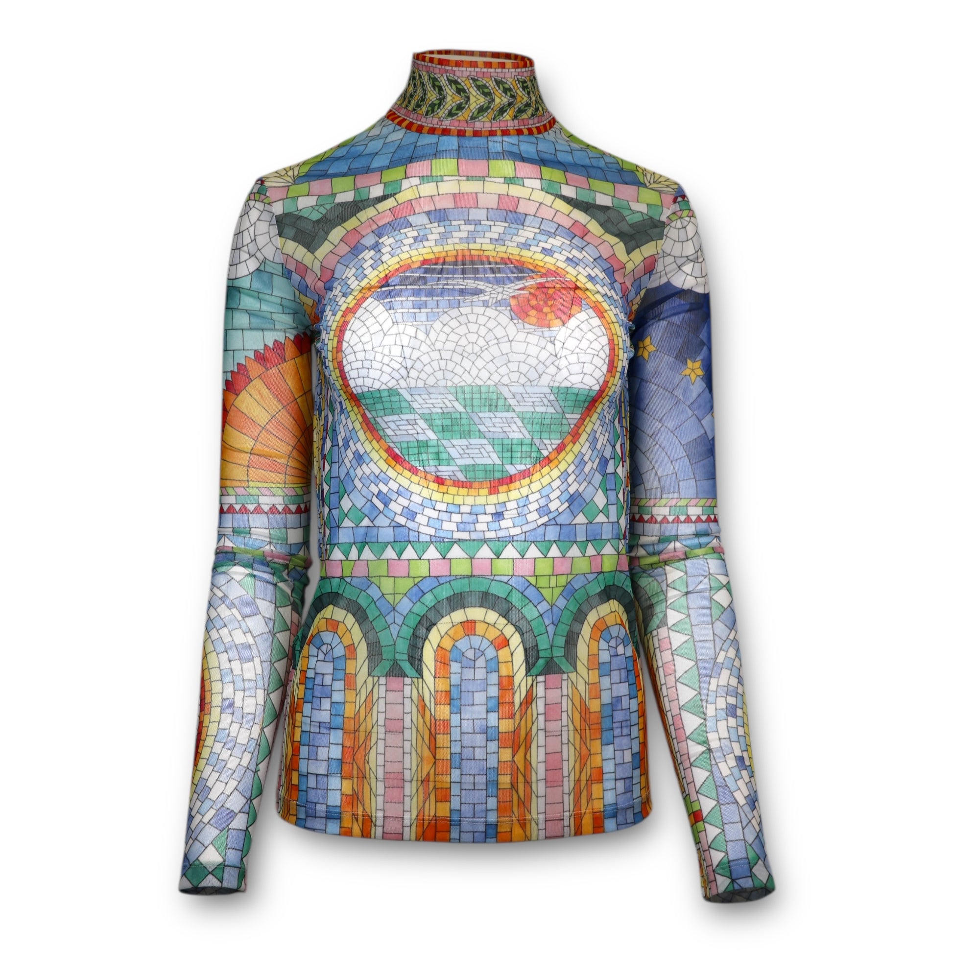 Der hochgeschlossene Kragen und die langen Ärmel sorgen für eine moderne, schlanke Silhouette und setzen das kunstvolle Design perfekt in Szene. Trotz der intensiven Farbigkeit bleibt das Oberteil stilvoll und ausgewogen – ein echtes Sammlerstück für Liebhaber:innen außergewöhnlicher Designerstücke.