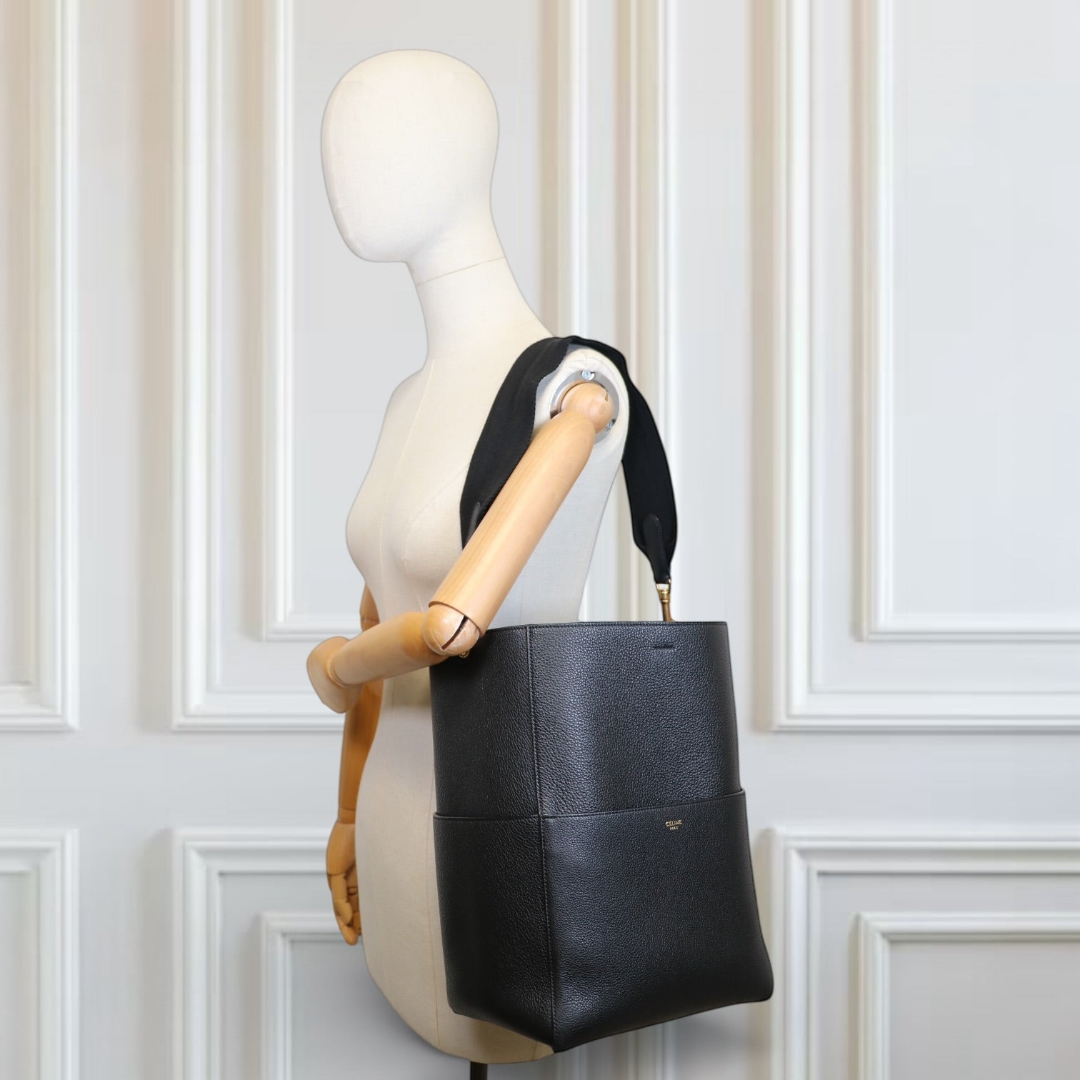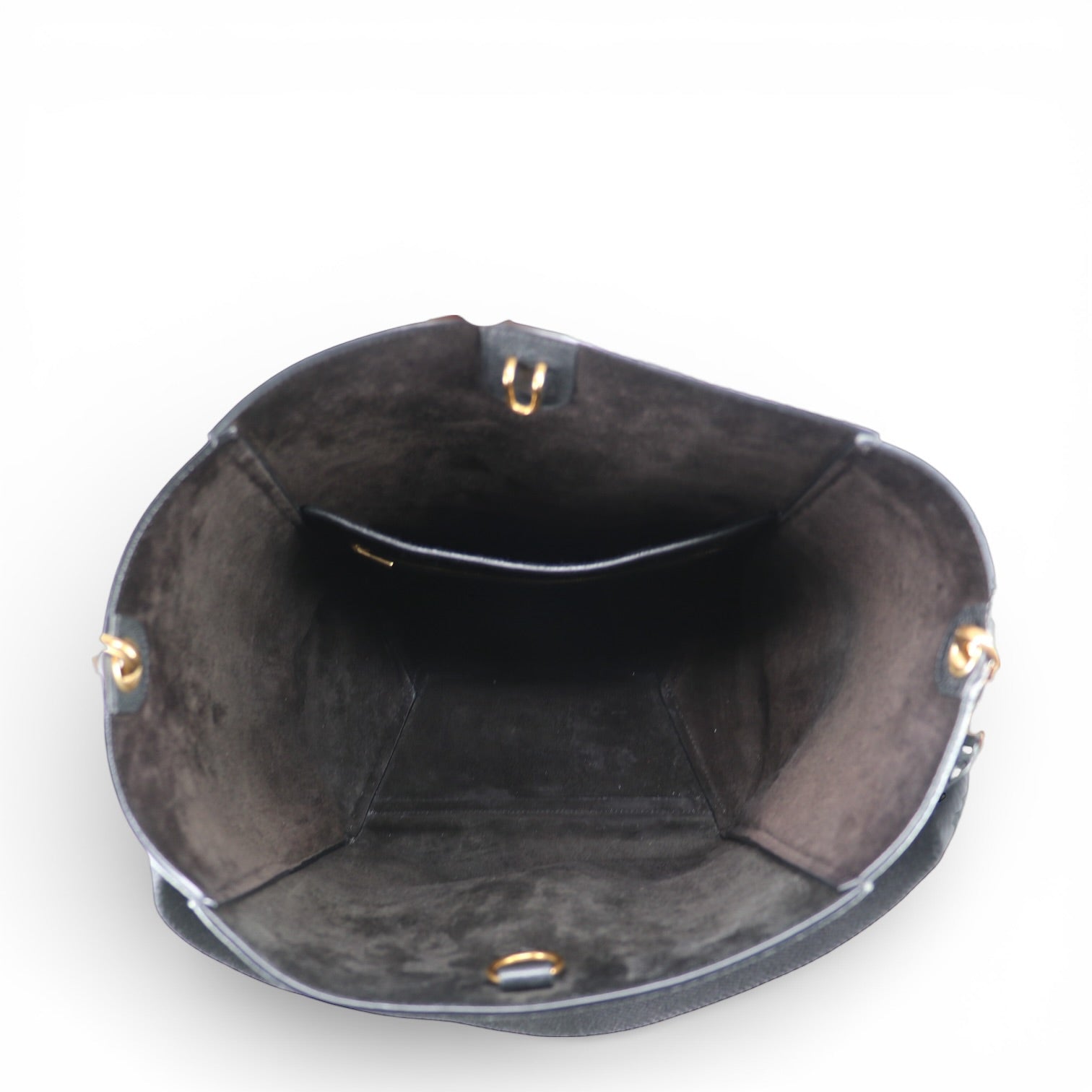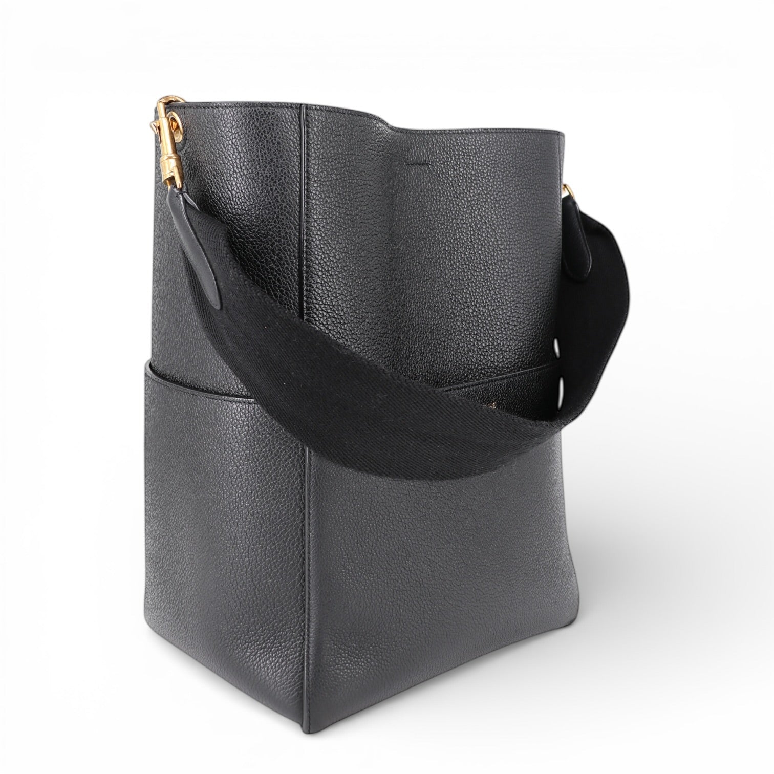 Diese elegante Beuteltasche Seau Sangle von Céline überzeugt durch ihr minimalistisches Design und ihre funktionale Aufteilung. Gefertigt aus hochwertigem, schwarzem Leder, besticht die Tasche durch ihre klare Linienführung und die feine, leicht genarbte Lederstruktur, die dem Modell eine zeitlose und zugleich moderne Ausstrahlung verleiht.