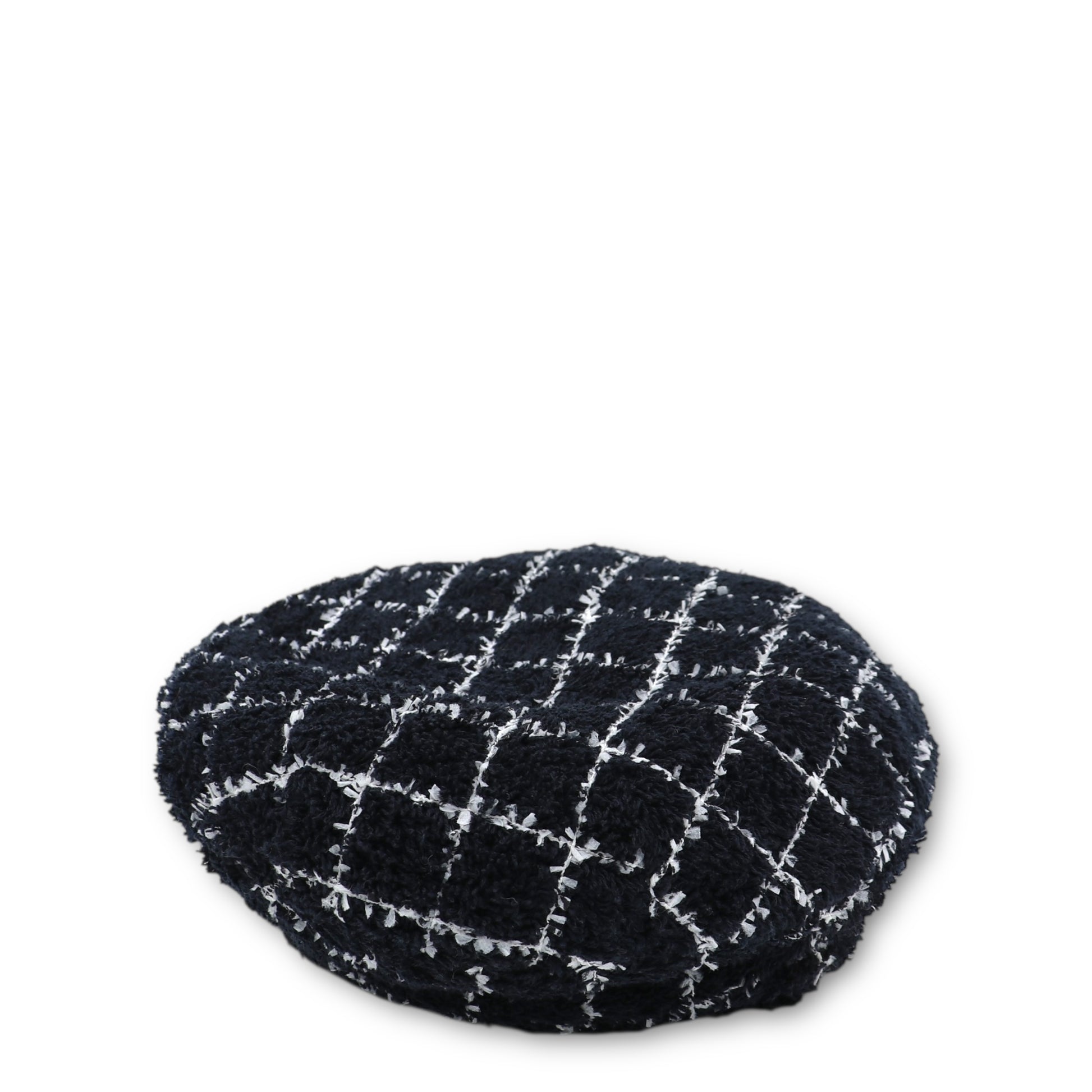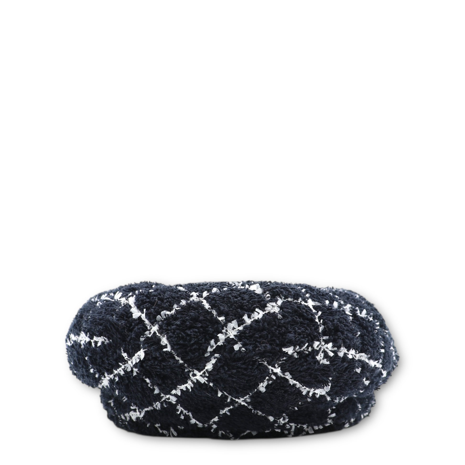 Dieser edle Béret von Chanel ist ein stilvolles Statement-Piece, das die unverwechselbare Handschrift des Hauses Chanel perfekt widerspiegelt. Das Modell präsentiert sich in einem klassischen Marine-Weiss-Tweed, dessen strukturierte Oberfläche sofort an die ikonischen Chanel-Kreationen aus der Haute Couture erinnert.