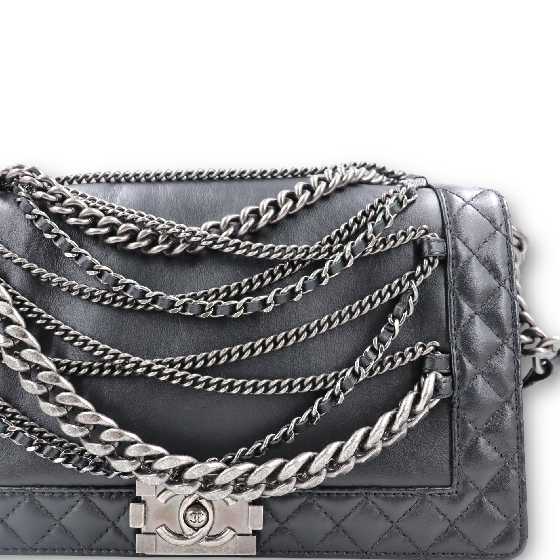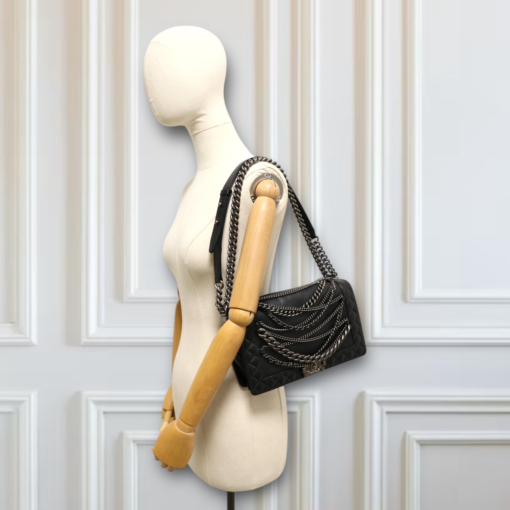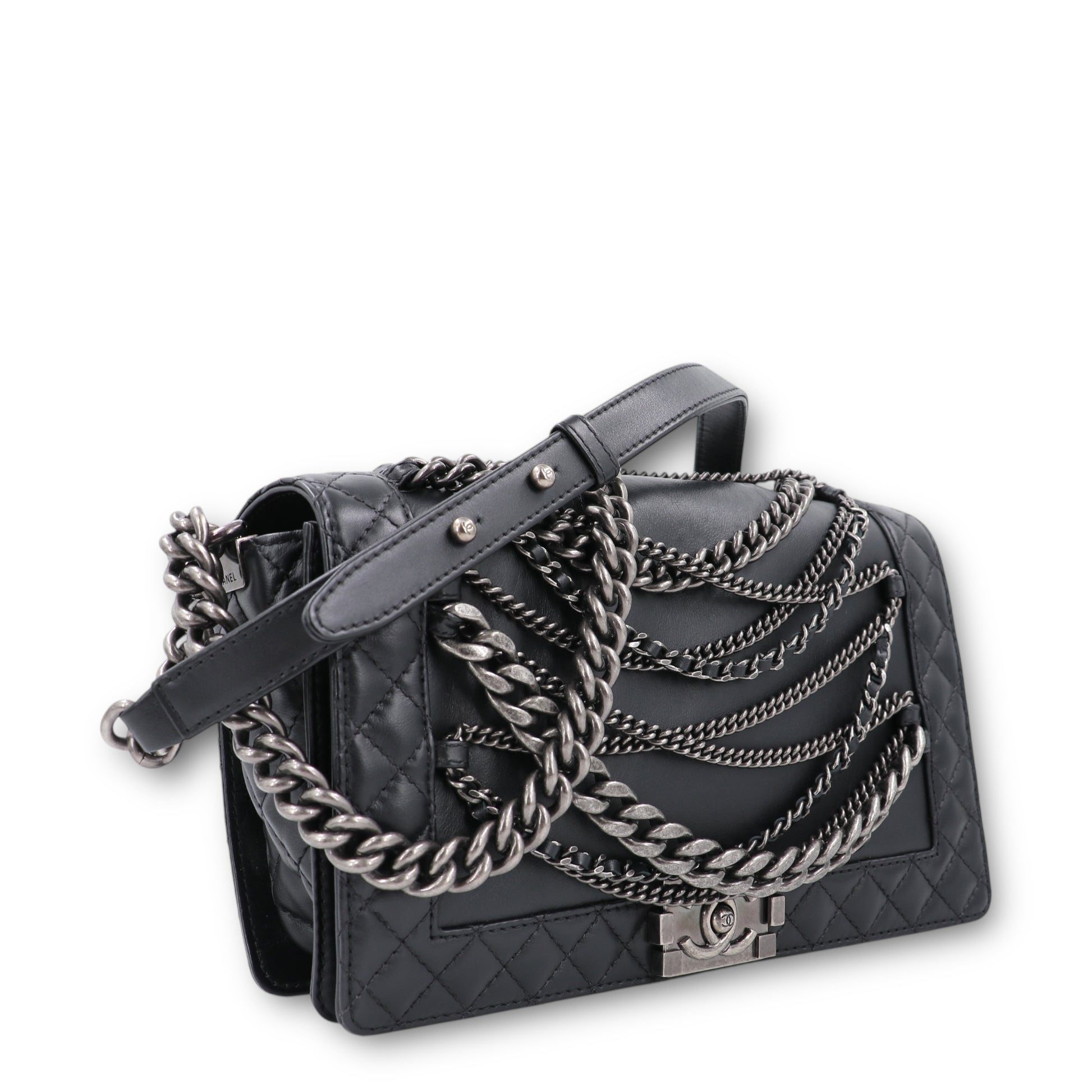 Die Boy Enchained in überzeugt mit ihrem schwarzen Leder, das an den Kanten mit Steppungen veredelt ist. Ein Metallverschluss mit Ruthenium-Finish sorgt für sicheren Halt, während der Kettenriemen mit einem Leder-Schulterpolster für angenehmen Tragekomfort sorgt. Das Kettendetail auf der Vorderseite verleiht der Tasche einen markanten Look. Innen bietet sie ein schwarzes Textilfutter, das in drei Fächer unterteilt ist, darunter ein geräumiges Hauptfach und ein Reissverschlussfach für eine übersichtliche Organisation.