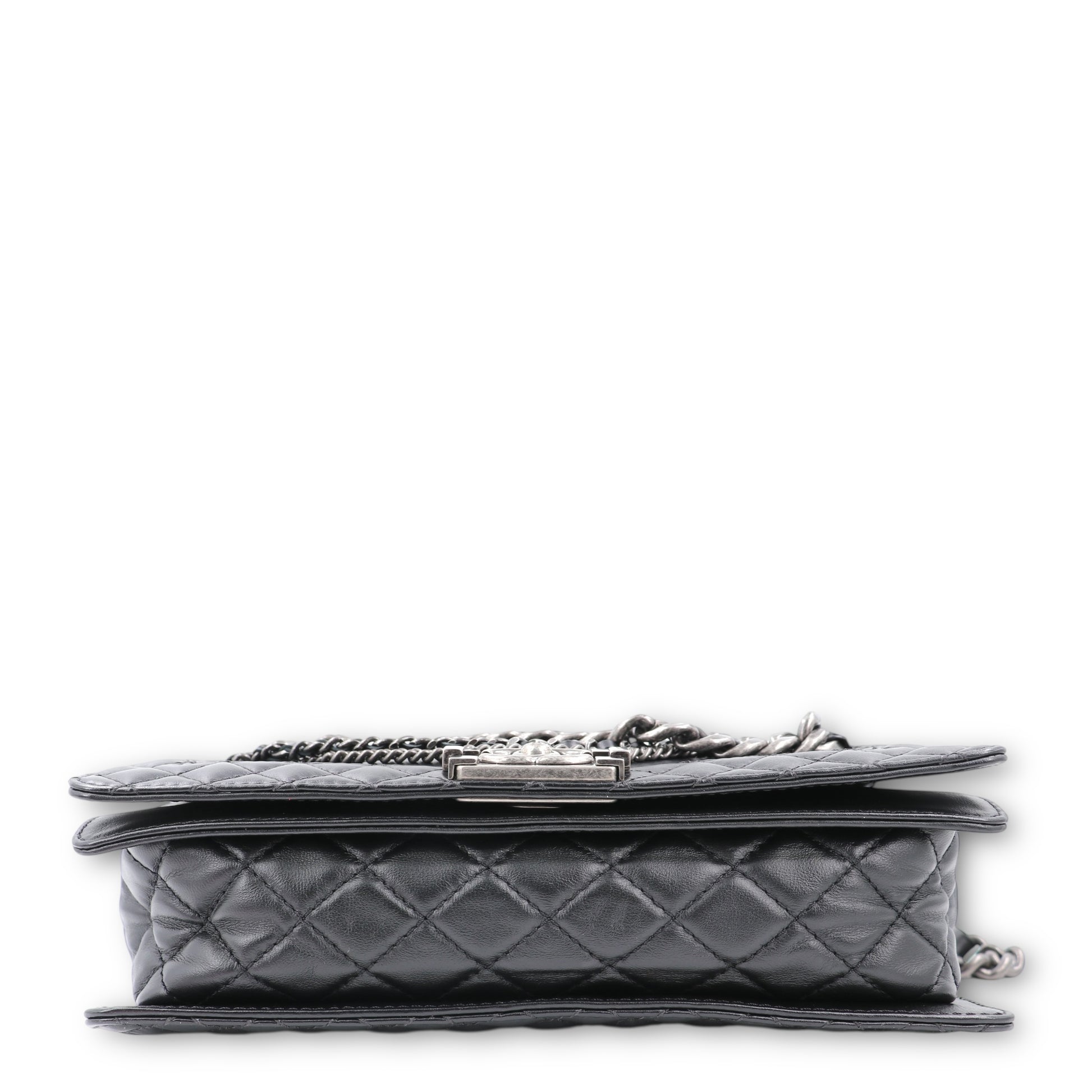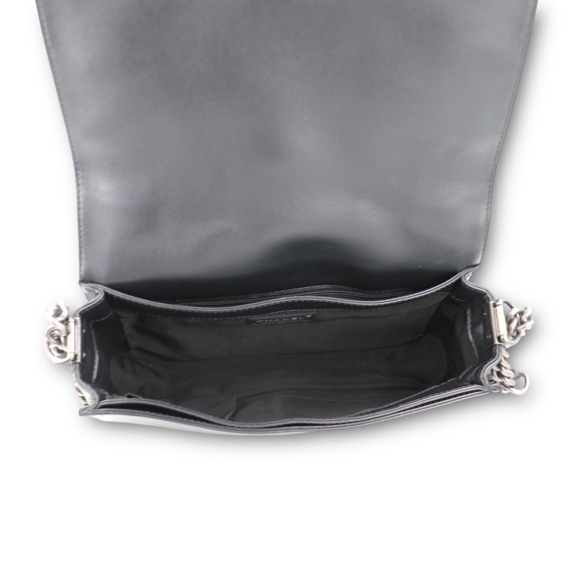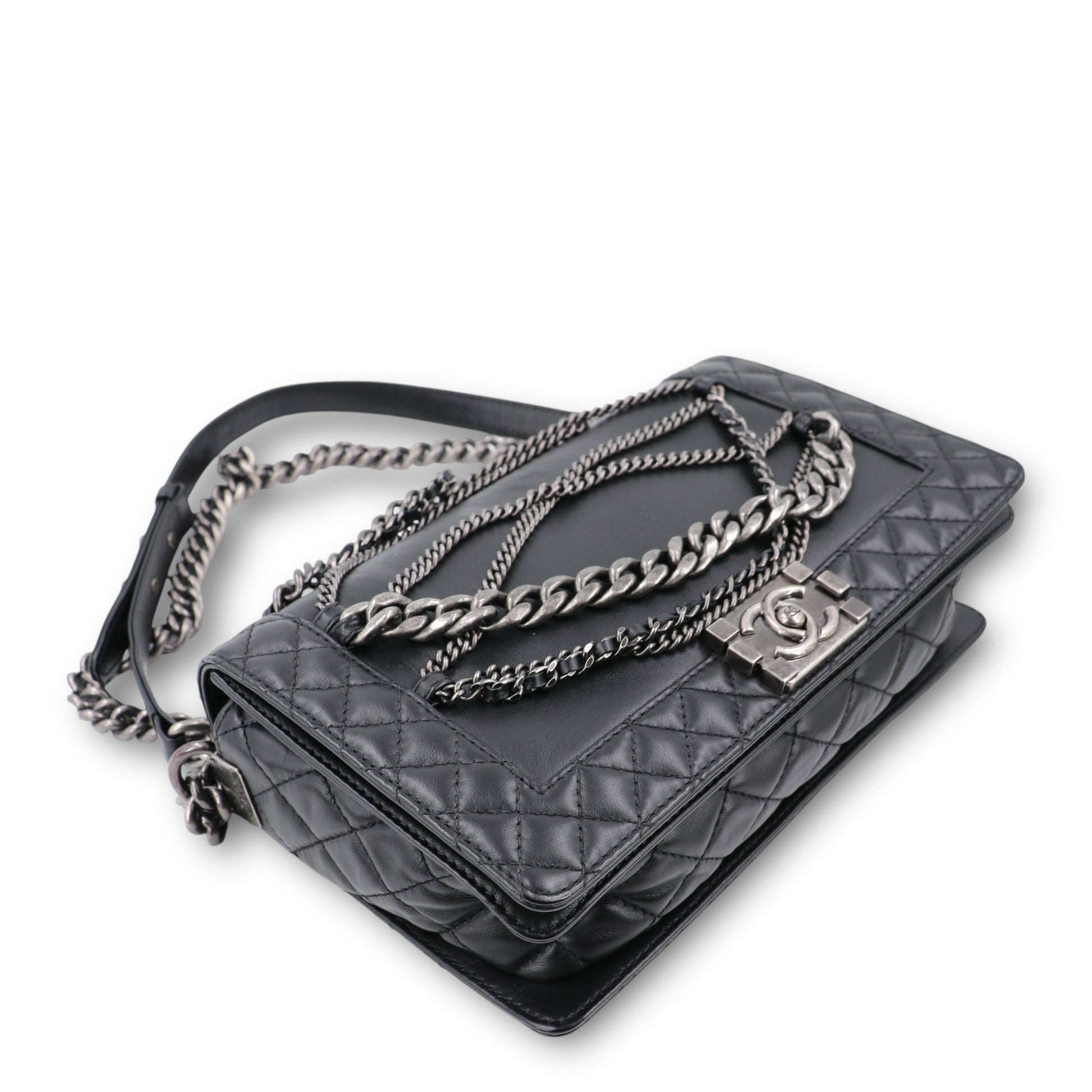 Die Boy Enchained in überzeugt mit ihrem schwarzen Leder, das an den Kanten mit Steppungen veredelt ist. Ein Metallverschluss mit Ruthenium-Finish sorgt für sicheren Halt, während der Kettenriemen mit einem Leder-Schulterpolster für angenehmen Tragekomfort sorgt. Das Kettendetail auf der Vorderseite verleiht der Tasche einen markanten Look. Innen bietet sie ein schwarzes Textilfutter, das in drei Fächer unterteilt ist, darunter ein geräumiges Hauptfach und ein Reissverschlussfach für eine übersichtliche Organisation.