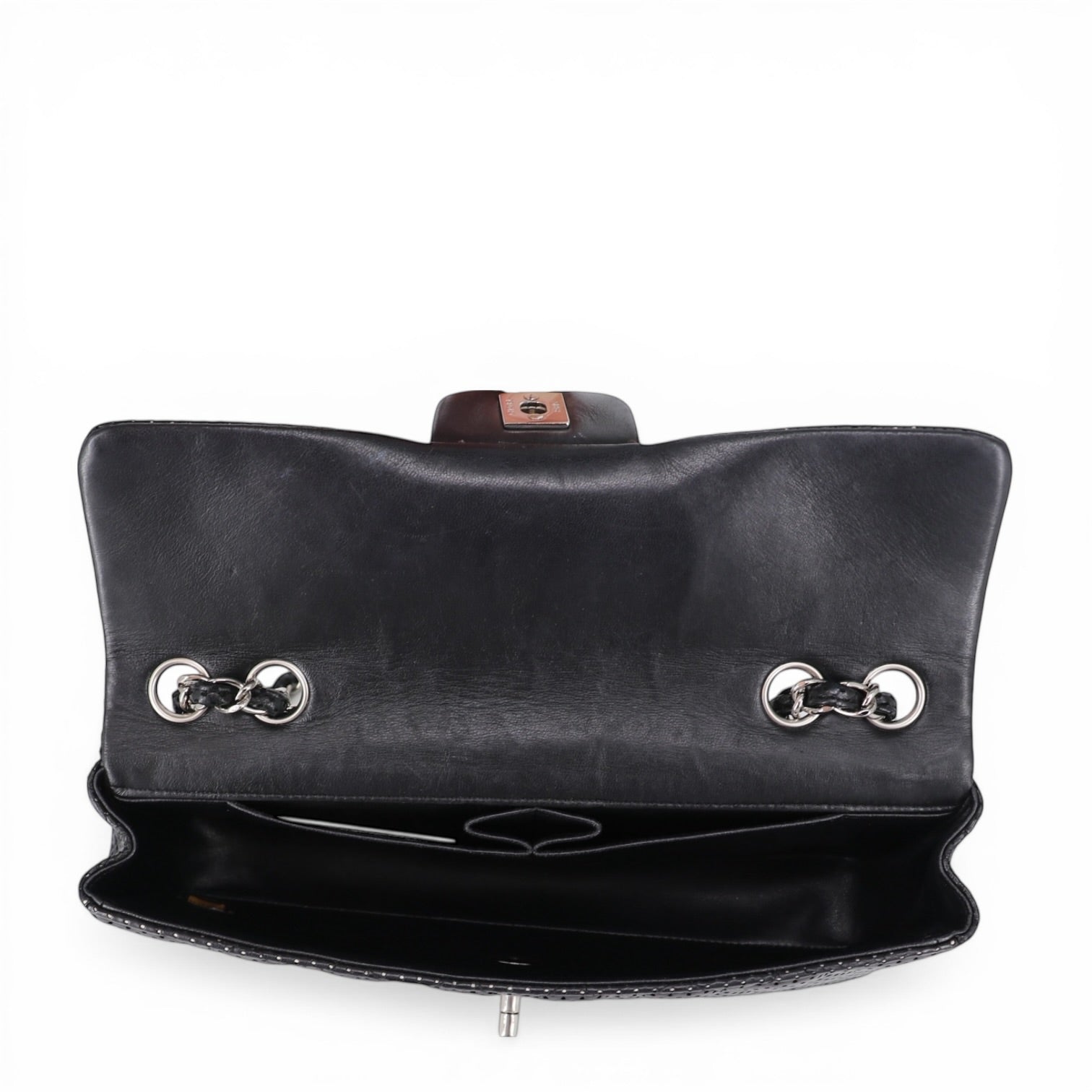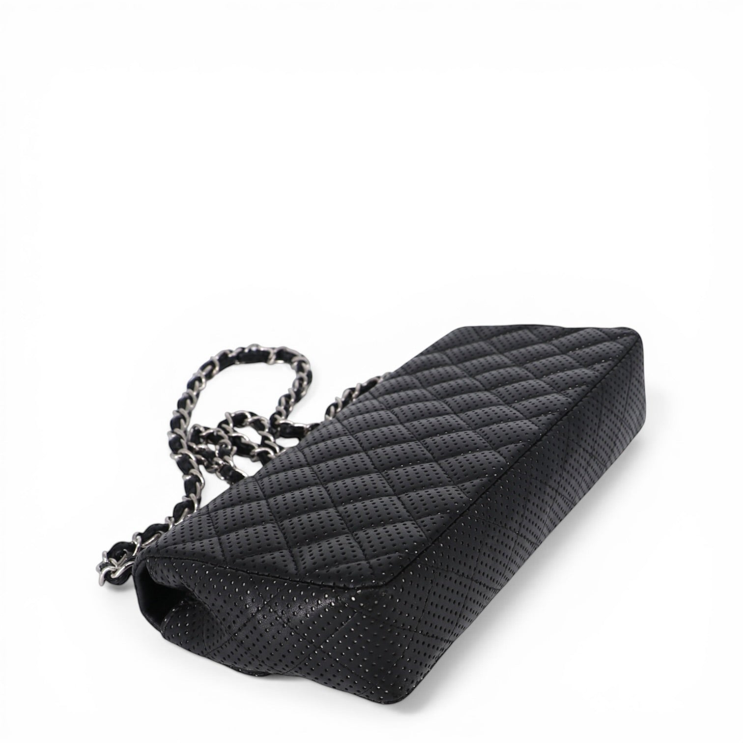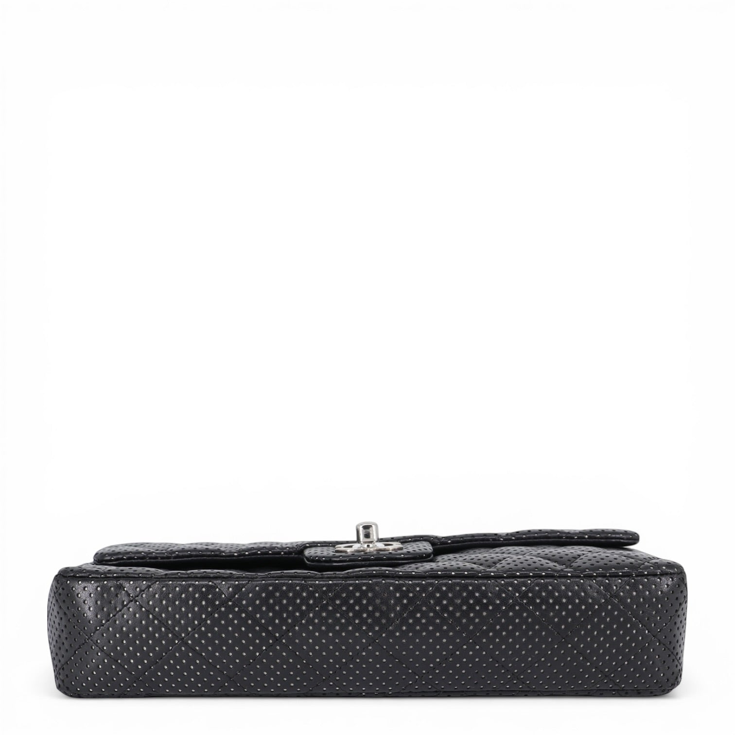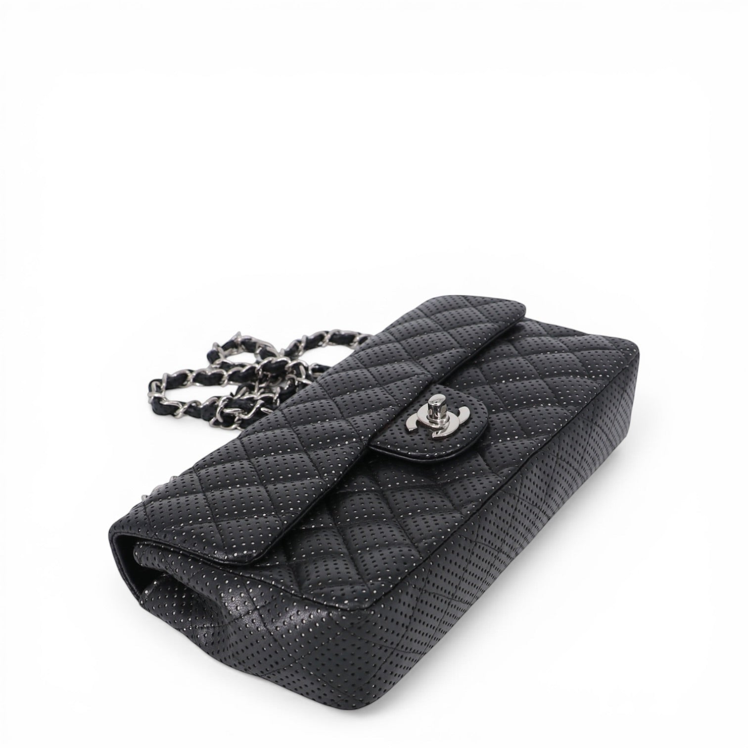 Das charakteristische Rautensteppmuster sorgt für die typische Chanel-Struktur und verleiht der Tasche Tiefe und Eleganz. Die feinen Perforationen lassen das silberfarbene Leder darunter dezent durchscheinen und schaffen so ein aussergewöhnliches Spiel aus Licht und Struktur.