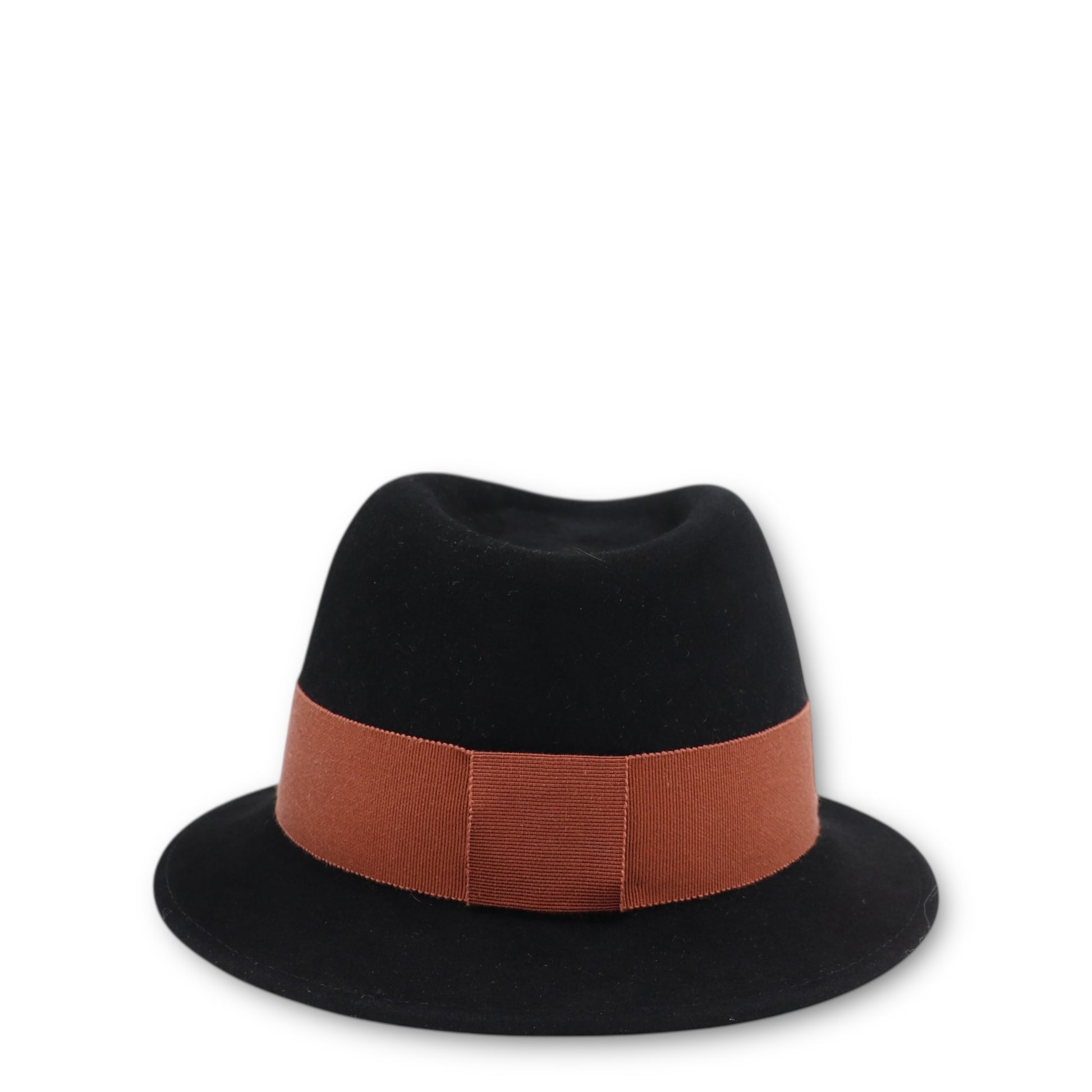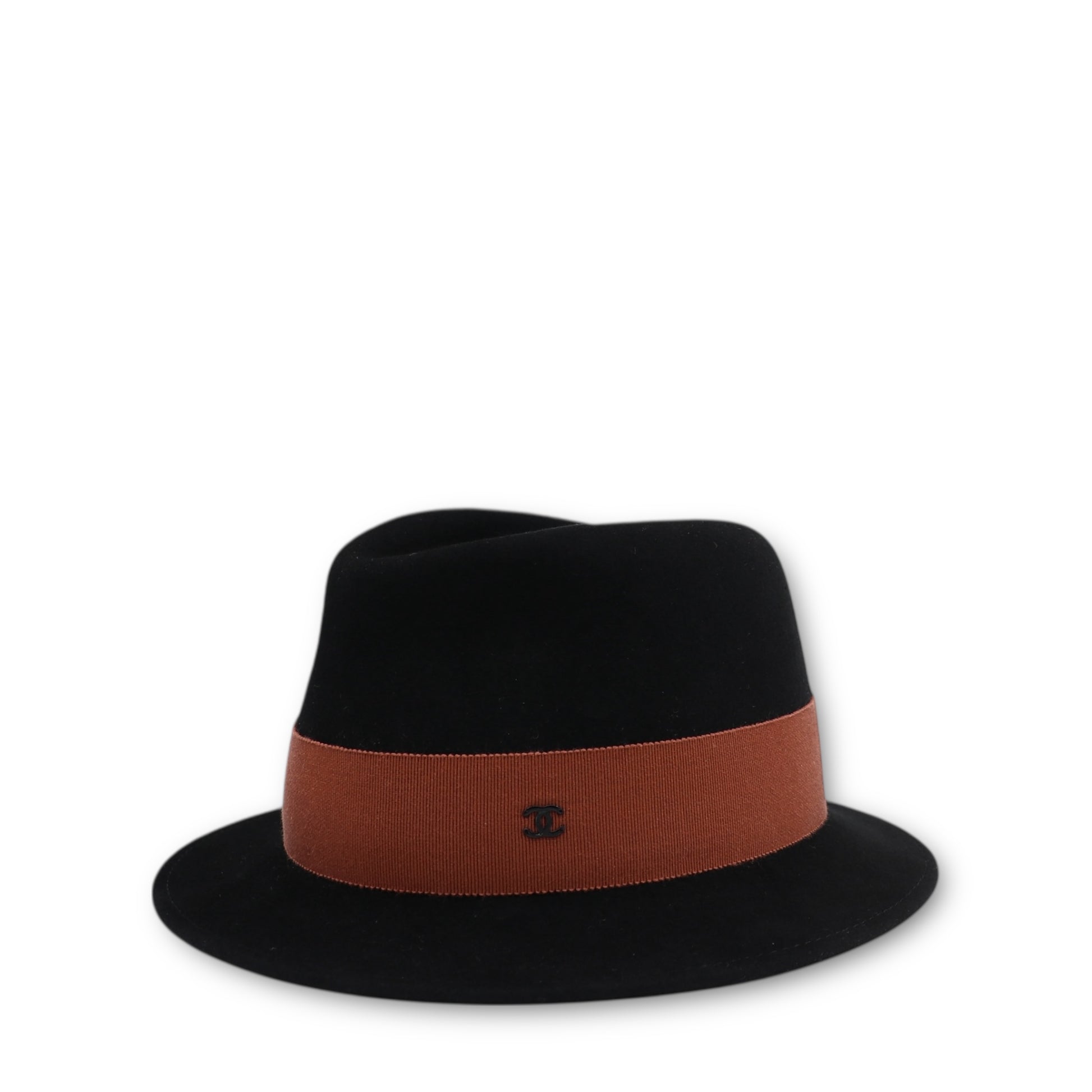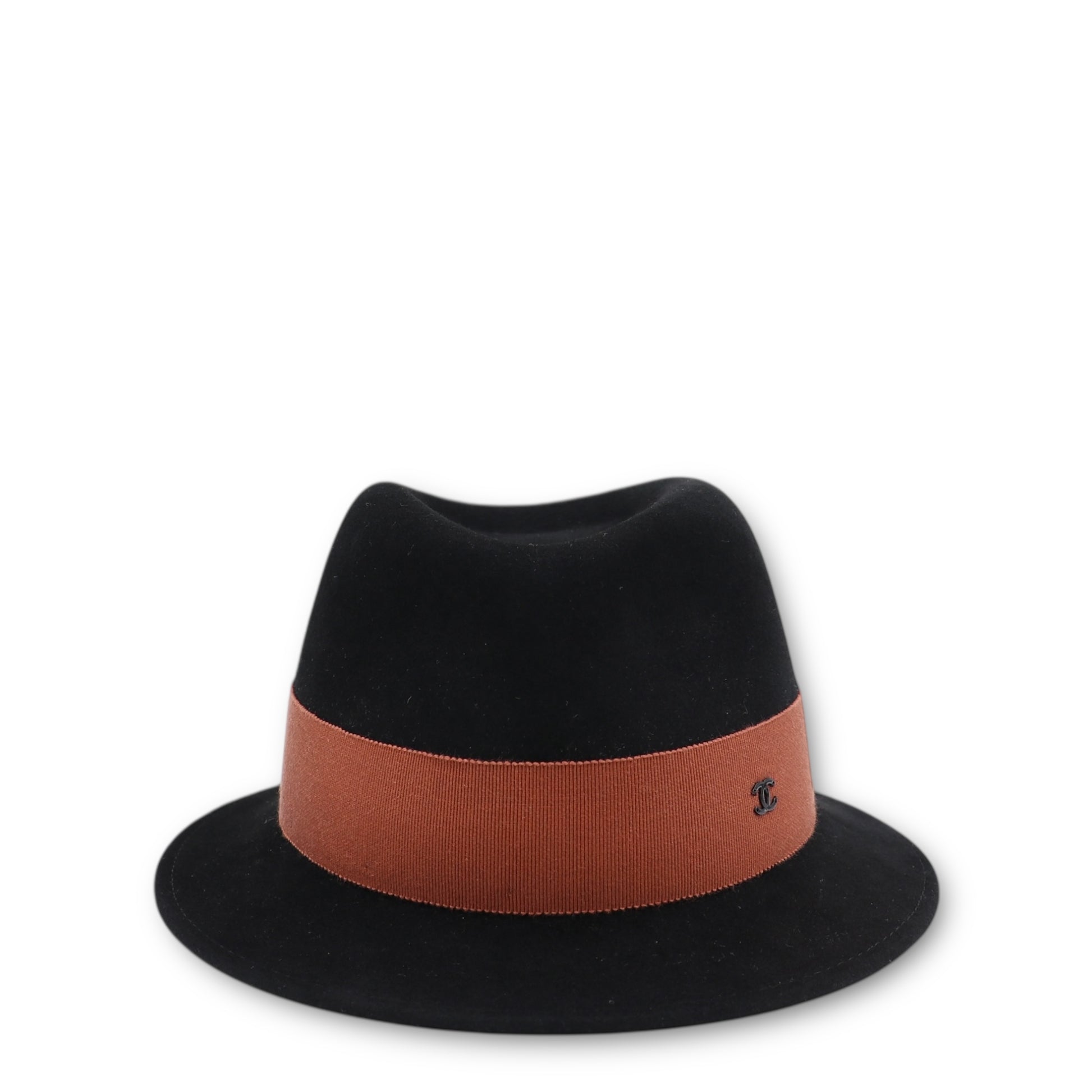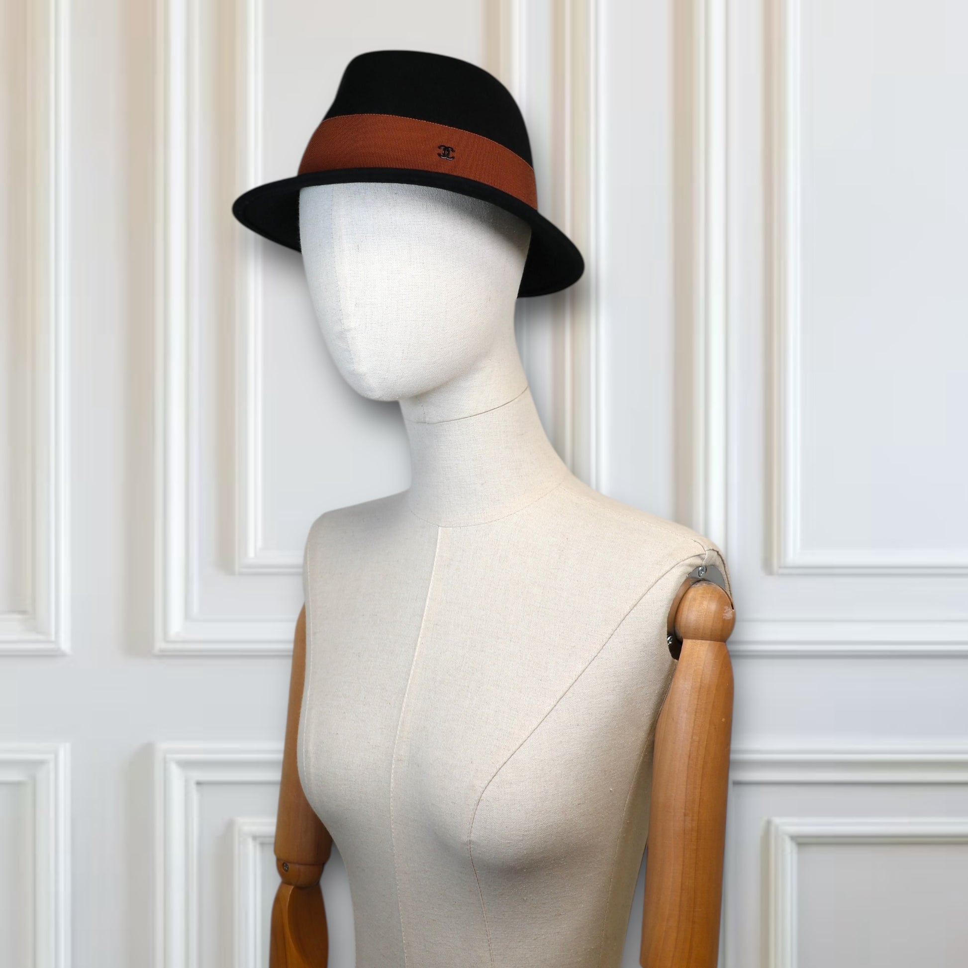 Die elegante Silhouette im klassischen Fedora-Stil wird durch ein breites Ripsband in warmem Braunton stilvoll akzentuiert. Ein dezentes CC-Logo an der Seite setzt einen zurückhaltenden, aber unverkennbaren Markenakzent und unterstreicht die exklusive Herkunft dieses Modells. Die harmonische Farbkombination aus tiefem Schwarz und Braun verleiht dem Hut eine edle, moderne Ausstrahlung.