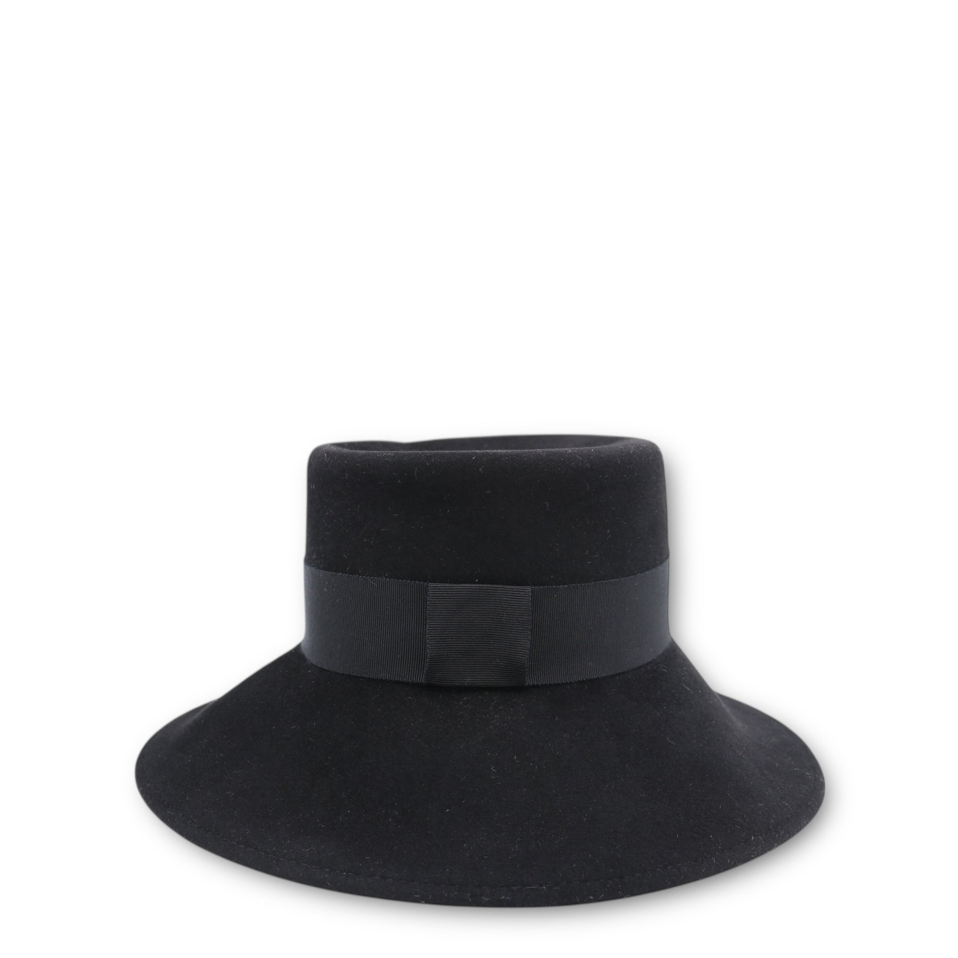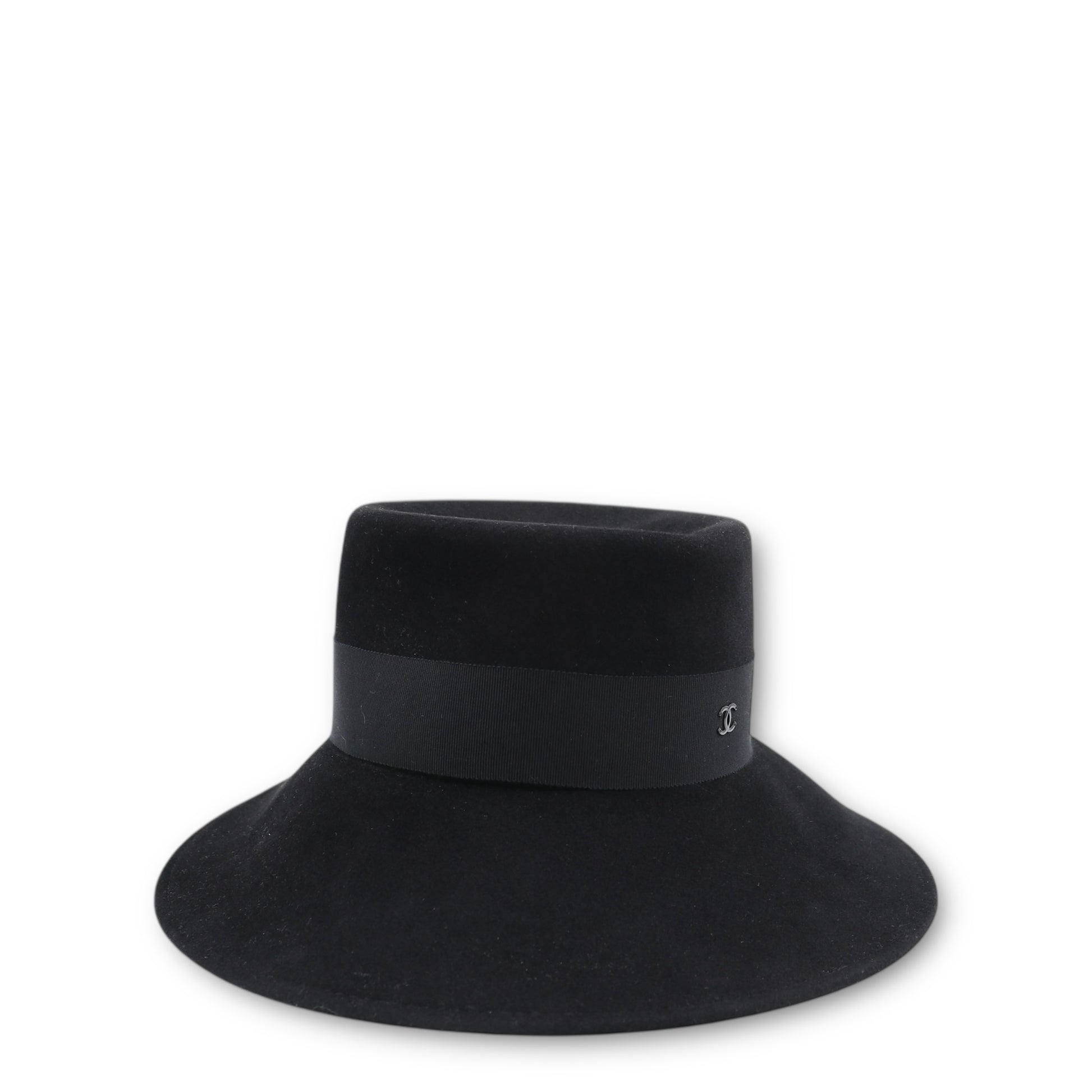 Der Hut besticht durch seine moderne, klar definierte Form mit einer leicht ausgestellten Krempe, die dem Design eine feminine und zugleich ausdrucksstarke Note verleiht. Ein schwarzes Ripsband um die Krone setzt einen stilvollen Akzent und wird durch ein dezentes CC-Logo veredelt – ein subtiler Hinweis auf die ikonische Handschrift des Hauses Chanel.