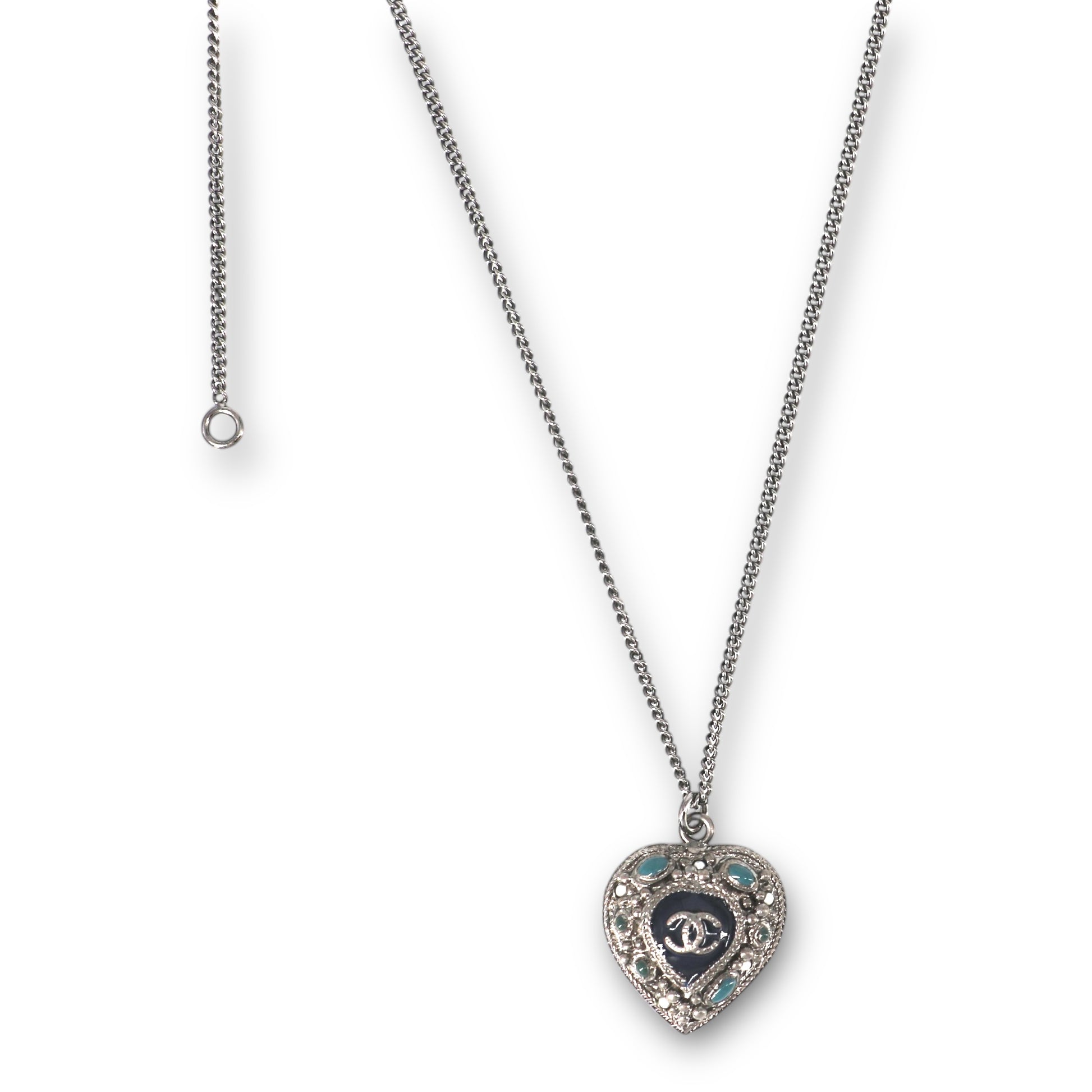 Diese zauberhafte Chanel Kette vereint feminine Eleganz mit ikonischem Luxus. Gefertigt aus Metall mit Ruthenium-Finish, zeigt sich das feine Design mit einem funkelnden Herz-Anhänger – verziert mit dem charakteristischen CC-Logo im Zentrum.