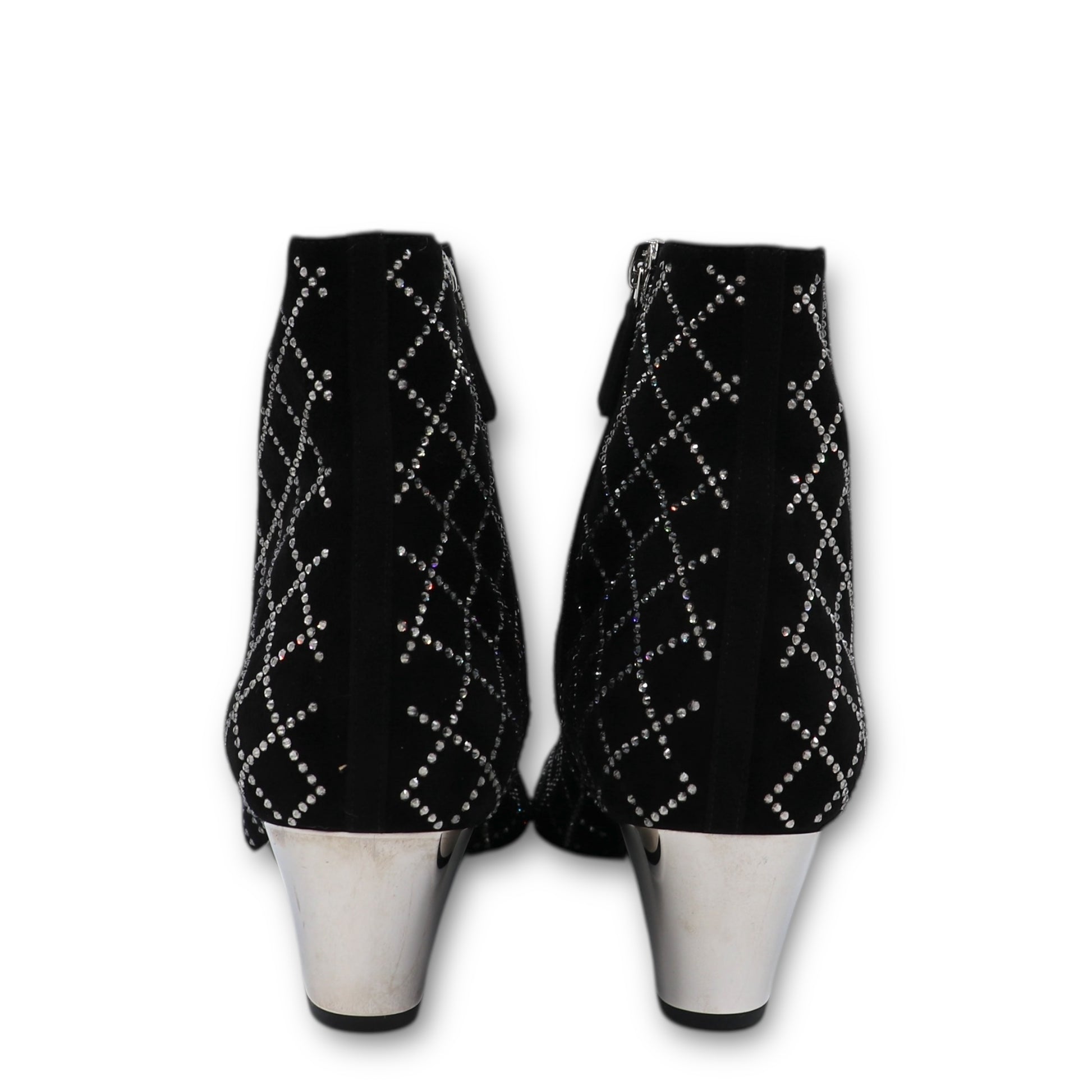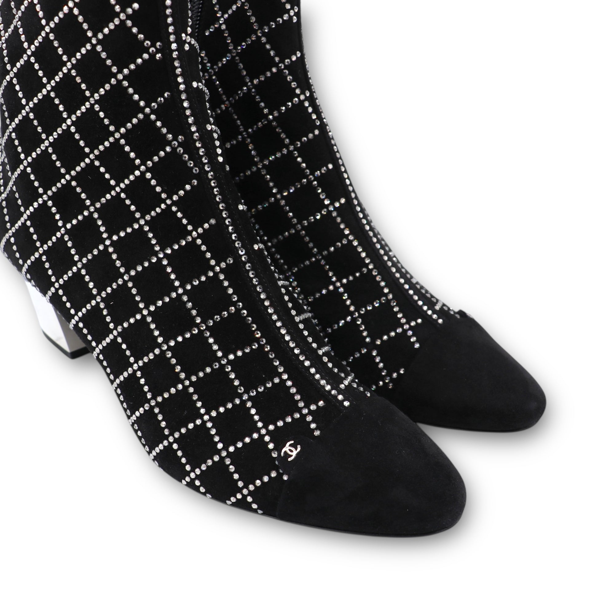 Diese exklusiven Chanel Stiefeletten vereinen glamouröse Eleganz mit ikonischer Handwerkskunst und sind ein echtes Highlight für jede Garderobe. Aus feinstem schwarzen Wildleder gefertigt, bestechen sie durch ihre luxuriöse Haptik und das aufwendige, funkelnde Design.