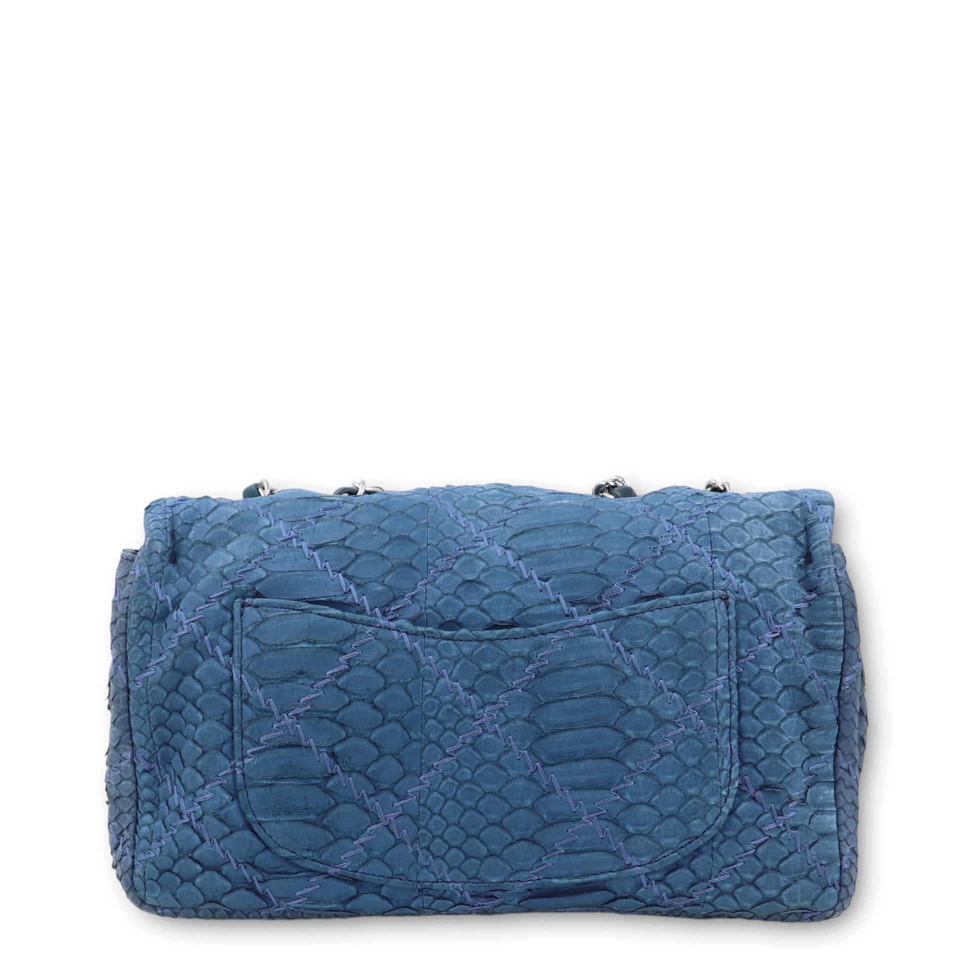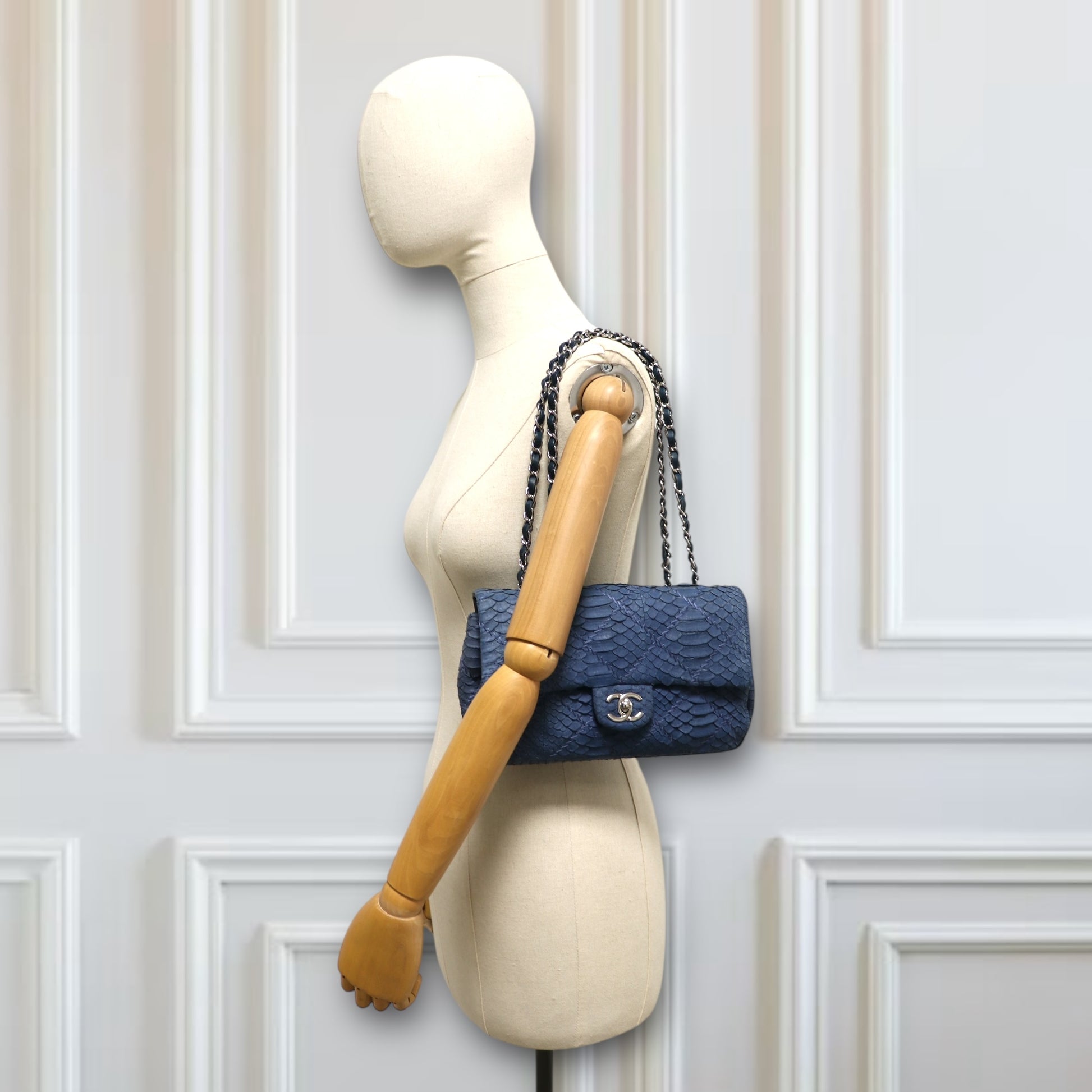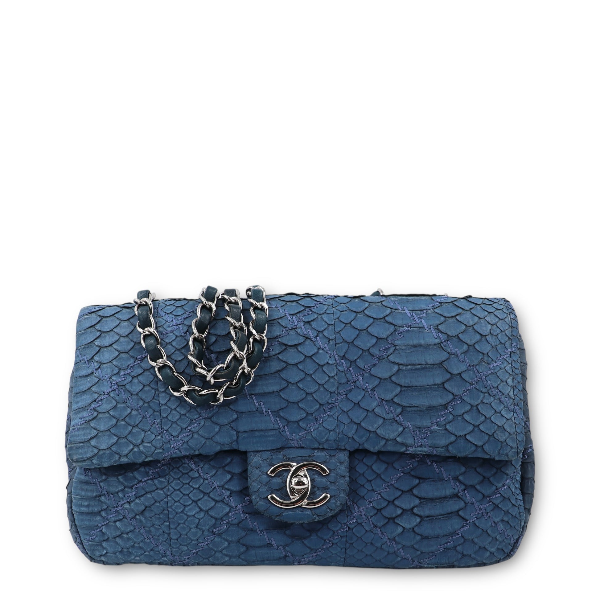 Diese Tasche aus blauem Pythonleder überzeugt mit der Ultra Stitch Steppung und einem silberfarbenen CC-Drehverschluss. Der Kettenriemen, der mit Leder durchzogen ist, kann sowohl einfach als auch doppelt getragen werden. Auf der Rückseite befindet sich zusätzlich ein flaches Einschubfach. Das Innenfutter aus blauem Satin ist in zwei Fächer unterteilt, eines davon bietet zusätzlich ein Innefach mit Reissverschluss für sicheren Stauraum.