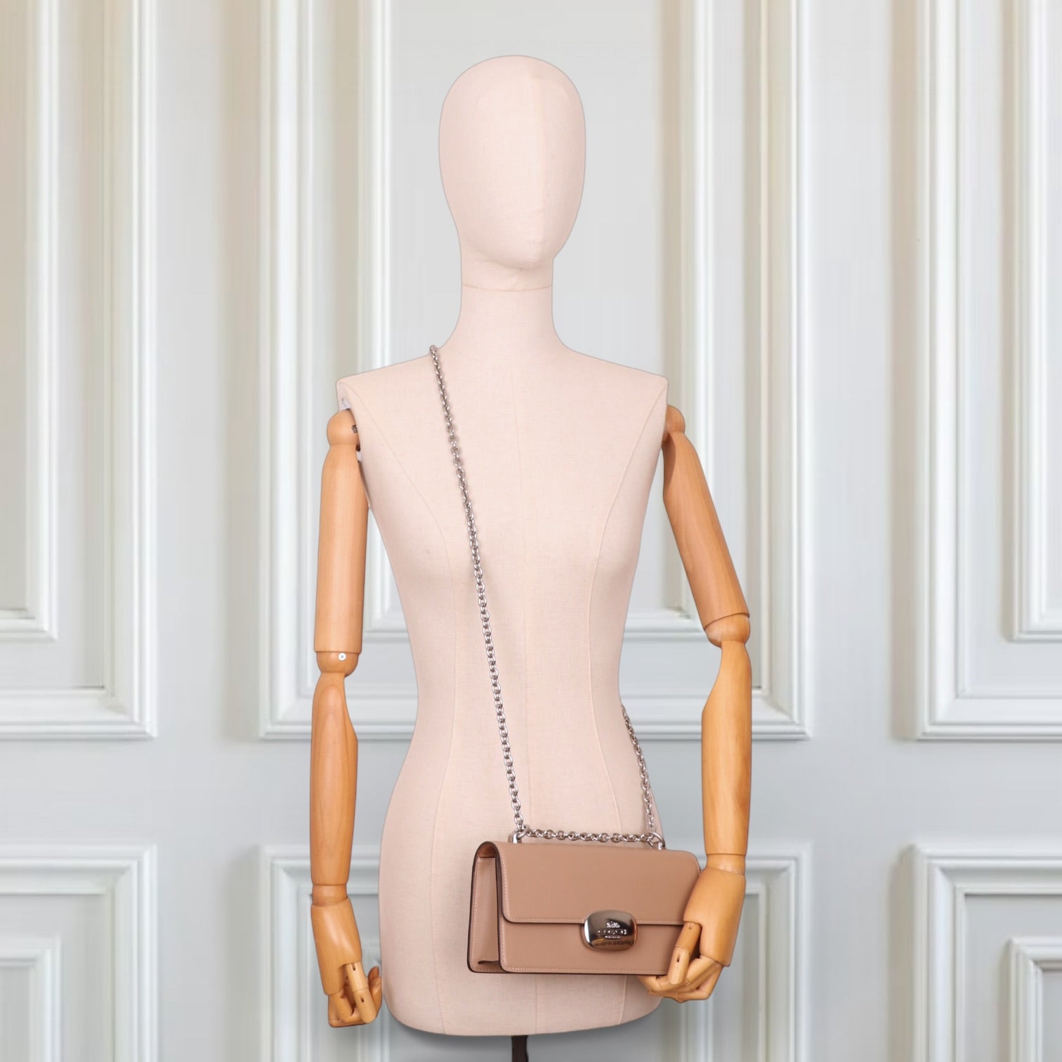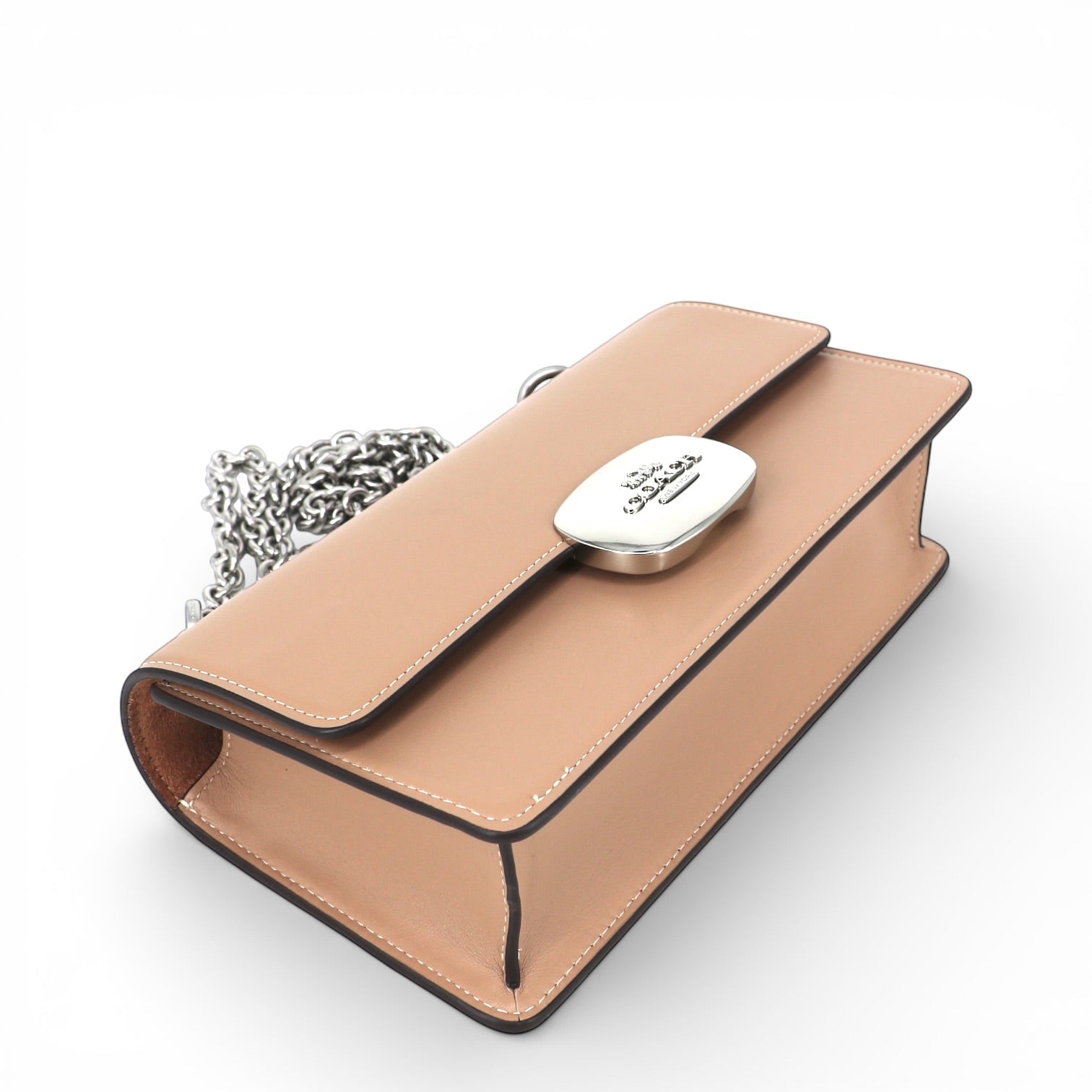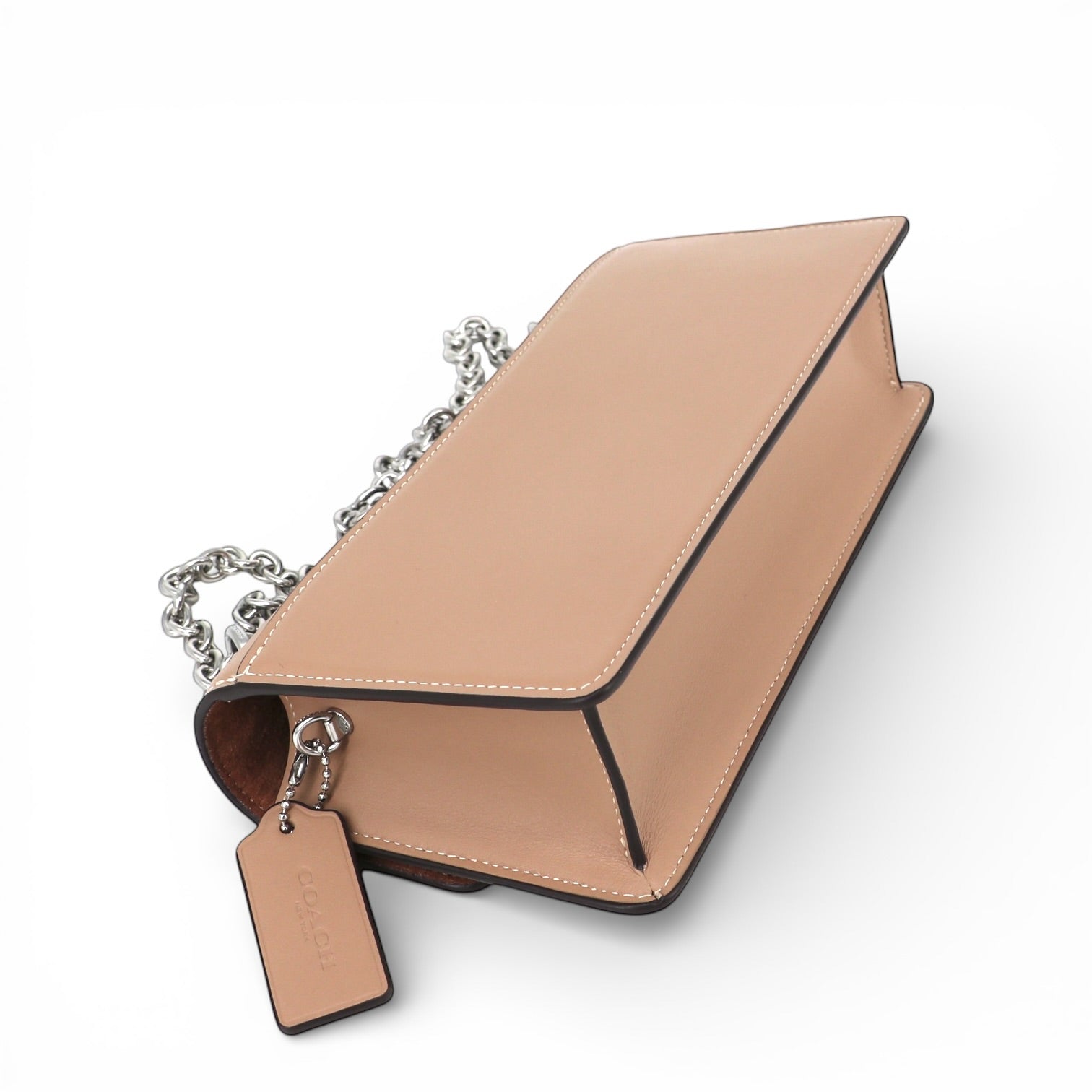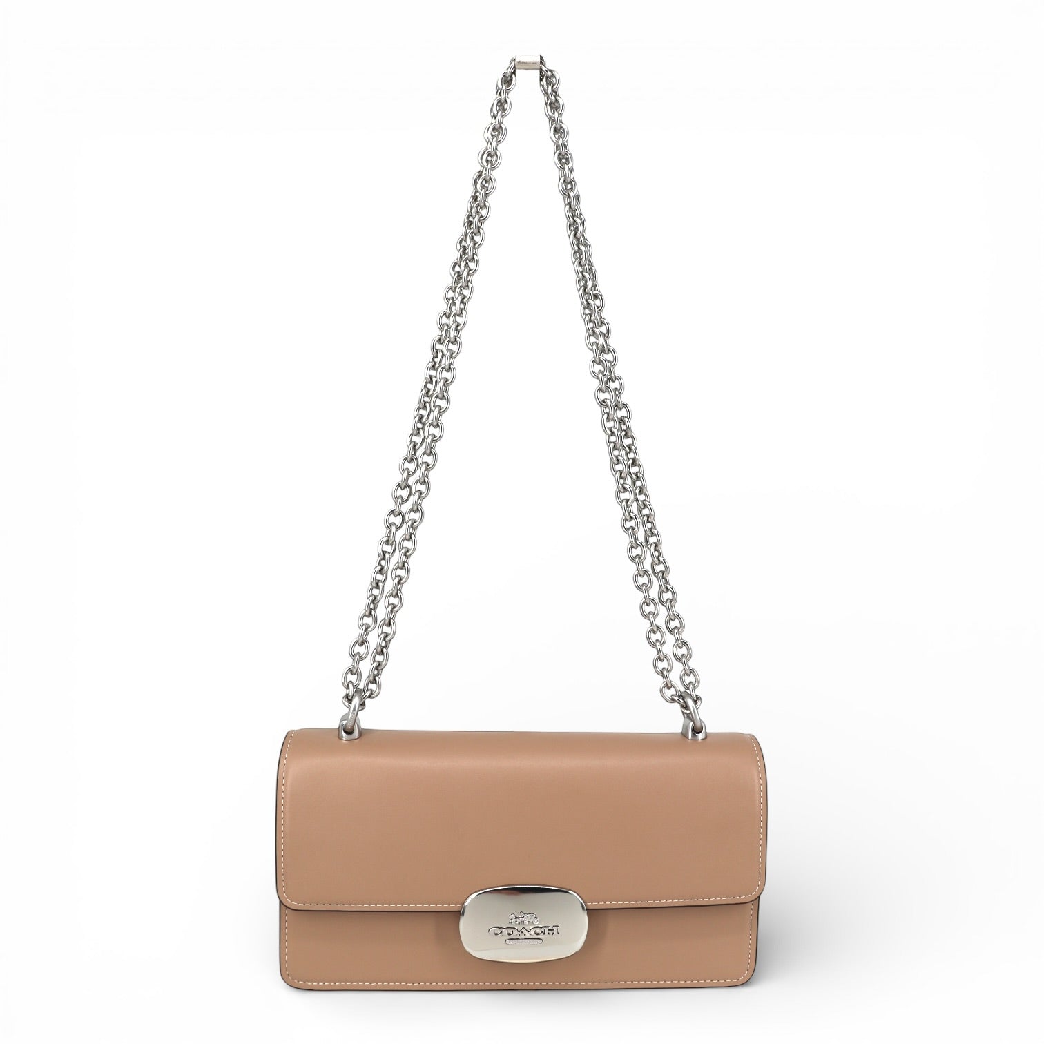 Ein besonderes Highlight ist die grosse, polierte silberfarbene Logo-Schliesse auf der Front, die das ikonische Coach-Branding trägt und dem Modell eine moderne, elegante Note verleiht. Die massiven silberfarbenen Kettendetails sorgen für einen stilvollen Kontrast zum warmen Leder.