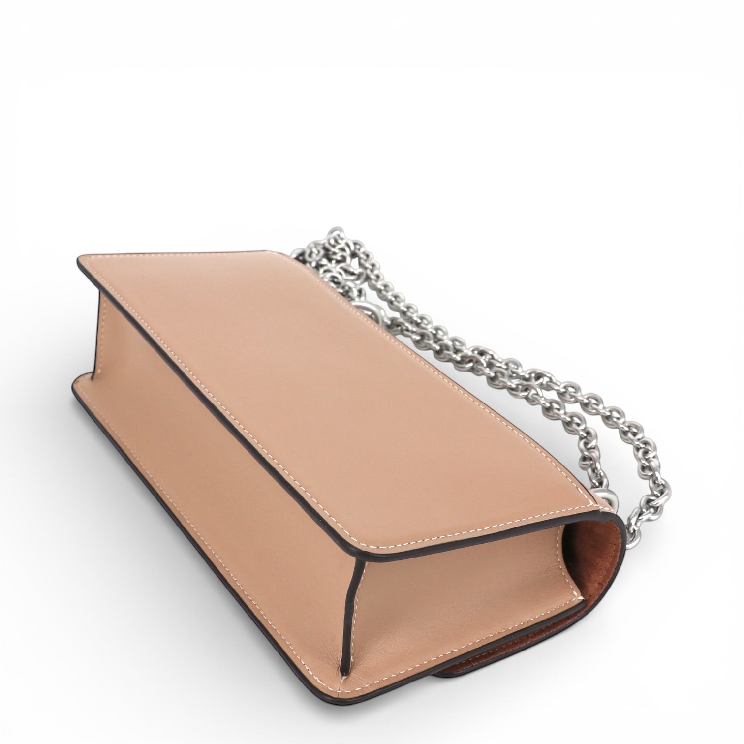 Gefertigt aus hochwertigem, glattem hellbraunem Leder, überzeugt die Tasche durch ihre minimalistische und zugleich luxuriöse Ausstrahlung. Die feinen Kontrastnähte unterstreichen die präzise Verarbeitung und setzen dezente Akzente entlang der klar definierten Silhouette.
