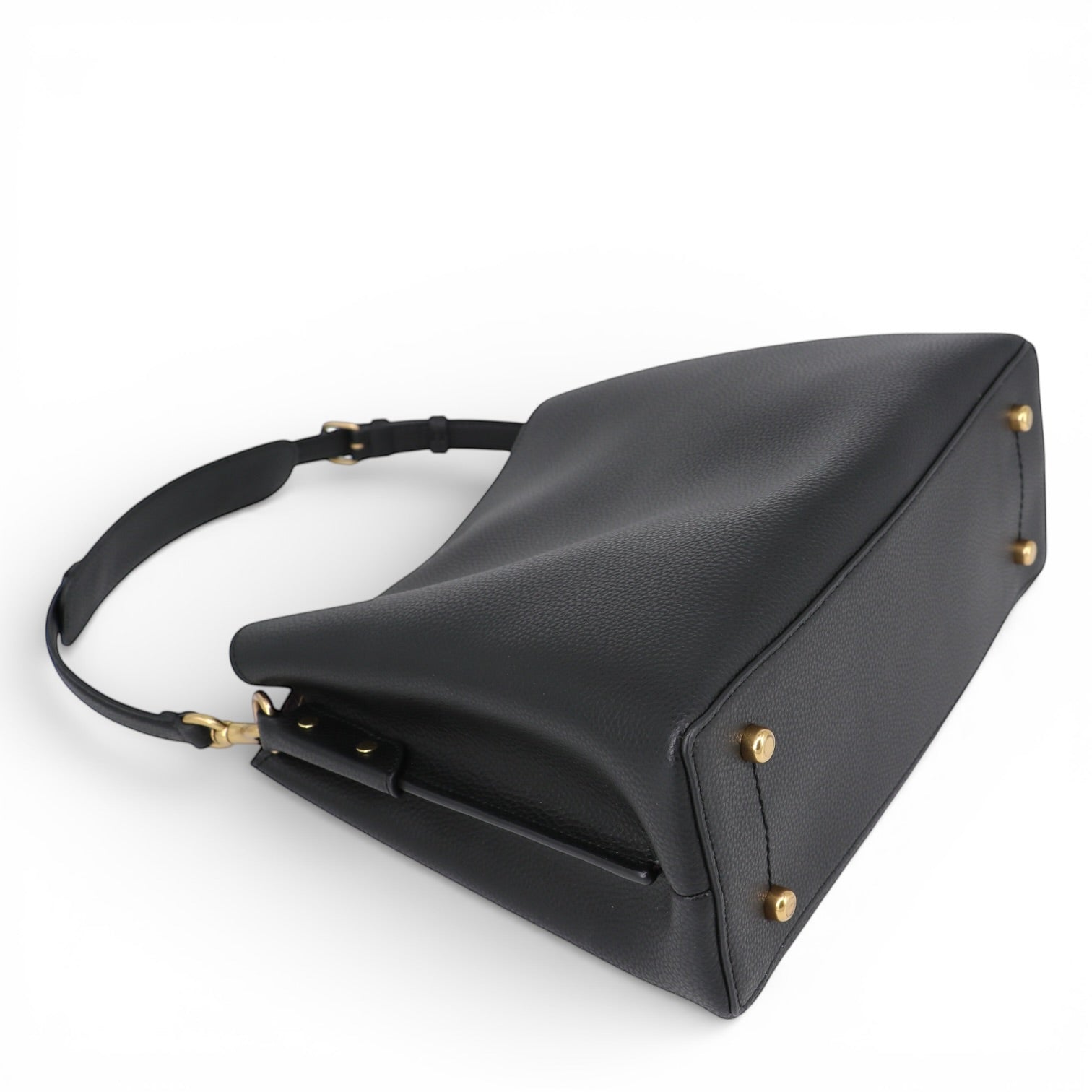 Gefertigt aus hochwertigem, fein genarbtem schwarzem Leder, überzeugt die Tasche durch ihre edle Haptik und ihre langlebige Qualität. Die strukturierte Form verleiht ihr eine moderne, selbstbewusste Silhouette, während das minimalistische Design vielseitig kombinierbar bleibt.