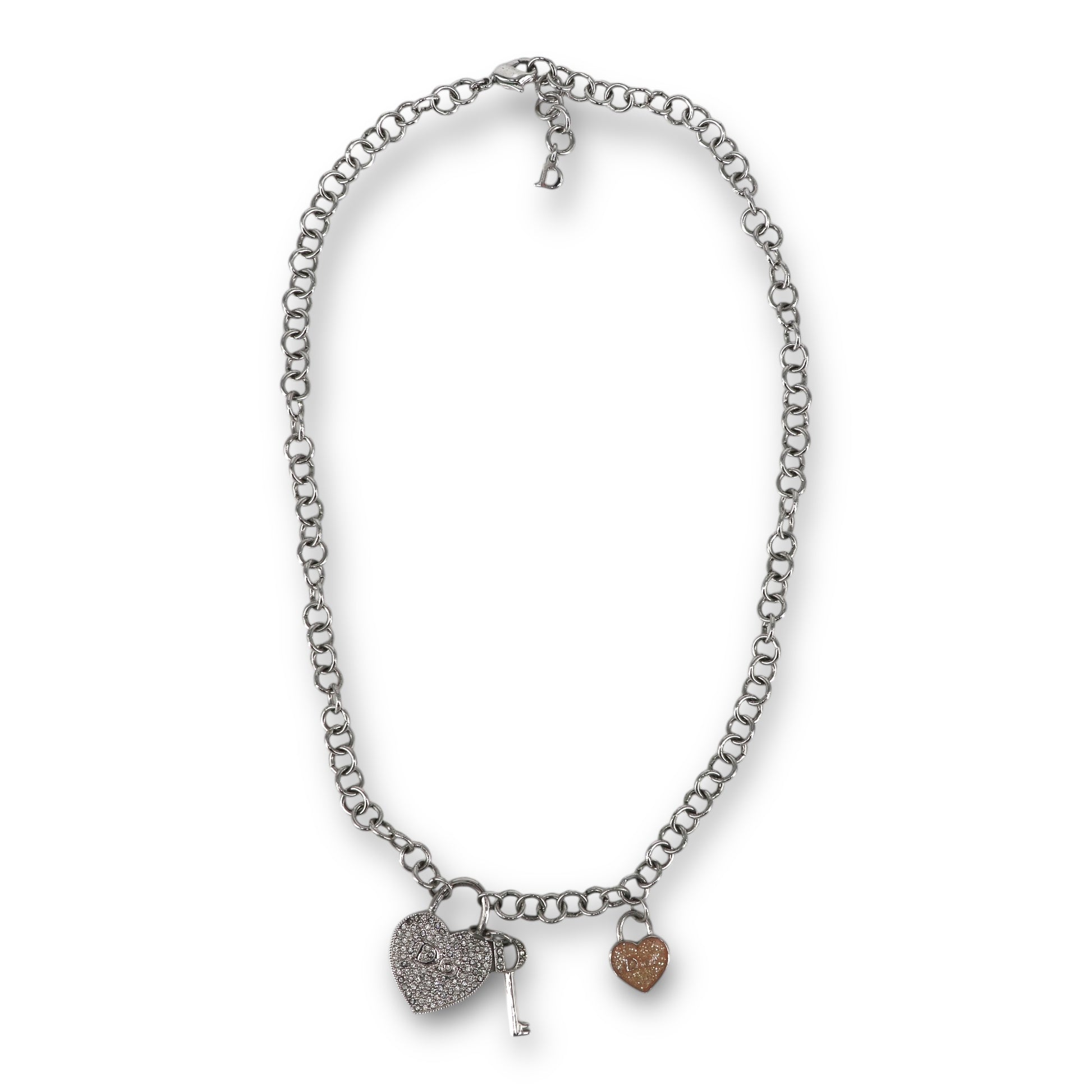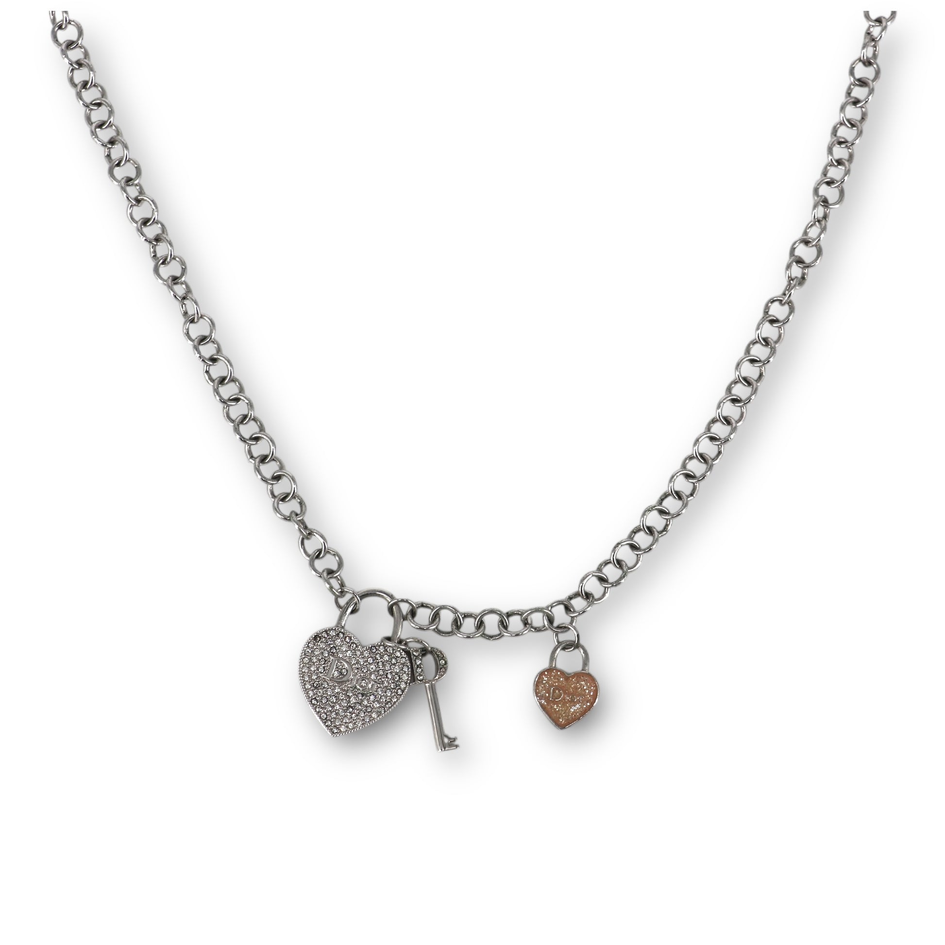 Diese edle Kette von Dior vereint feminine Raffinesse mit ikonischem Design. Gefertigt aus silberfarbenem Metall, präsentiert sie sich in einer markanten Gliederoptik und wird durch charmante Anhänger in Herzform veredelt – ein großer, funkelnd mit Kristallen besetzter Anhänger mit passendem Schlüssel sowie ein kleiner, goldfarbener Herzanhänger setzen luxuriöse Akzente.