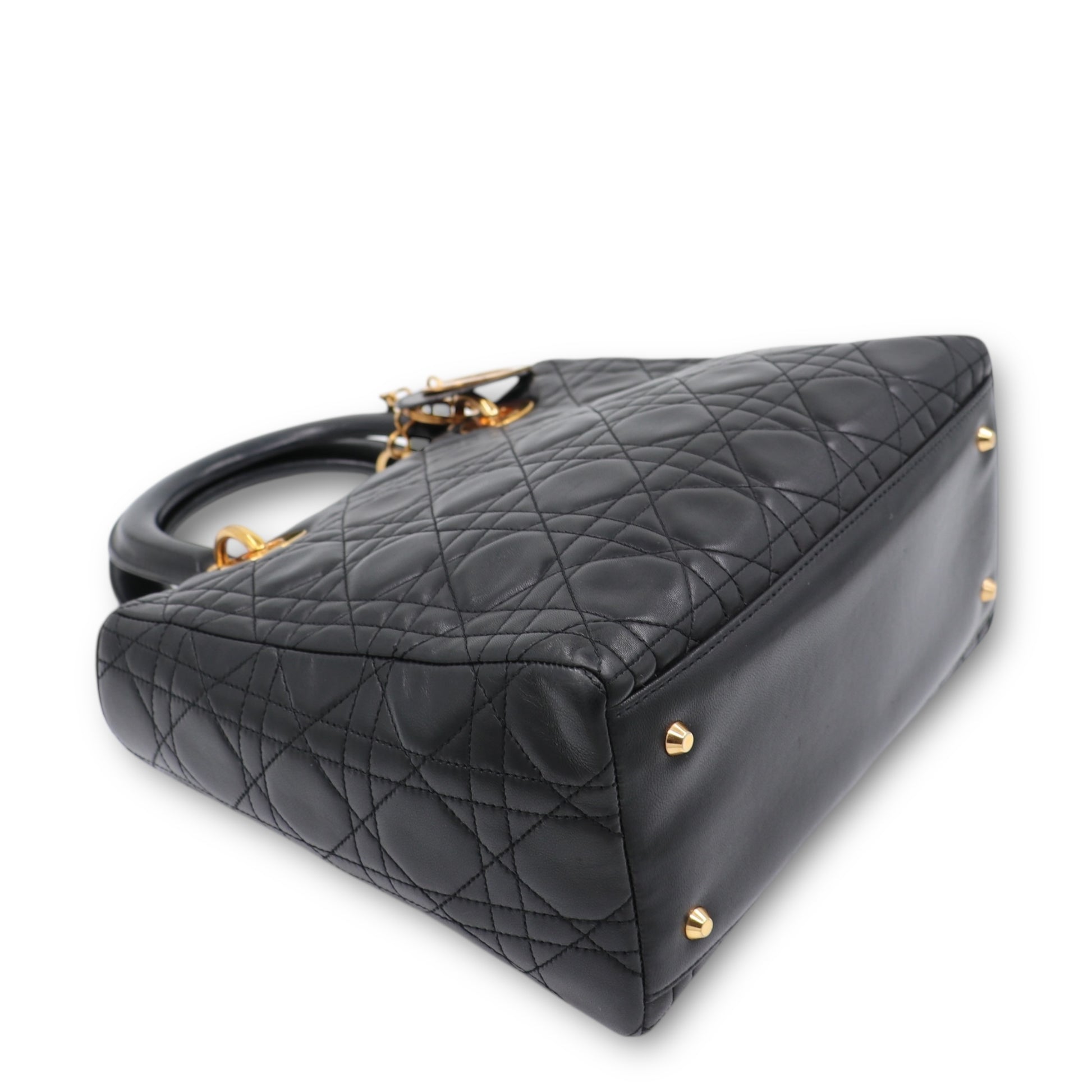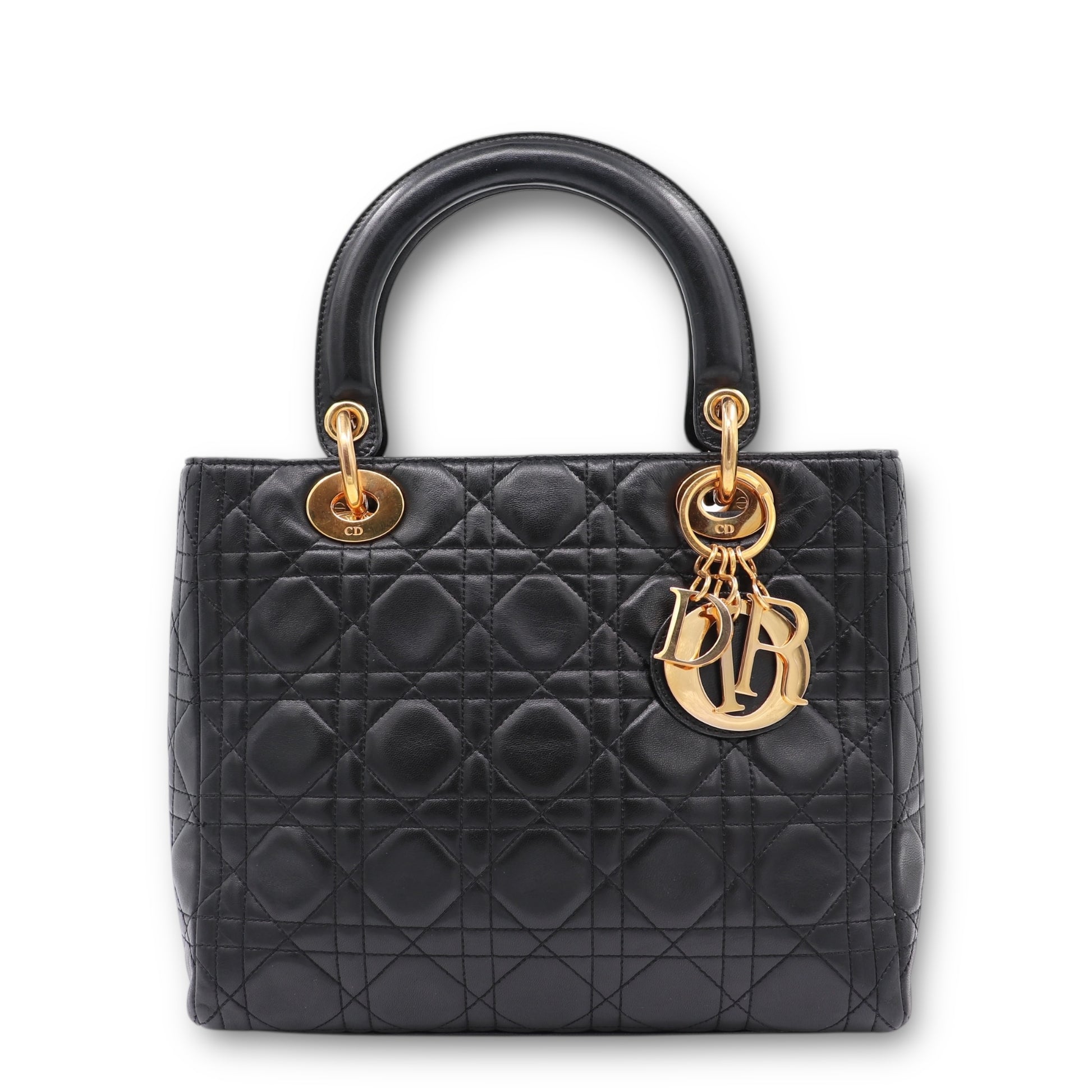 Diese ikonische Lady Dior Medium verkörpert zeitlose Eleganz und höchste Handwerkskunst. Gefertigt aus edlem, schwarzem Leder, präsentiert sich die Tasche mit der charakteristischen Cannage-Steppung, die für die Lady Dior Linie unverkennbar ist und ihr eine luxuriöse, strukturierte Optik verleiht.