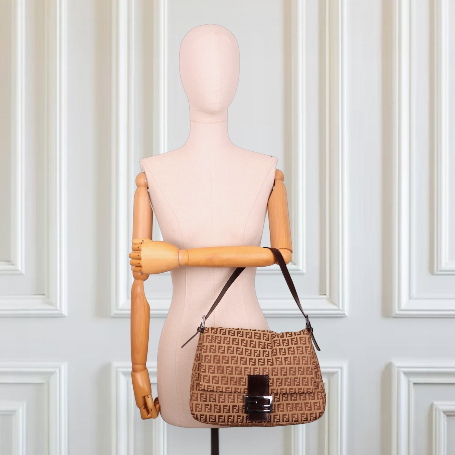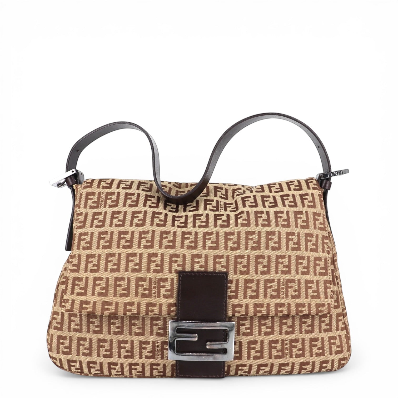 Die Tasche ist aus dem ikonischen Zucchino-Textil gefertigt, das mit dem typischen FF-Logomuster von Fendi versehen ist. Die Kombination aus beigem Grundton und braunen Logos verleiht der Tasche einen klassischen und gleichzeitig modernen Look.
