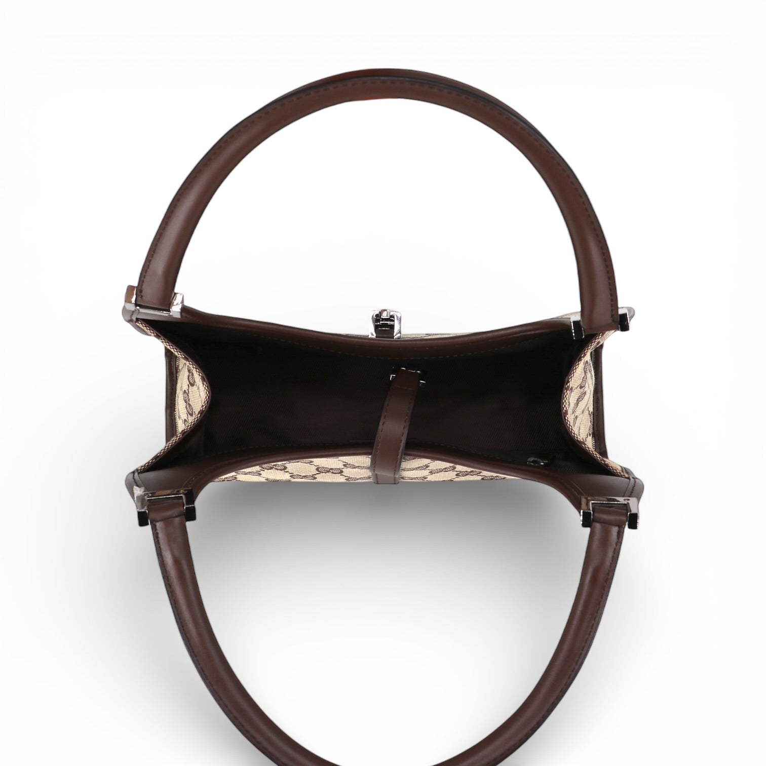 Die silberfarbenen Metallbeschläge setzen moderne Akzente und bilden einen stilvollen Kontrast zu den warmen Braun- und Beigetönen.