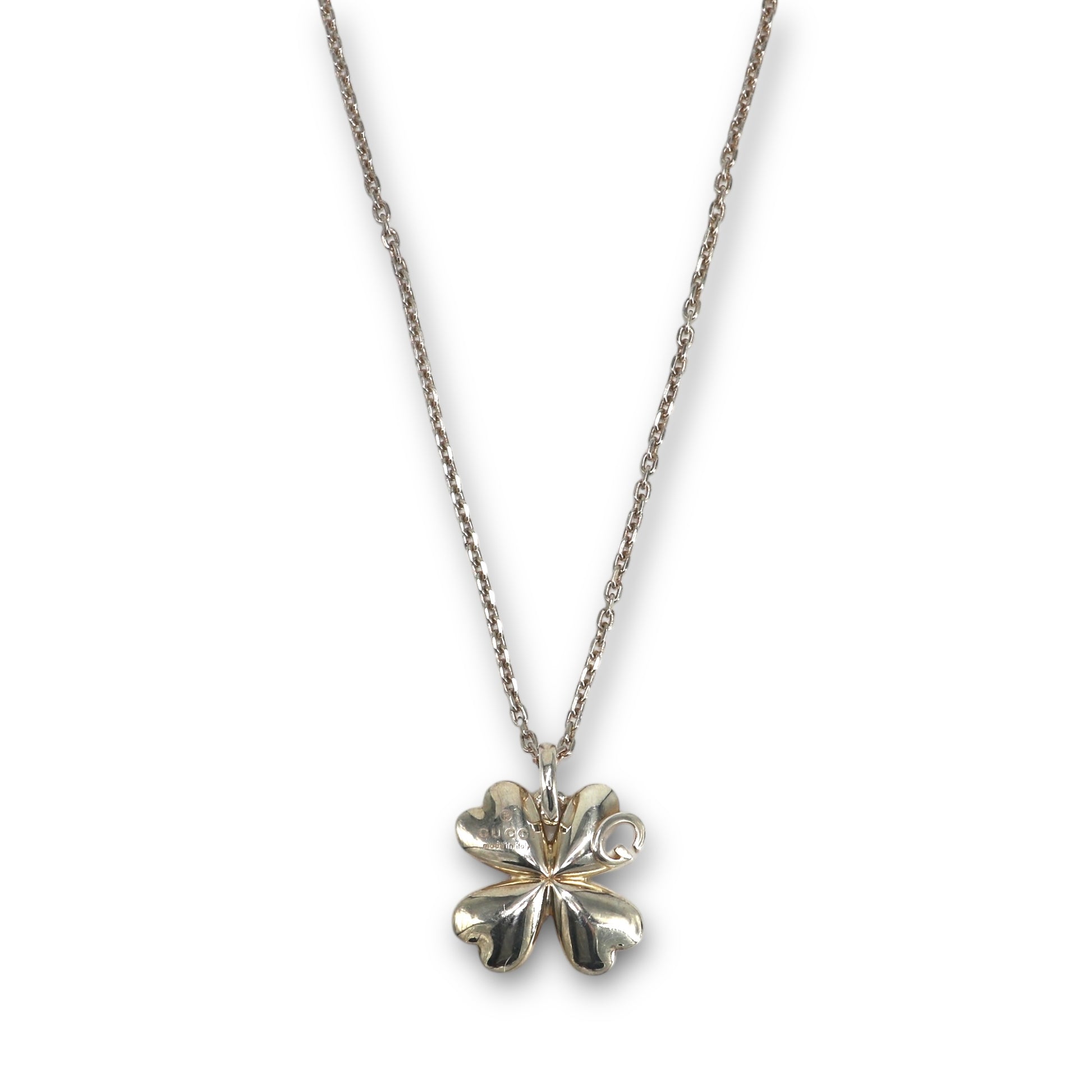 Diese elegante Gucci Halskette besticht durch ihren zeitlosen Charme und filigrane Handwerkskunst. Gefertigt aus hochwertigem 925er Sterling Silber, ziert sie ein wunderschöner Kleeblatt-Anhänger – ein Symbol für Glück und Stilbewusstsein.