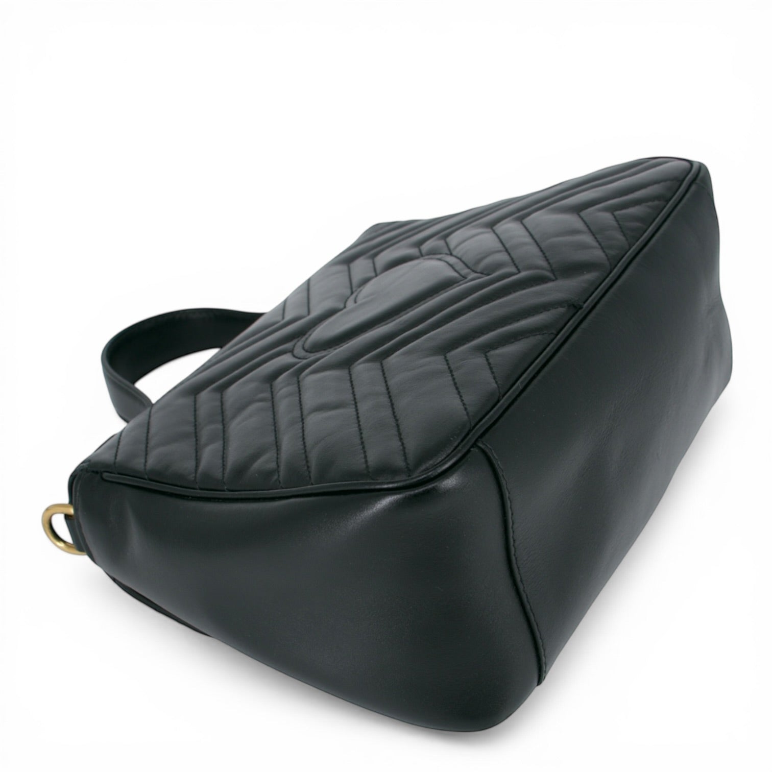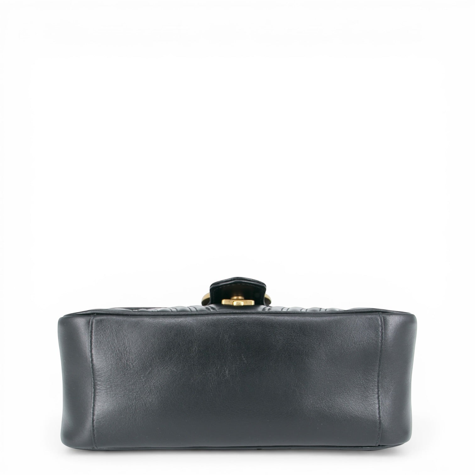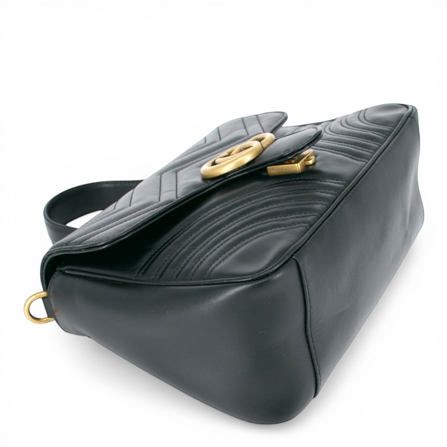 Auf der Vorderseite befindet sich das ikonische GG-Logo aus goldfarbenem Metall, das sofort für Wiedererkennungswert sorgt und der Tasche eine luxuriöse Ausstrahlung verleiht. Die goldfarbenen Metallbeschlägeharmonieren perfekt mit dem schwarzen Leder und setzen edle Akzente.