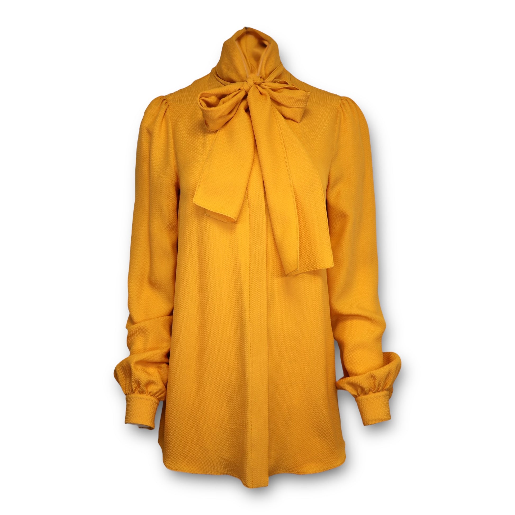 Der leuchtend goldgelbe Farbton setzt ein ausdrucksstarkes Statement und verleiht jedem Look eine warme, glamouröse Ausstrahlung. Charakteristisch für Guccis ikonischen Stil ist die auffällige Schleife am Hals, die dieser Bluse eine klassische, gleichzeitig aber moderne Note verleiht.