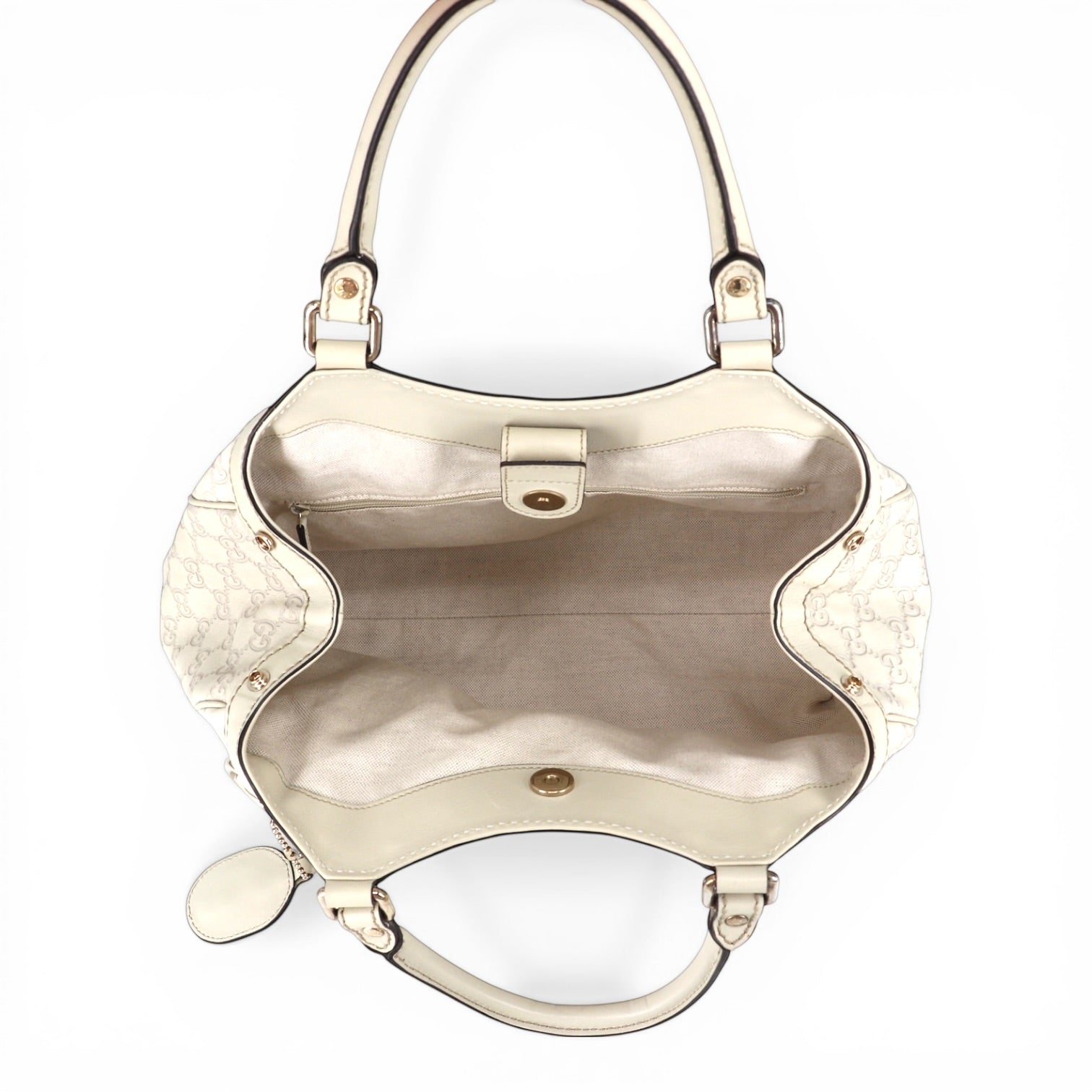 Die Tasche ist aus hochwertigem beigem Leder mit geprägtem GG-Monogramm gefertigt. Die dezente Logoeinprägung verleiht der Oberfläche eine elegante Struktur und sorgt gleichzeitig für eine klare Wiedererkennbarkeit der Marke.