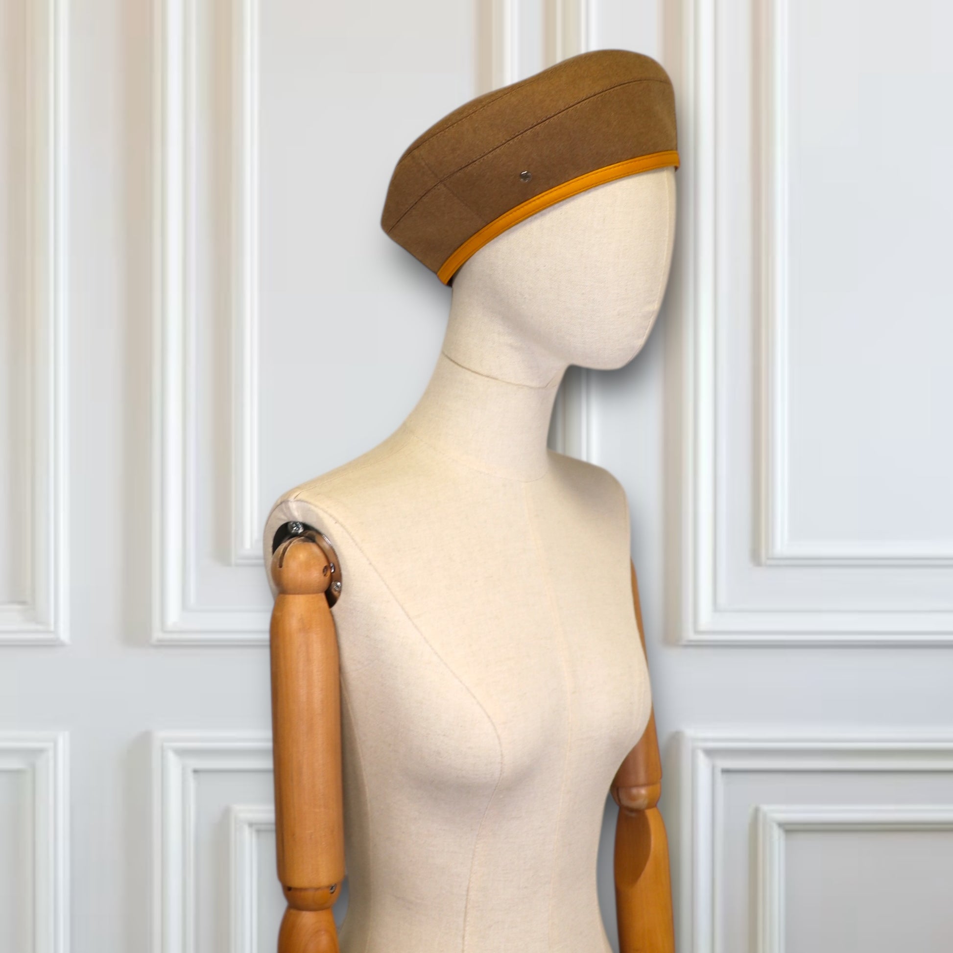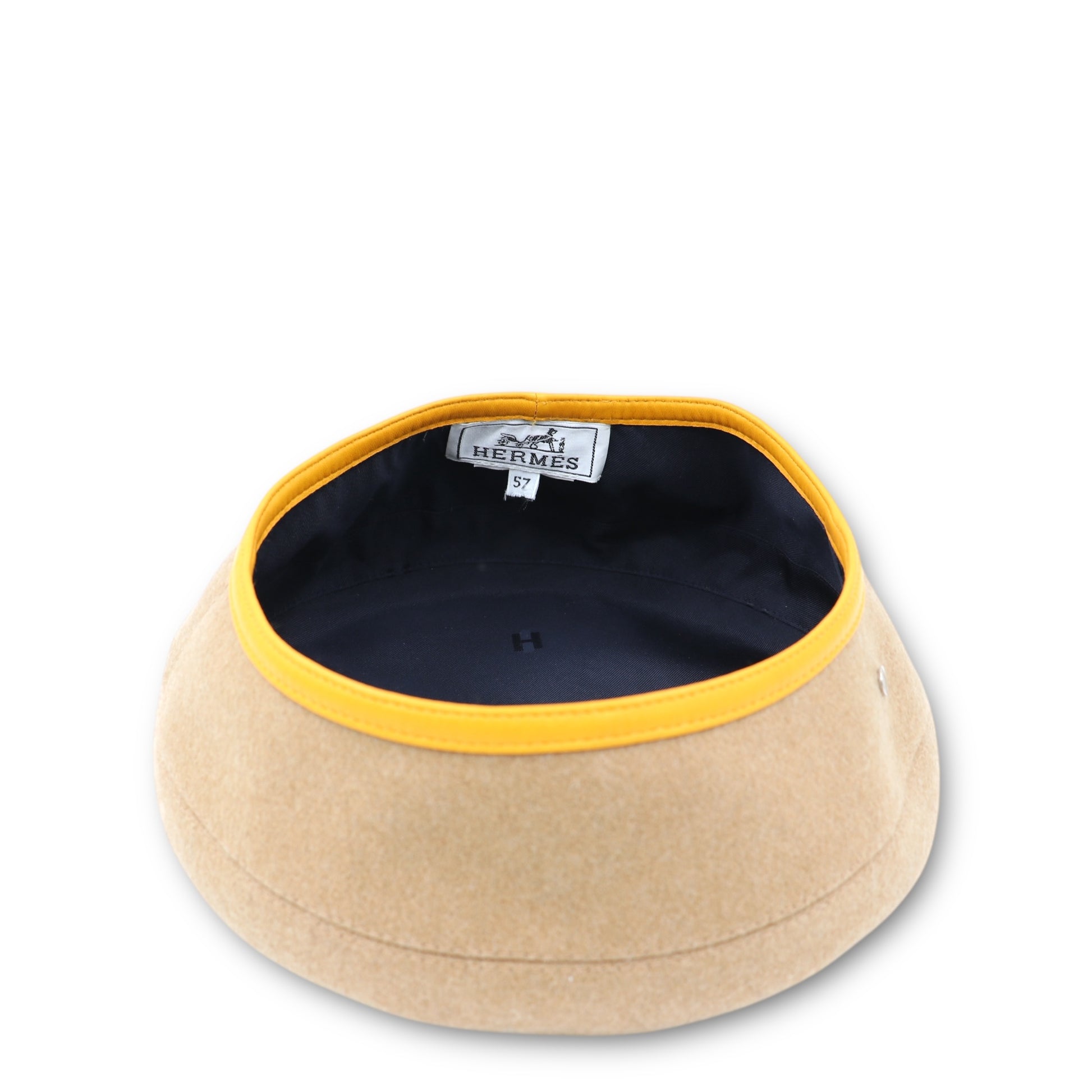 Ein charakteristisches Merkmal dieses Modells sind die Besätze aus feinem gelbem Kalbsleder, die dem klassischen Béret-Design eine moderne, luxuriöse Note verleihen. Der schmale Lederstreifen, der den unteren Rand akzentuiert, ist mit feinen Steppnähten versehen und setzt einen stilvollen Farbkontrast zum camelfarbenen Wollfilz. Eine dezente Metallniete unterstreicht die hochwertige Verarbeitung und fügt ein zurückhaltendes Signature-Detail hinzu.