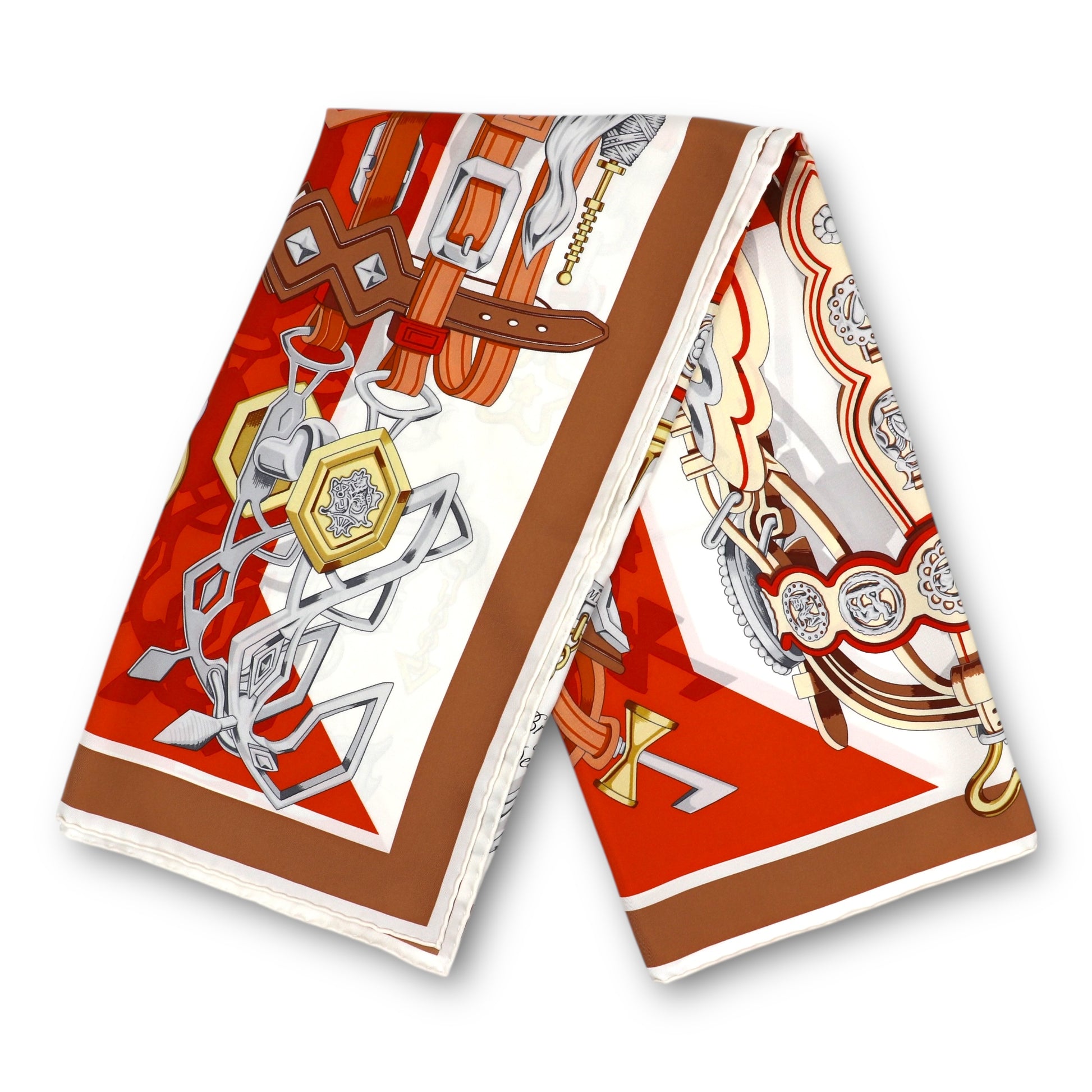 Die leuchtende orange Grundfarbe, kombiniert mit Nuancen in Weiss, Creme, Gold, Silber und warmen Brauntönen, verleiht dem Carré eine kraftvolle, zugleich klassische Ausstrahlung. Die kontrastreichen Farbflächen und die feine Linienführung sorgen für Tiefe, Struktur und eine eindrucksvolle visuelle Präsenz.