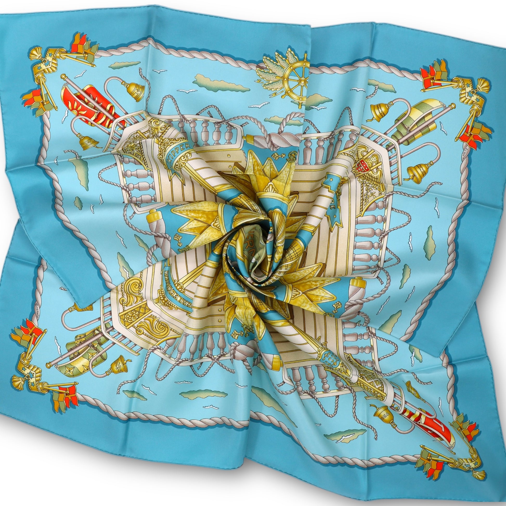 Im Mittelpunkt des Designs steht ein maritimes Emblem, umgeben von dekorativen Reling-Elementen, Seilen, Muscheln und nautischen Details. Goldene Akzente verleihen dem Carré eine luxuriöse Tiefe und erinnern an klassische Schiffsornamente. Der frische Blauton des Hintergrunds evoziert Himmel und Meer und bildet einen harmonischen Kontrast zu den warmen Gold- und Beigetönen des Motivs. Die symmetrische Anordnung und die präzise Linienführung unterstreichen die grafische Stärke dieses Modells.
