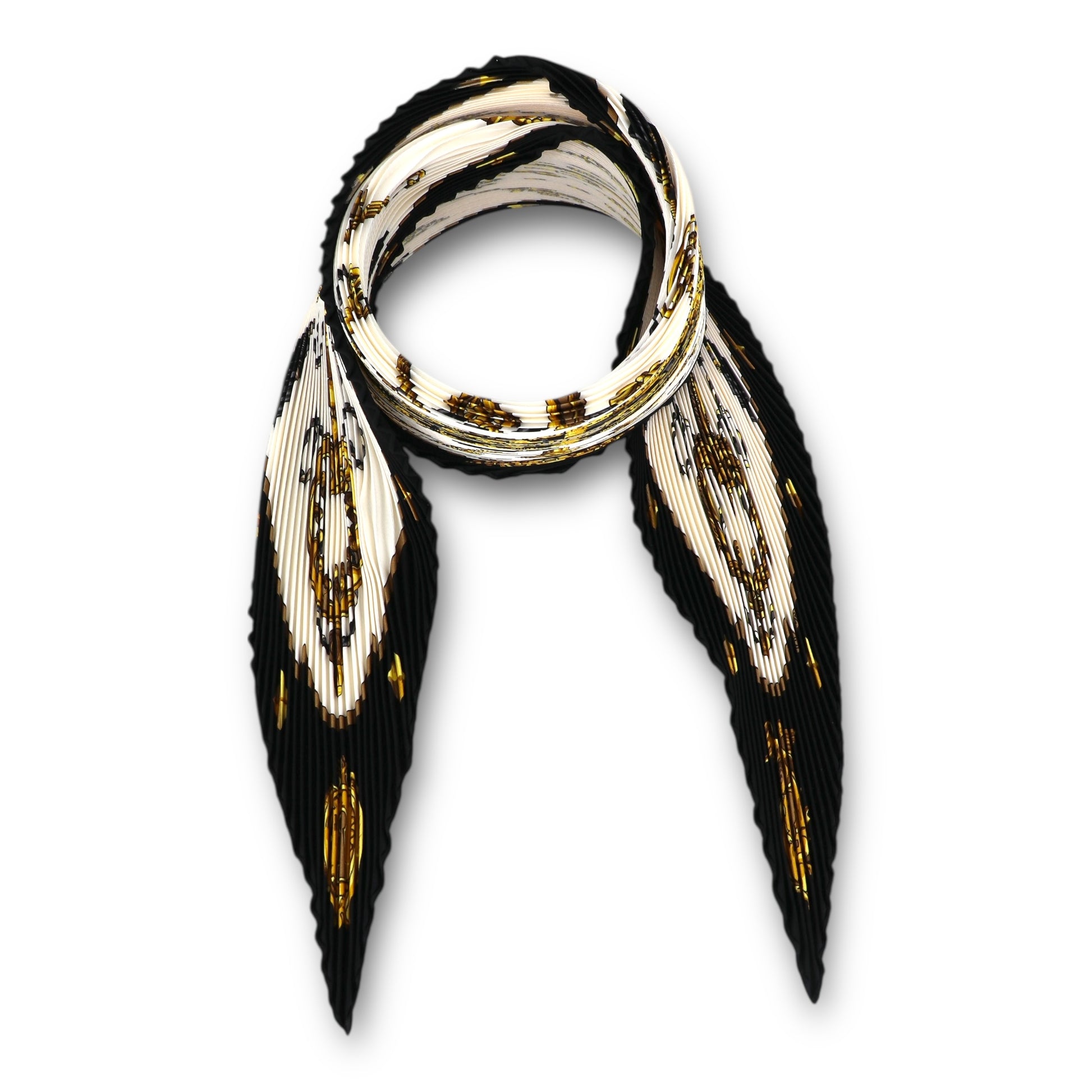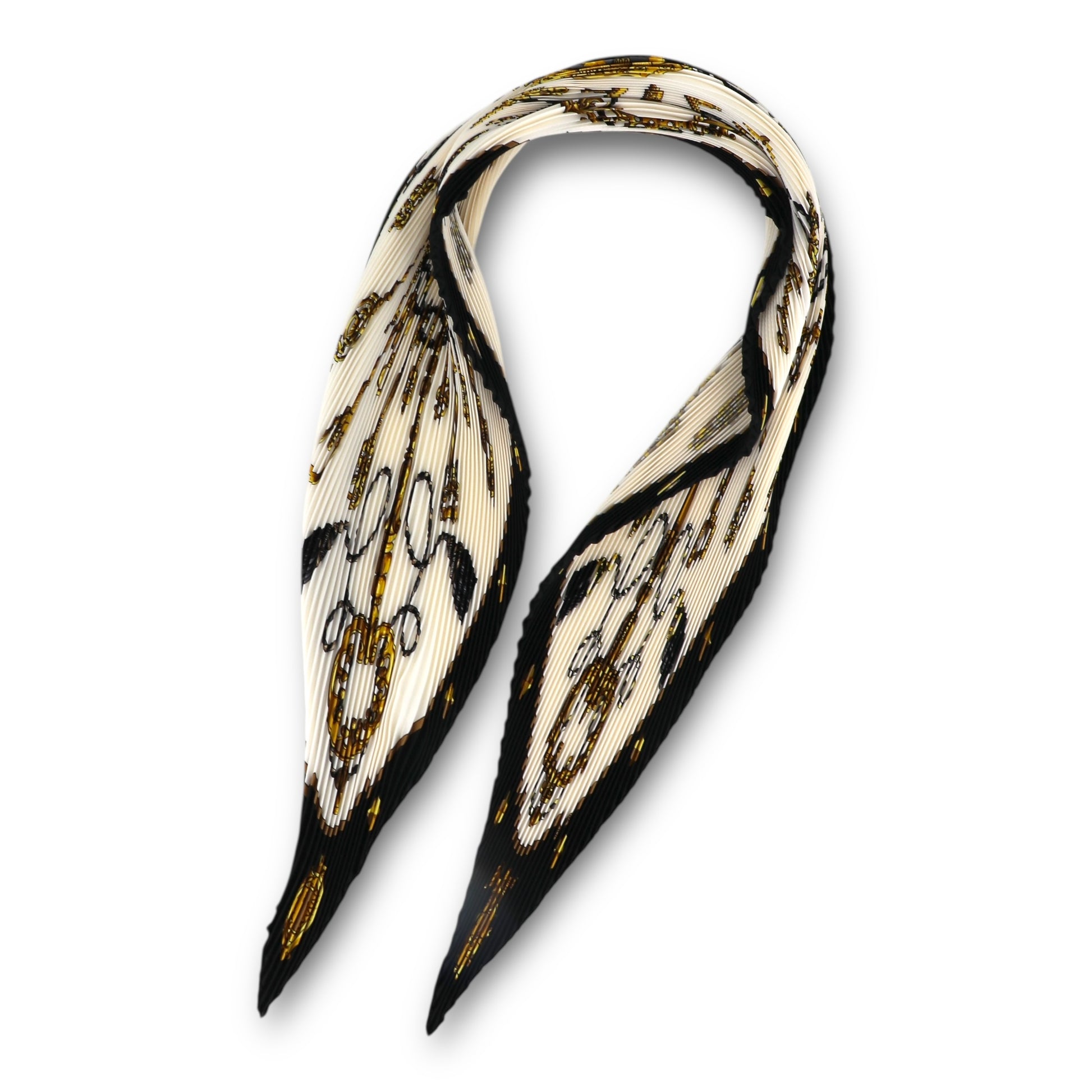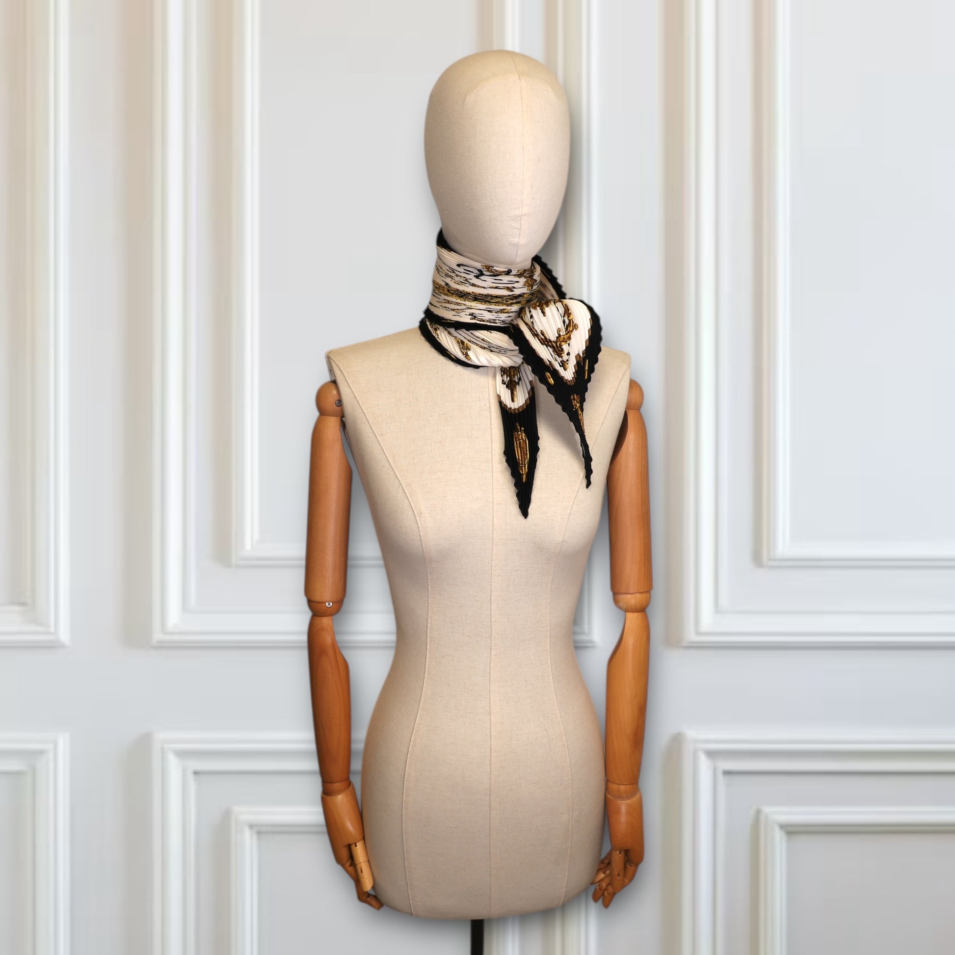 Dieses exquisite Hermès Seidentuch ist ein zeitloses Accessoire, das luxuriöse Handwerkskunst und klassische Eleganz vereint. Das plissierte Carré zeigt ein raffiniertes Design in Schwarz und Weiss, veredelt durch goldene Akzente, die dem Tuch einen edlen Glanz verleihen.