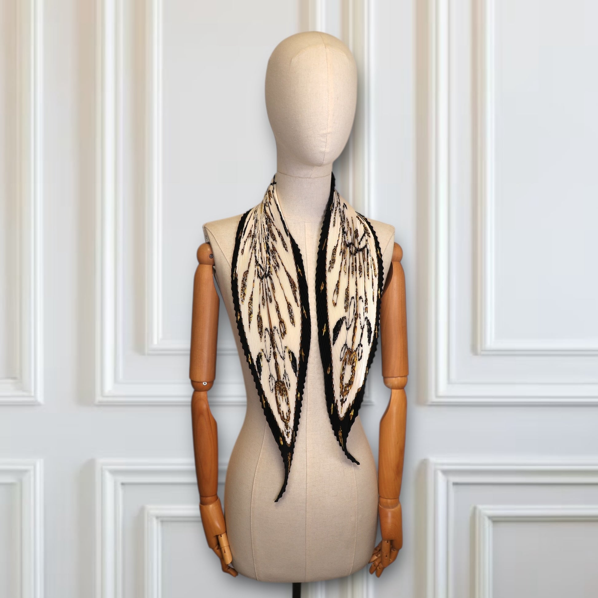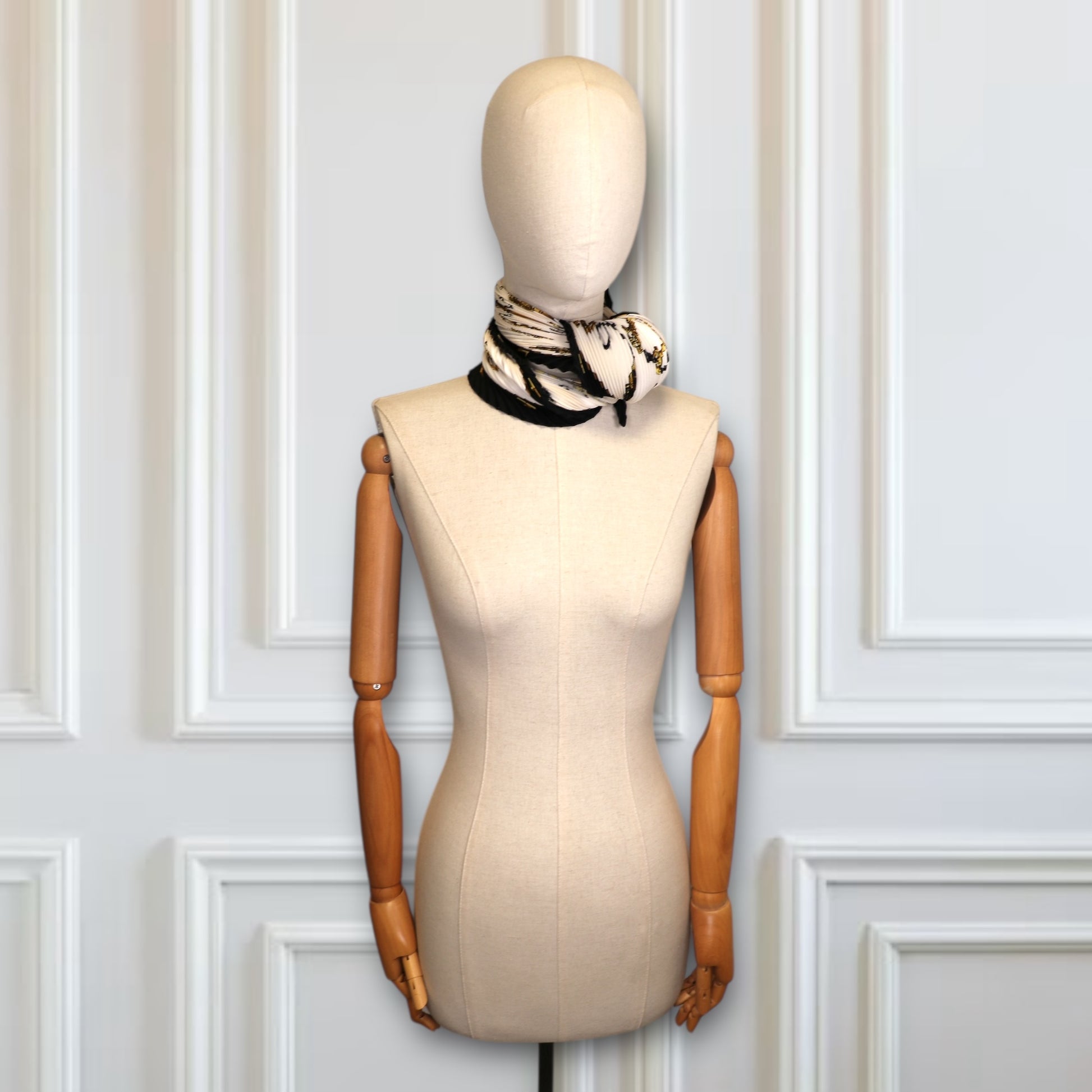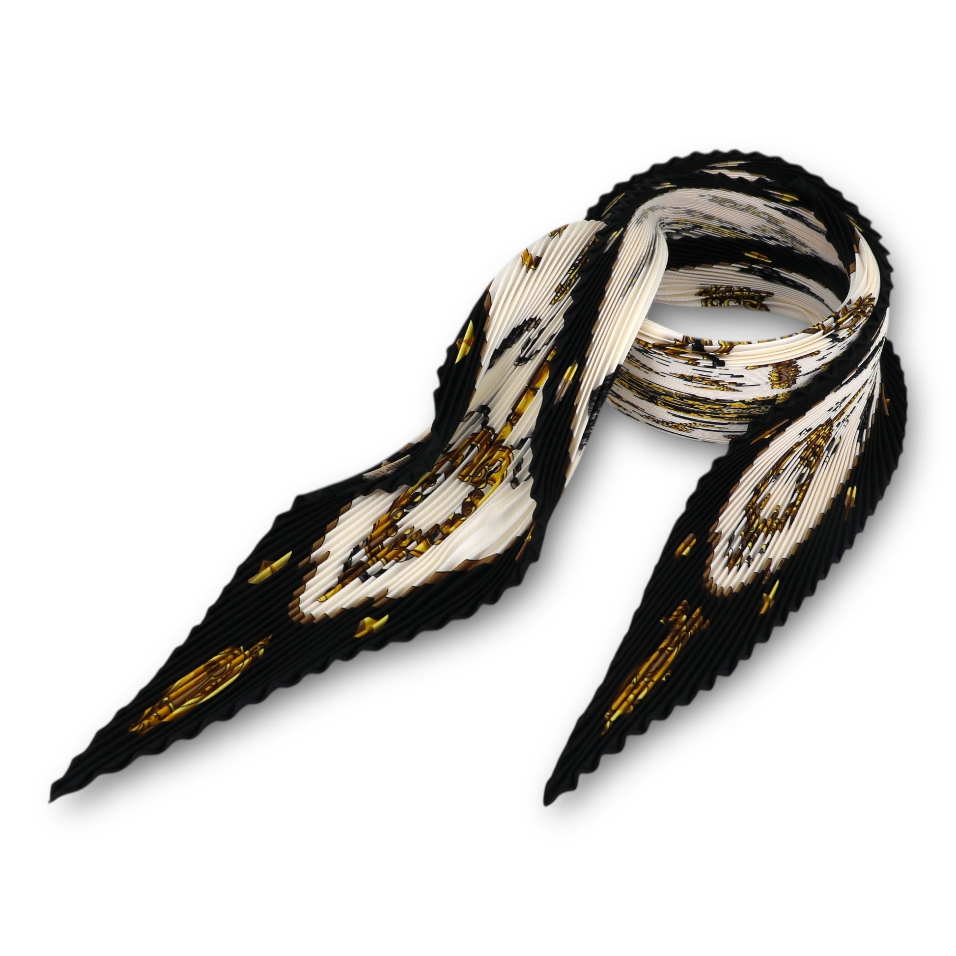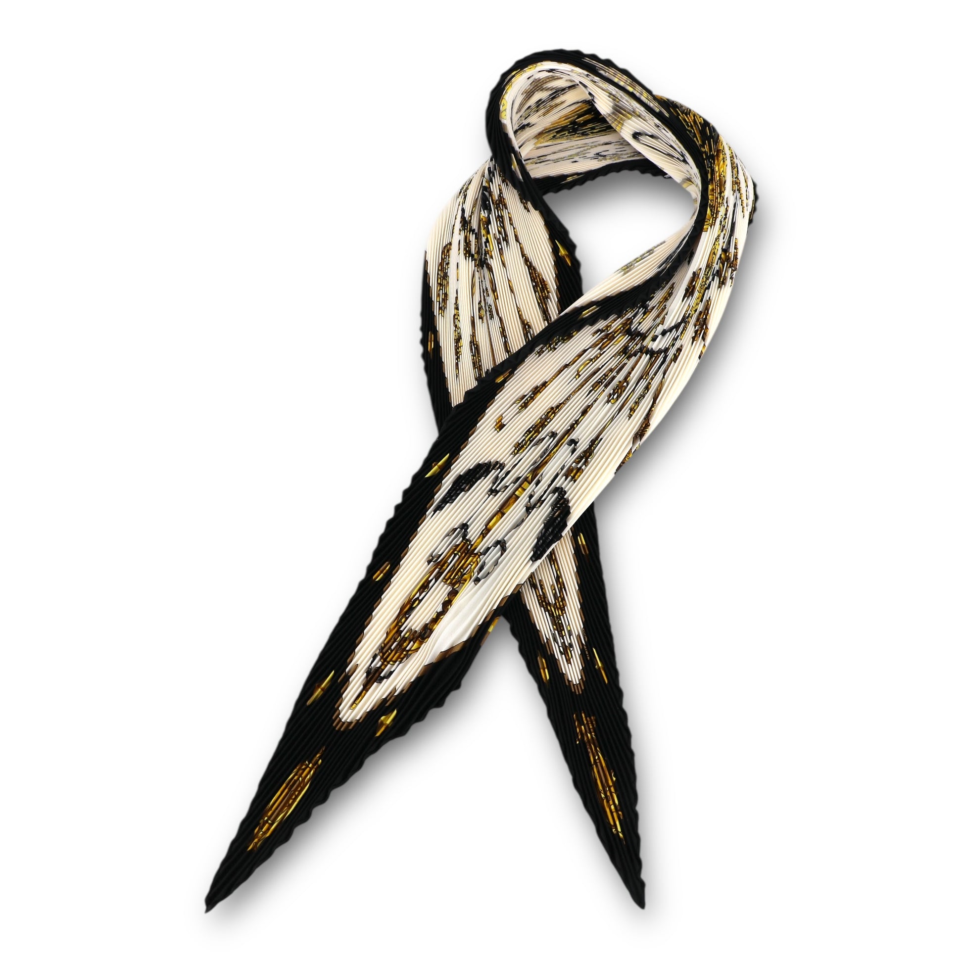 Dieses exquisite Hermès Seidentuch ist ein zeitloses Accessoire, das luxuriöse Handwerkskunst und klassische Eleganz vereint. Das plissierte Carré zeigt ein raffiniertes Design in Schwarz und Weiss, veredelt durch goldene Akzente, die dem Tuch einen edlen Glanz verleihen.