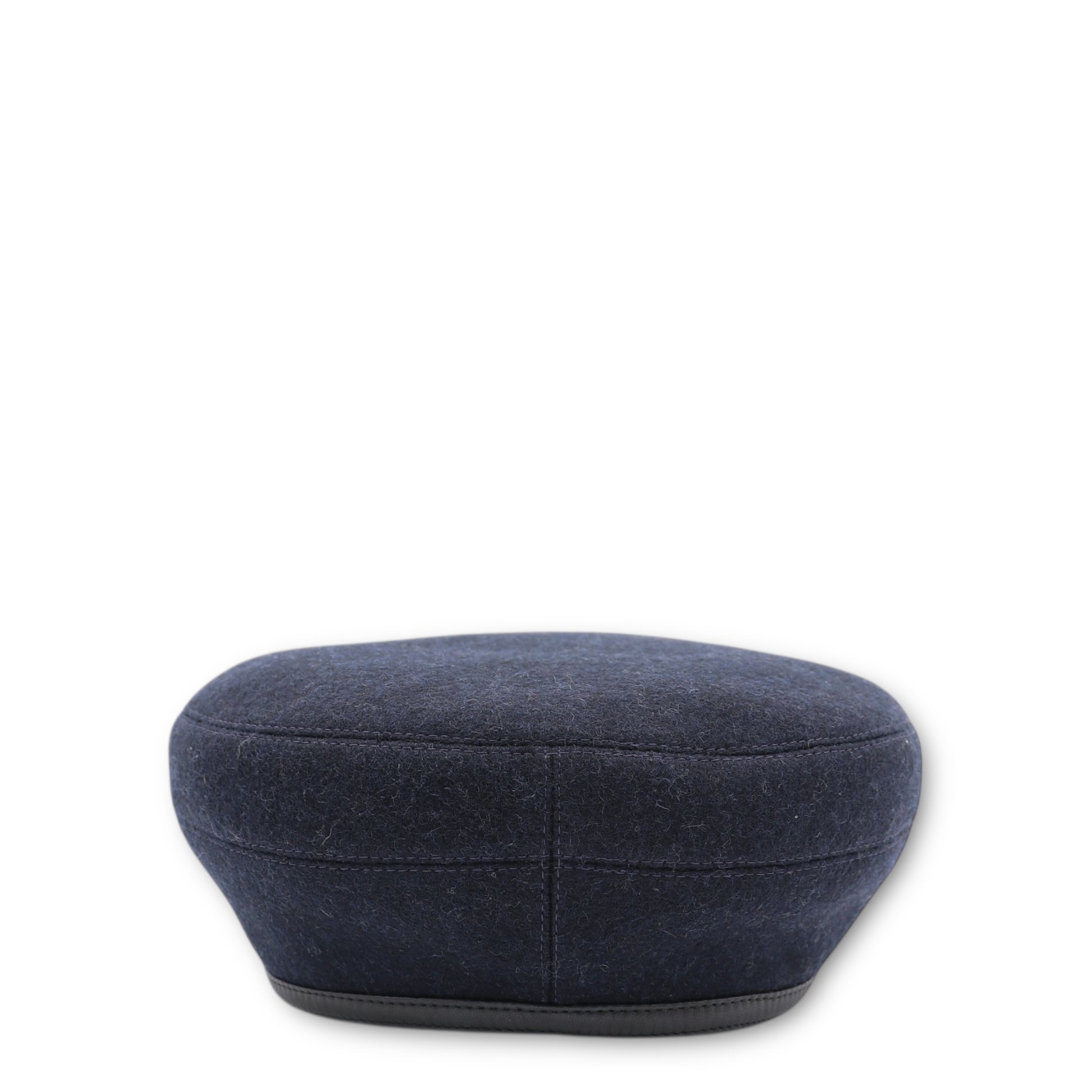 Ein charakteristisches Merkmal dieses Modells sind die Besätze aus feinem schwarzem Kalbsleder, die dem klassischen Béret-Design eine moderne, luxuriöse Note verleihen. Der schmale Lederstreifen, der den unteren Rand akzentuiert, ist mit feinen Steppnähten versehen und setzt einen stilvollen Farbkontrast zum marinefarbenen Wollfilz. Eine dezente Metallniete unterstreicht die hochwertige Verarbeitung und fügt ein zurückhaltendes Signature-Detail hinzu.