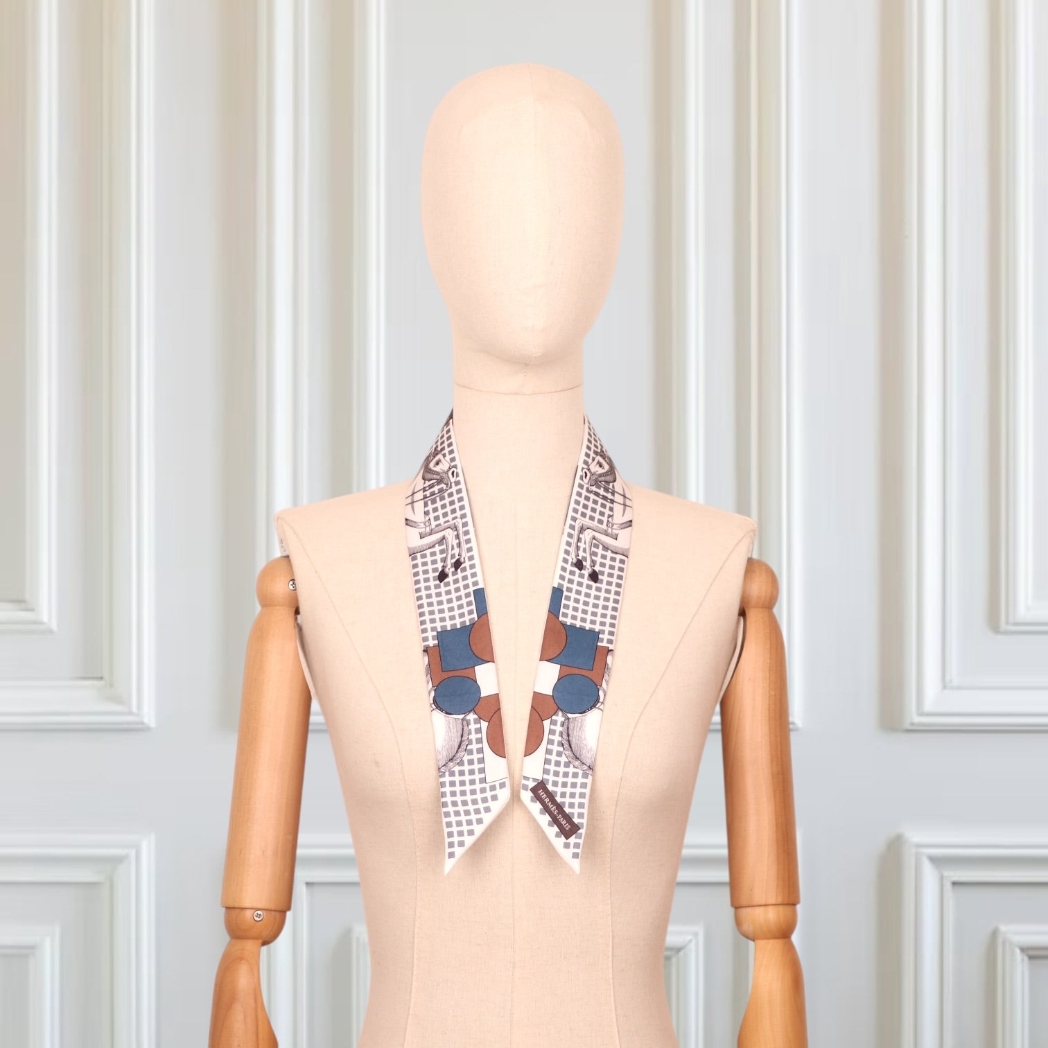 Kunstvoll, modern und unverkennbar Hermès: Das Twilly „Cavalier en Formes“ verbindet die ikonische Reitwelt der Maison mit grafischen, fast kubistischen Formen. Klassische Pferdemotive treffen auf geometrische Elemente wie Punkte, Raster und Farbflächen – eine spannende Komposition aus Tradition und Moderne.
