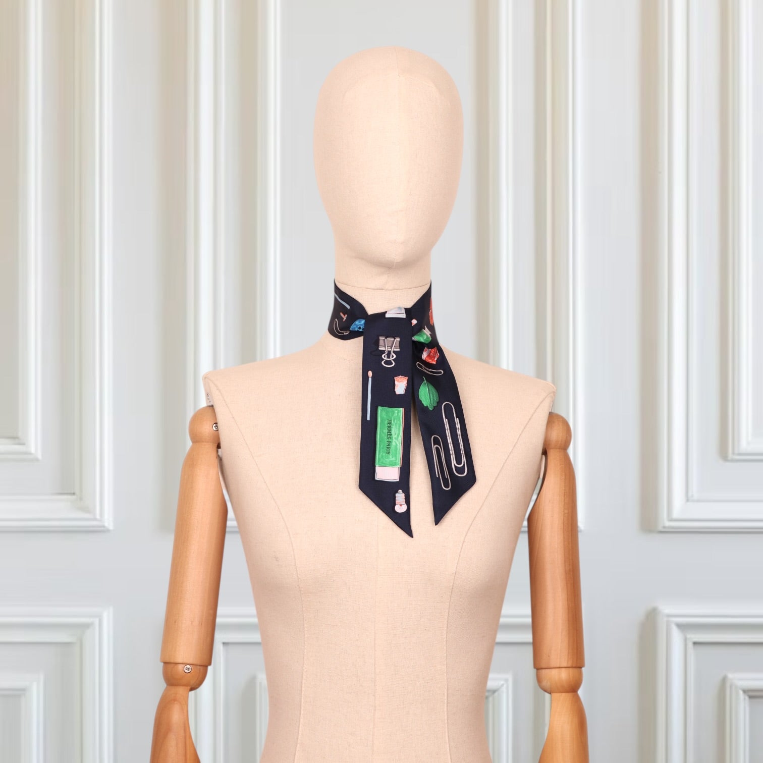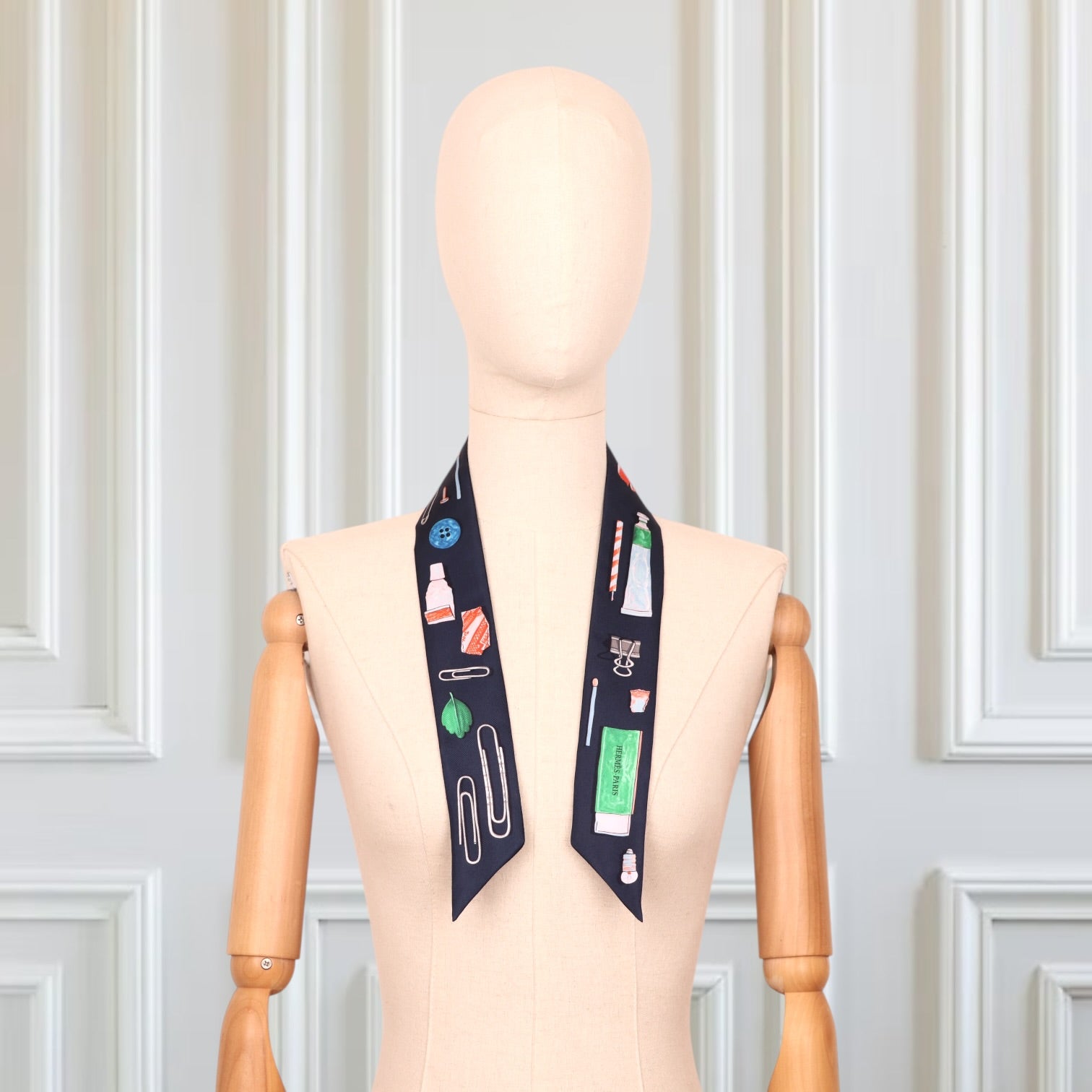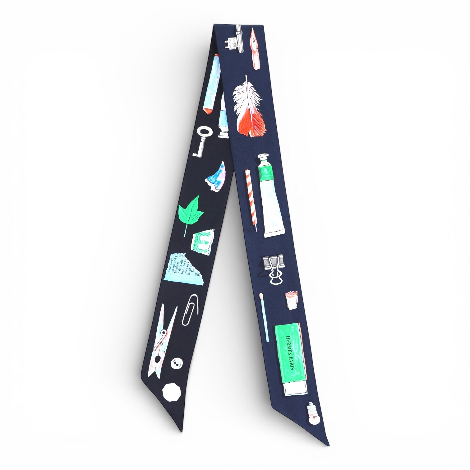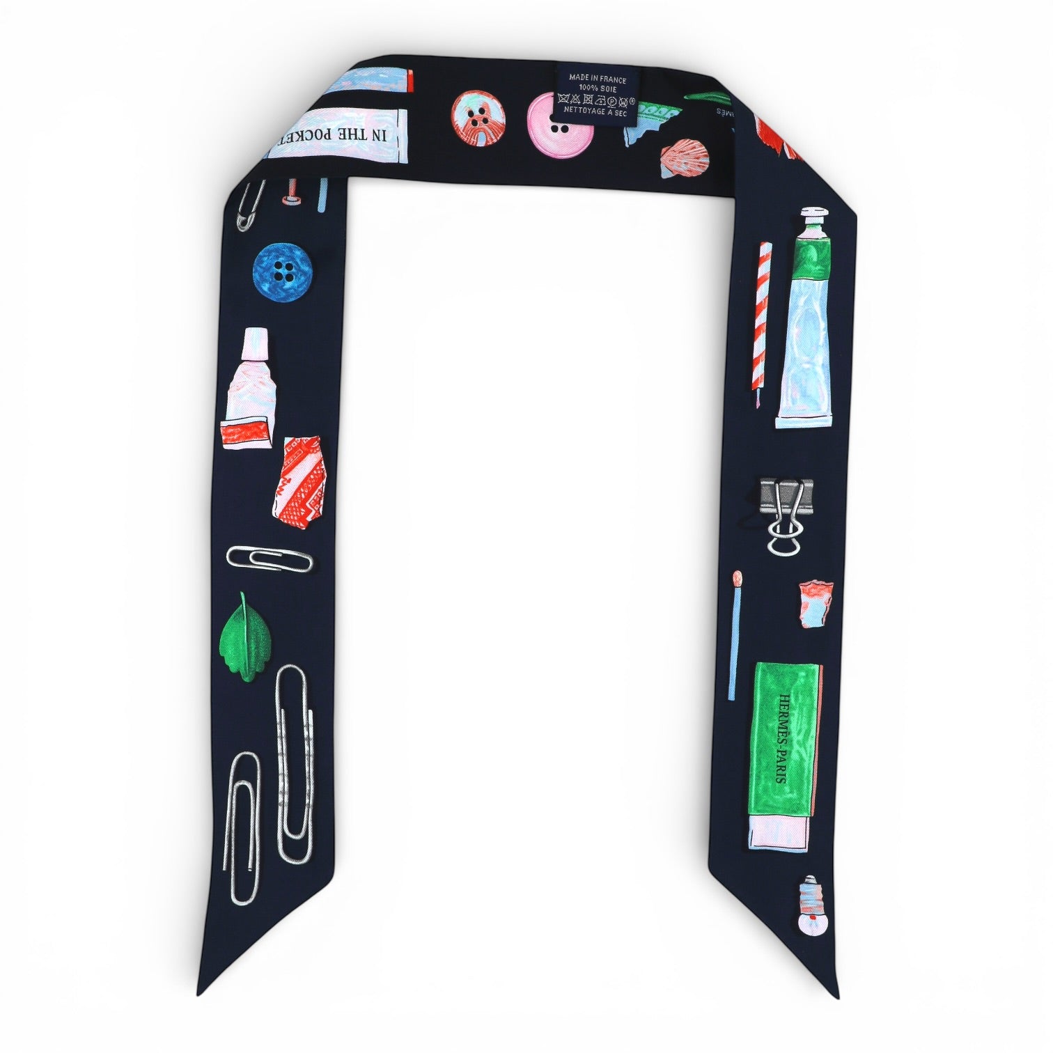 Verspielt, kreativ und unverkennbar Hermès: Das Twilly „In the Pocket“ begeistert mit einem charmanten Design, das alltägliche kleine Schätze kunstvoll in Szene setzt. Auf tiefdunklem Hintergrund entfalten sich detailreiche Illustrationen – von Schreibutensilien über kleine Fundstücke bis hin zu feinen grafischen Elementen – in harmonisch abgestimmten Farben.