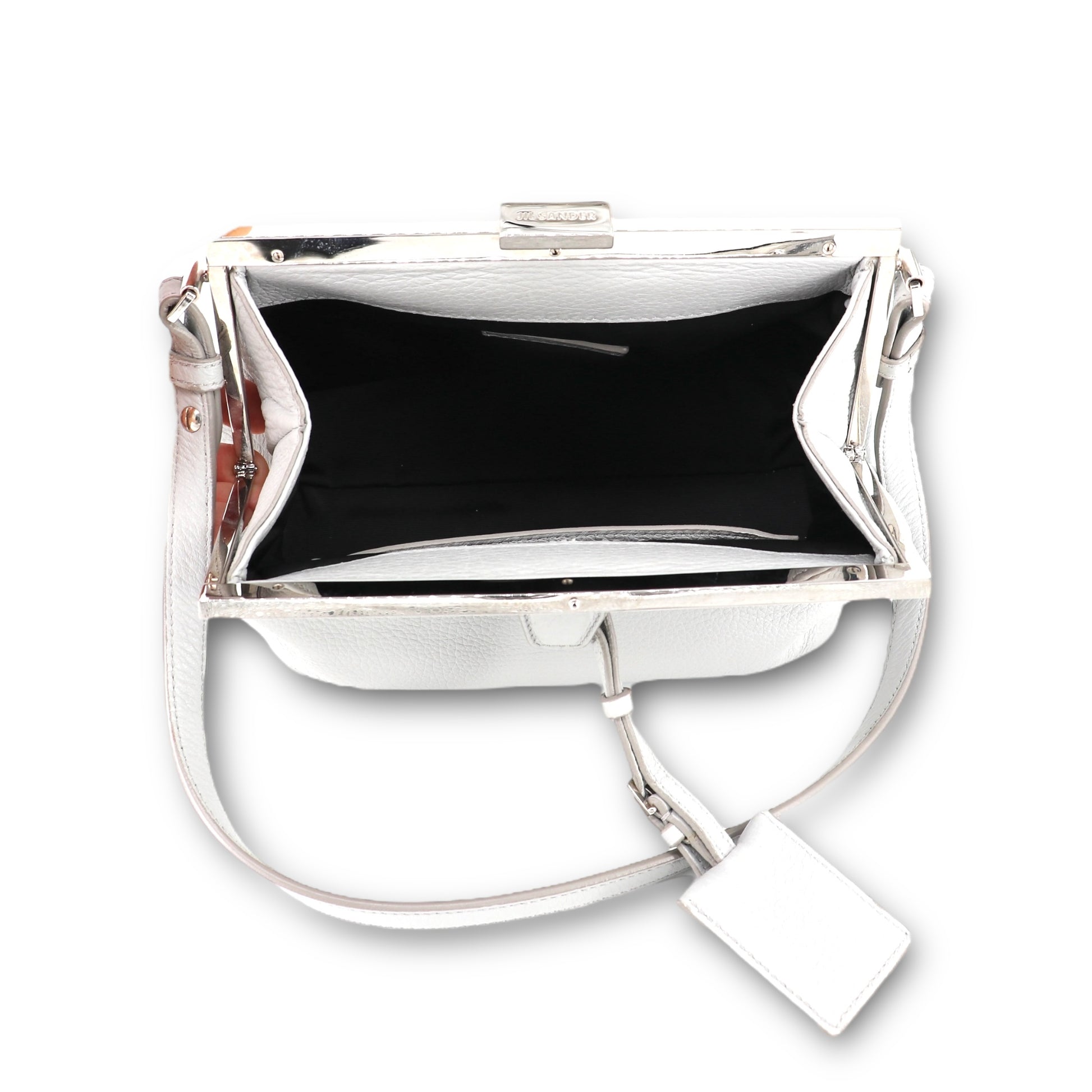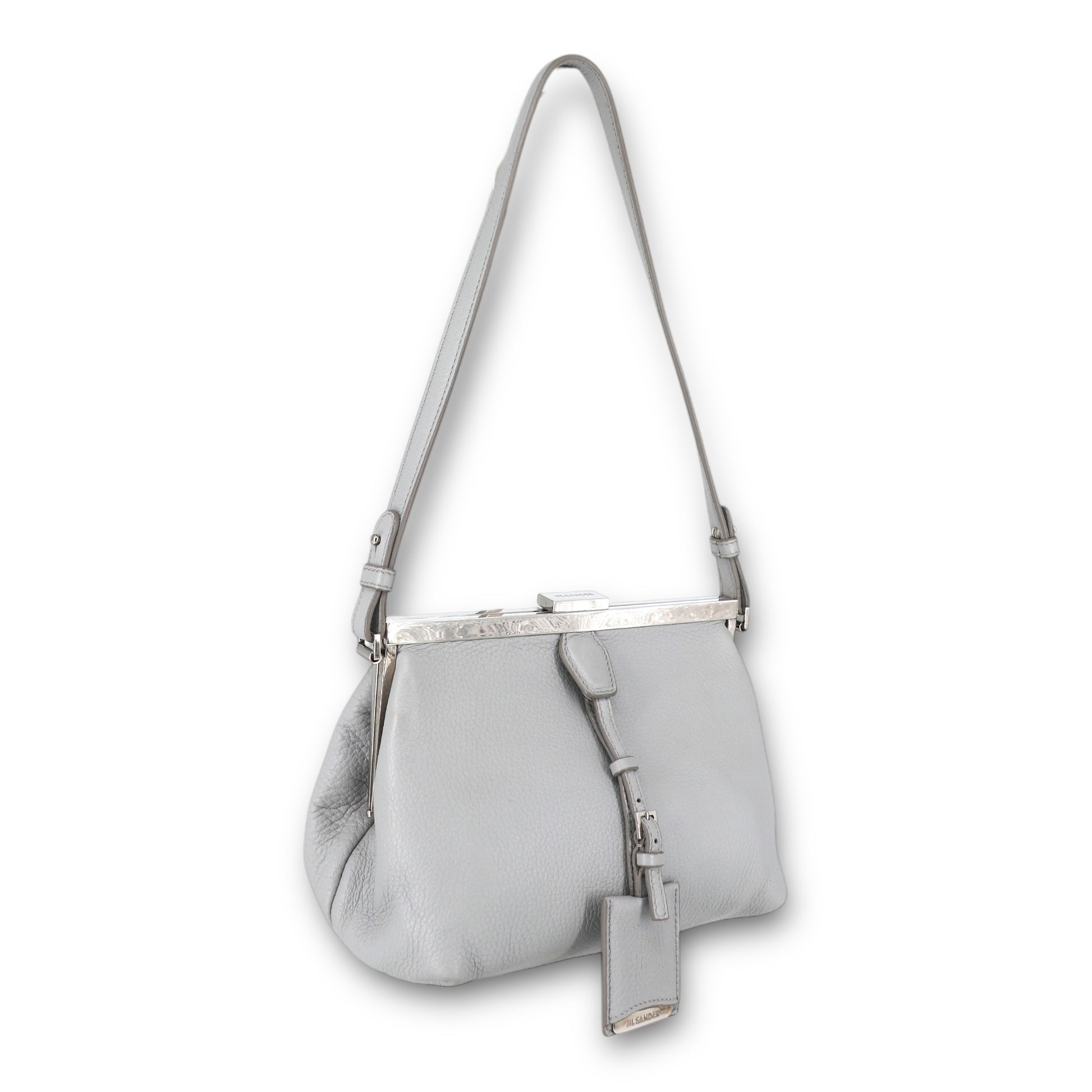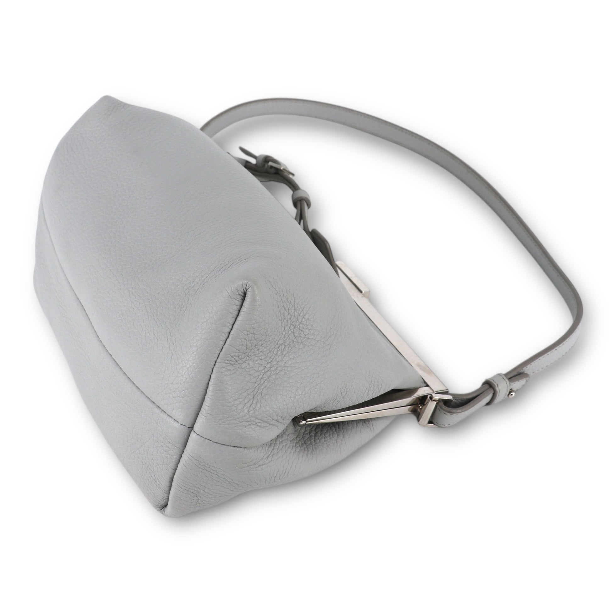 Die Tasche wird durch einen Kippverschluss aus Metall sicher geschlossen und verfügt über einen Lederhenkel, der bequem über der Schulter getragen werden kann. Das Innenfutter aus schwarzem Textil sorgt für einen dezenten Kontrast, während ein flaches Einschubfach aus grauem Leder praktischen Stauraum für kleinere Essentials bietet.