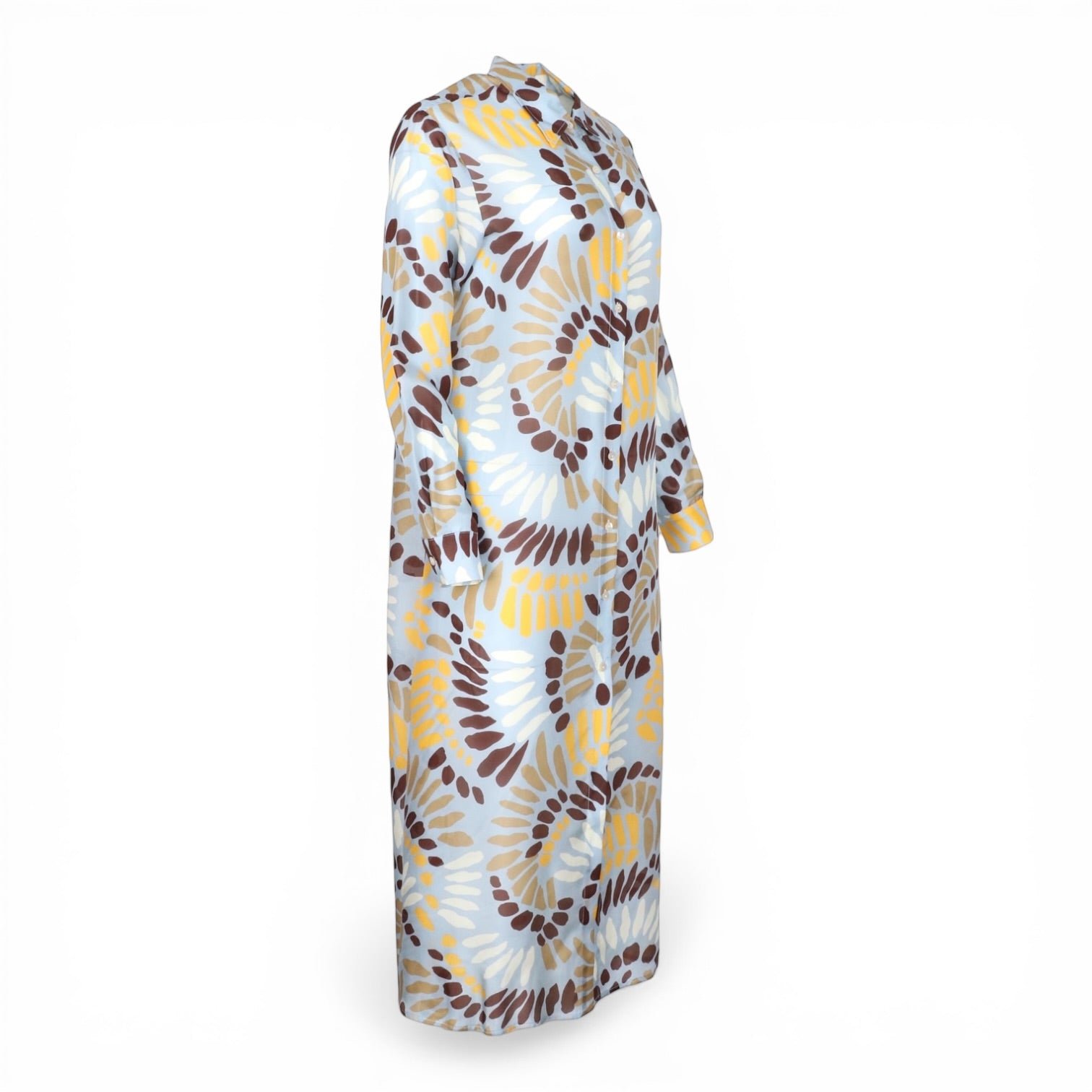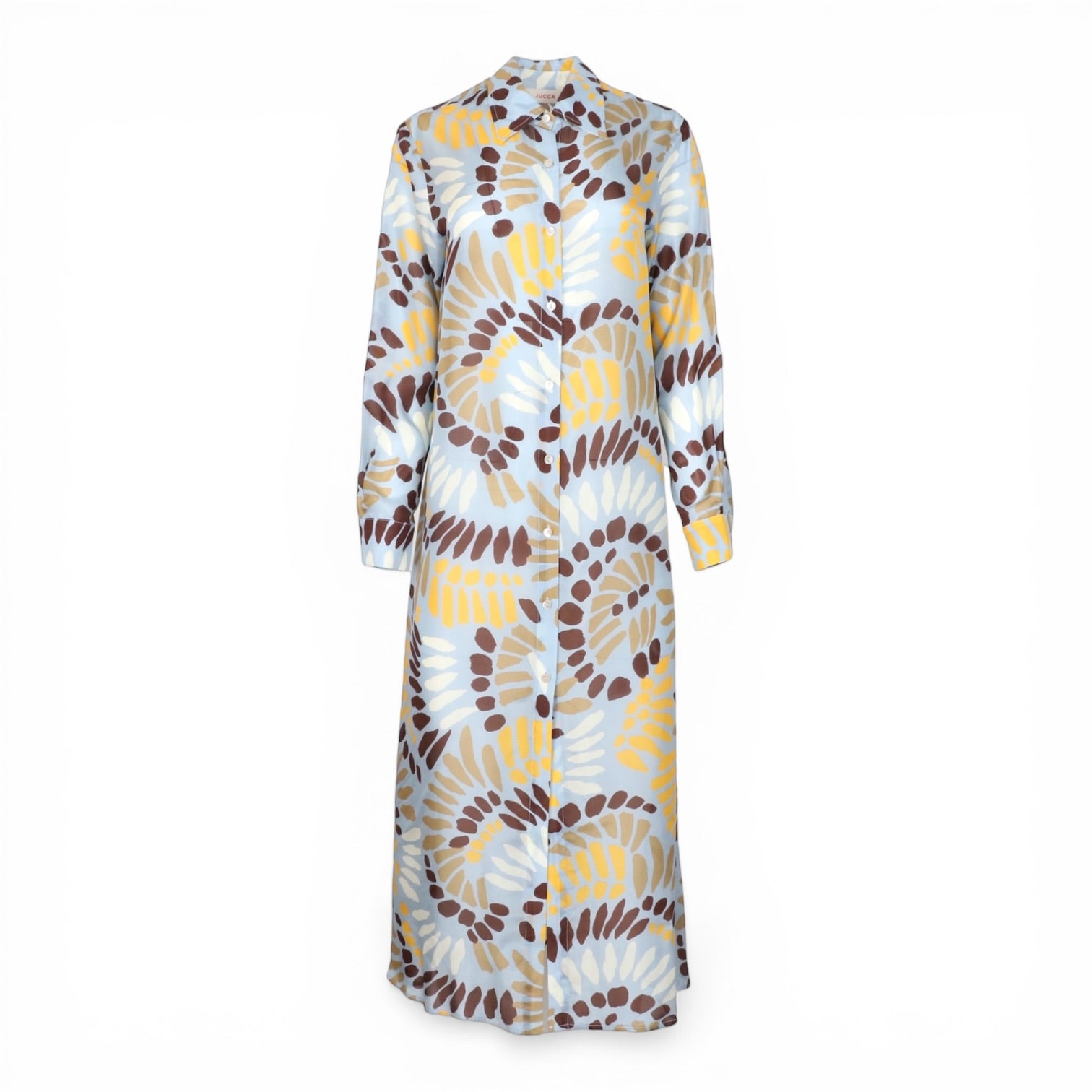 Elegantes Kleid von Jucca aus reiner Seide mit fliessendem, leichtem Fall. Das moderne, grafische Muster in sanften Blau-, Gelb- und Brauntönen verleiht dem Modell eine besondere Ausstrahlung, während der Hemdblusenstil mit durchgehender Knopfleiste für eine lässig-elegante Note sorgt. Ein stilvolles Piece für vielseitige Looks – von casual bis chic.