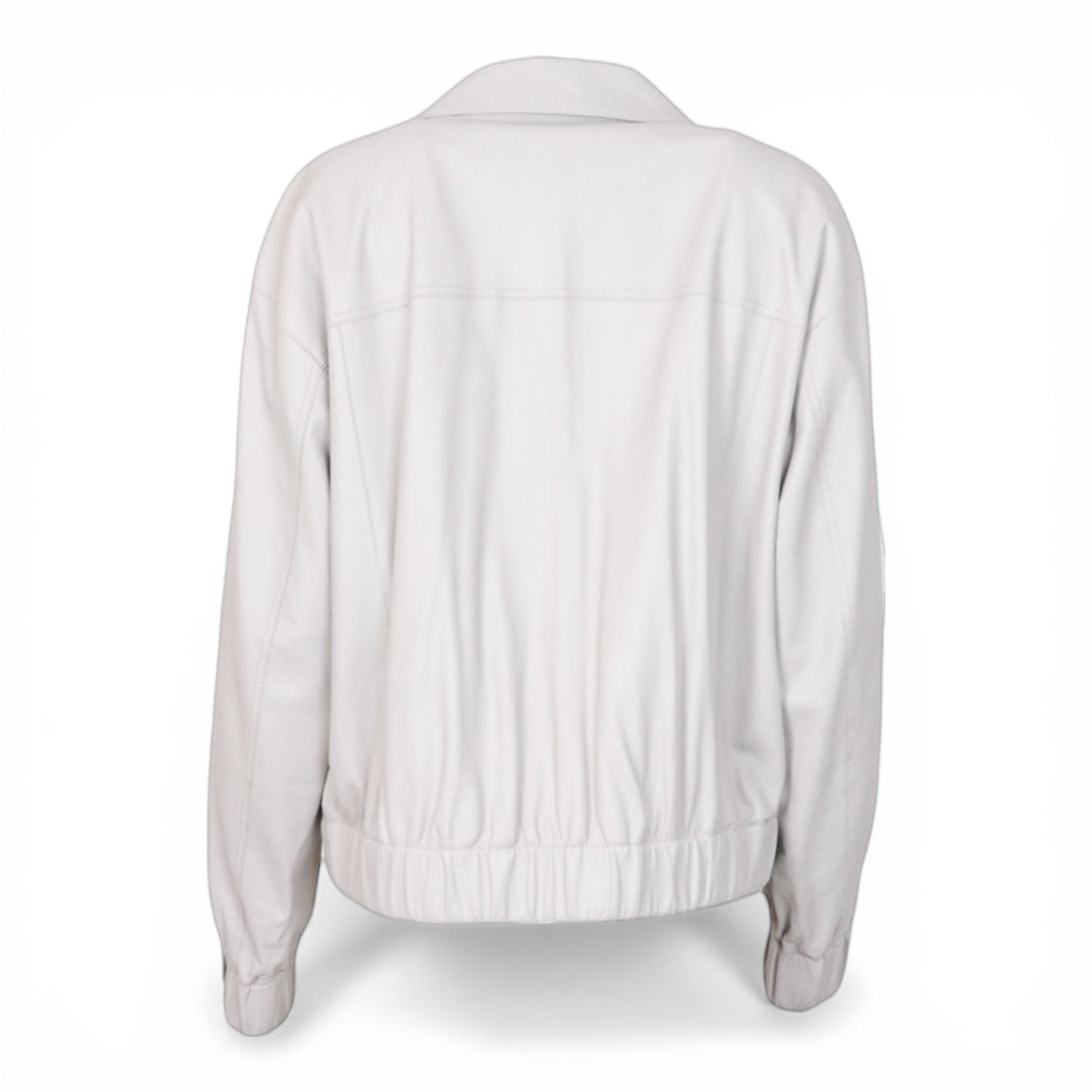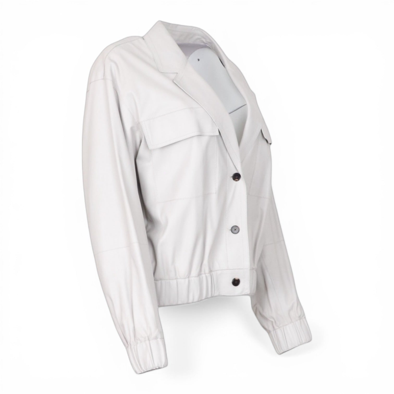 Elegante Lederjacke von Lafayette 148 in hellem, zeitlosem grau mit moderner, femininer Silhouette. Das weiche Leder sorgt für einen luxuriösen Look und hohen Tragekomfort, während der lockere Schnitt mit elastischem Saum und Ärmelabschlüssen eine lässige Note verleiht. Klassische Details wie der Reverskragen und die dezente Knopfleiste runden das stilvolle Design perfekt ab.