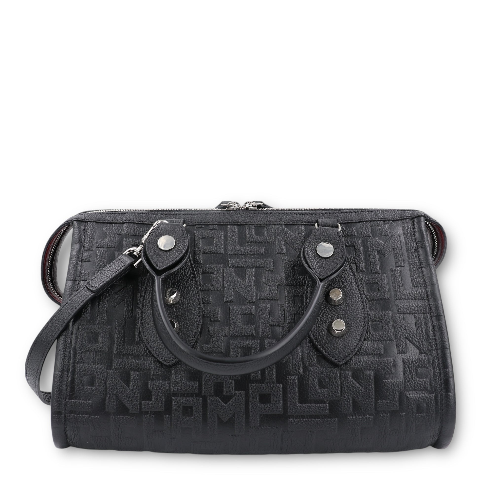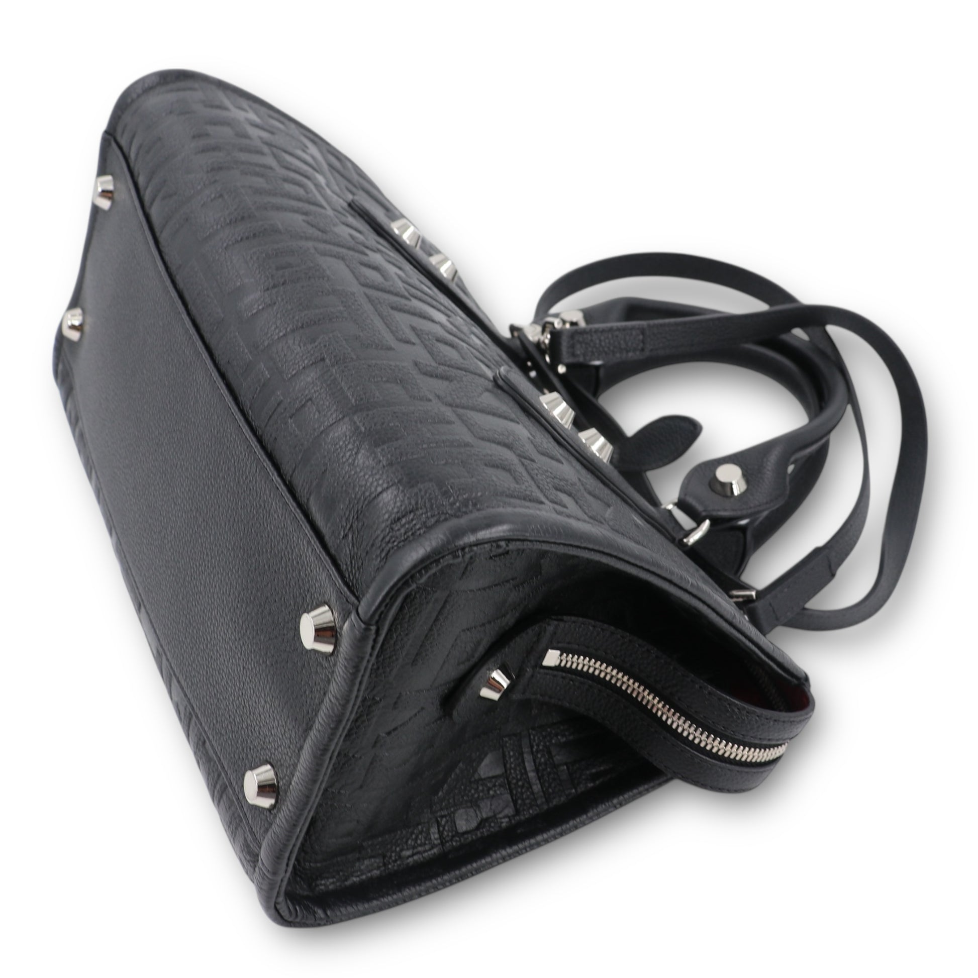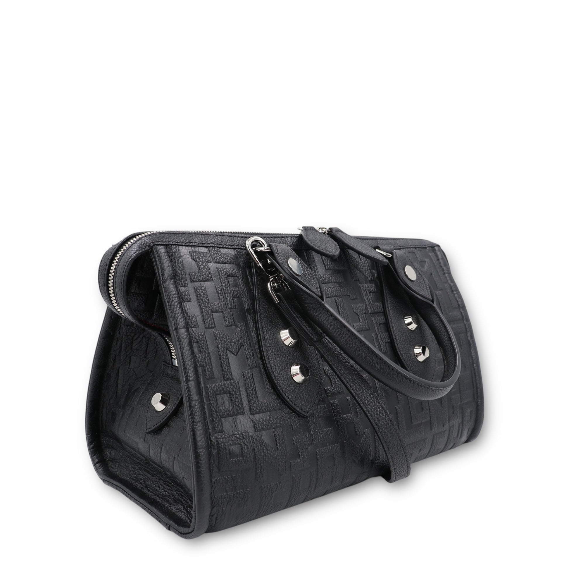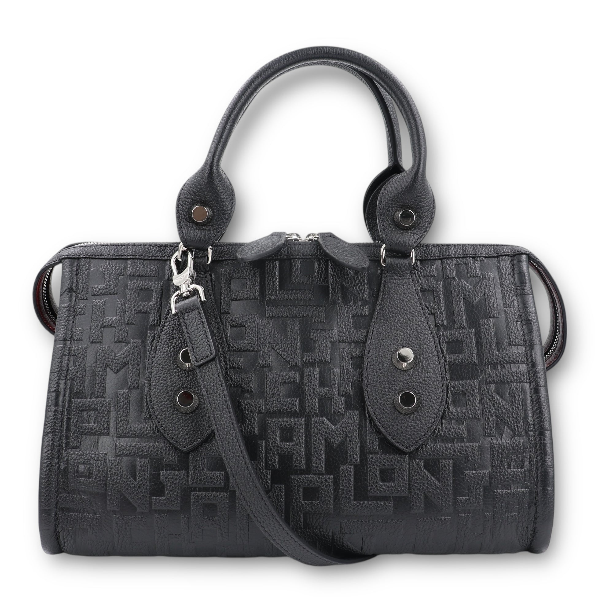 Diese elegante Tasche aus schwarzem, geprägtem Rindsleder besticht durch einen silberfarbenen Doppel-Reissverschluss und zwei Lederhenkel (ca. 13 cm), ergänzt durch einen abnehm- und verstellbaren Leder-Schulterriemen (ca. 110 cm). Vier Standfüsschen sorgen für sicheren Stand. Das Innenfutter aus dunkelrotem Textil umhüllt ein geräumiges Hauptfach mit Reissverschluss-Innenfach, drei praktischen Einschubfächern und einem Schlüsselband – perfekt für eine organisierte Aufbewahrung.