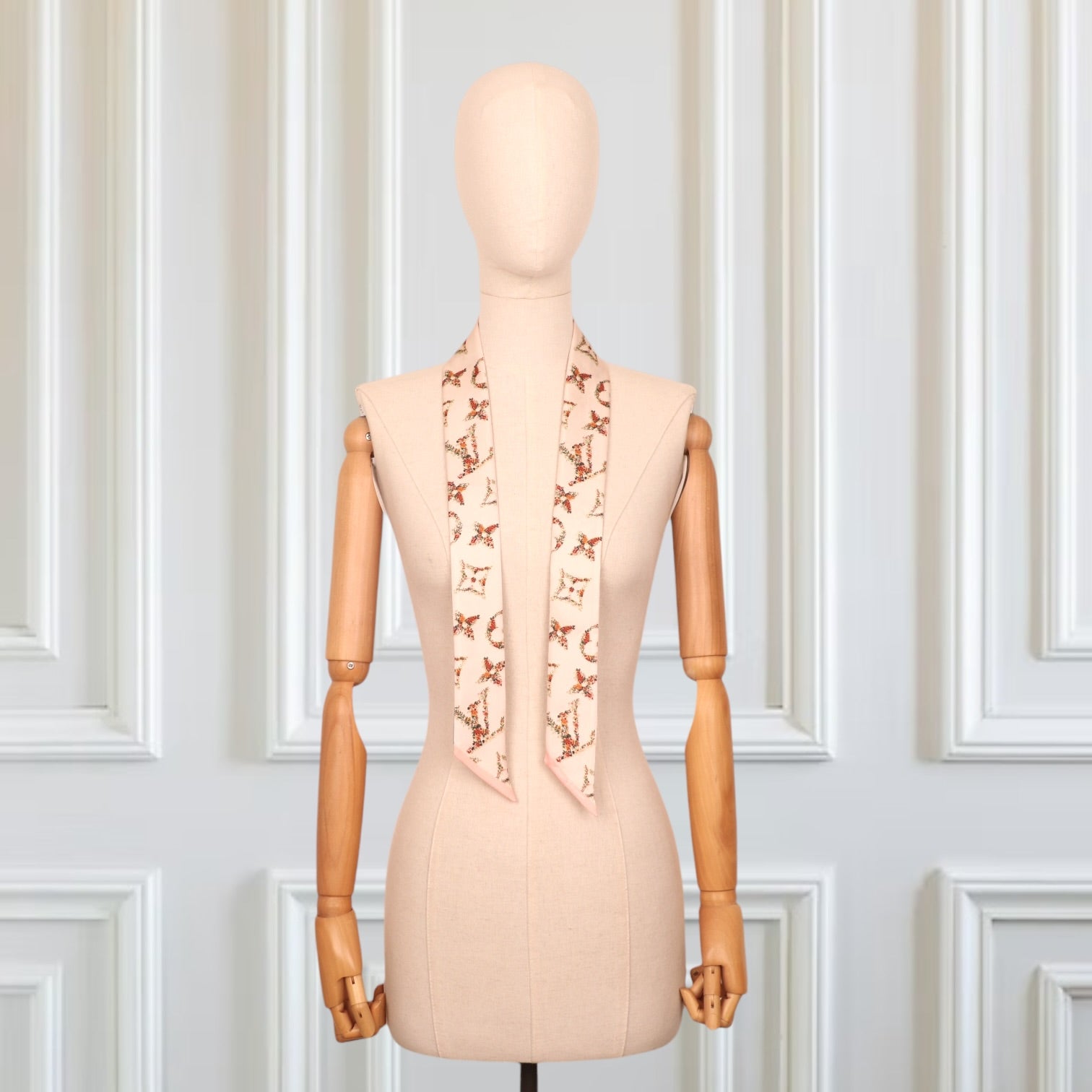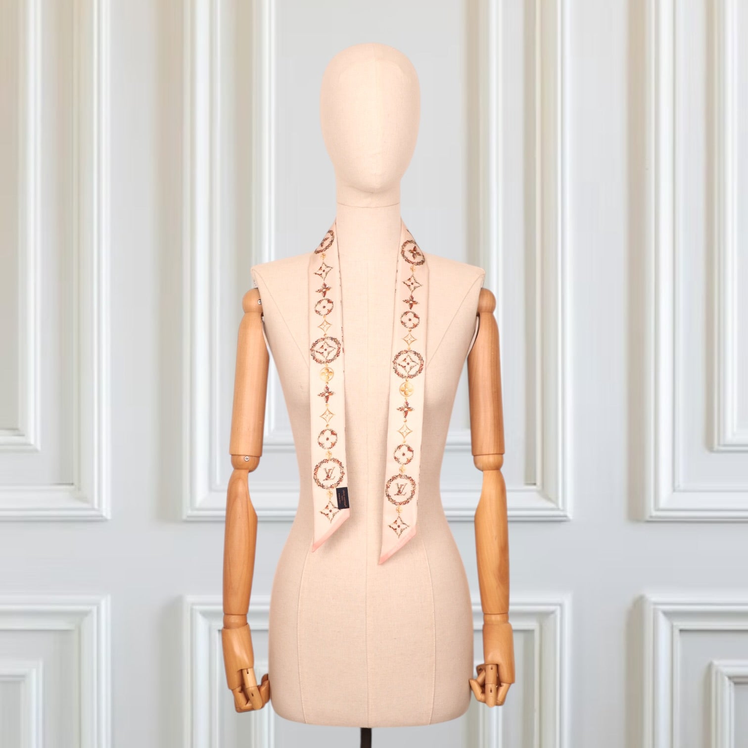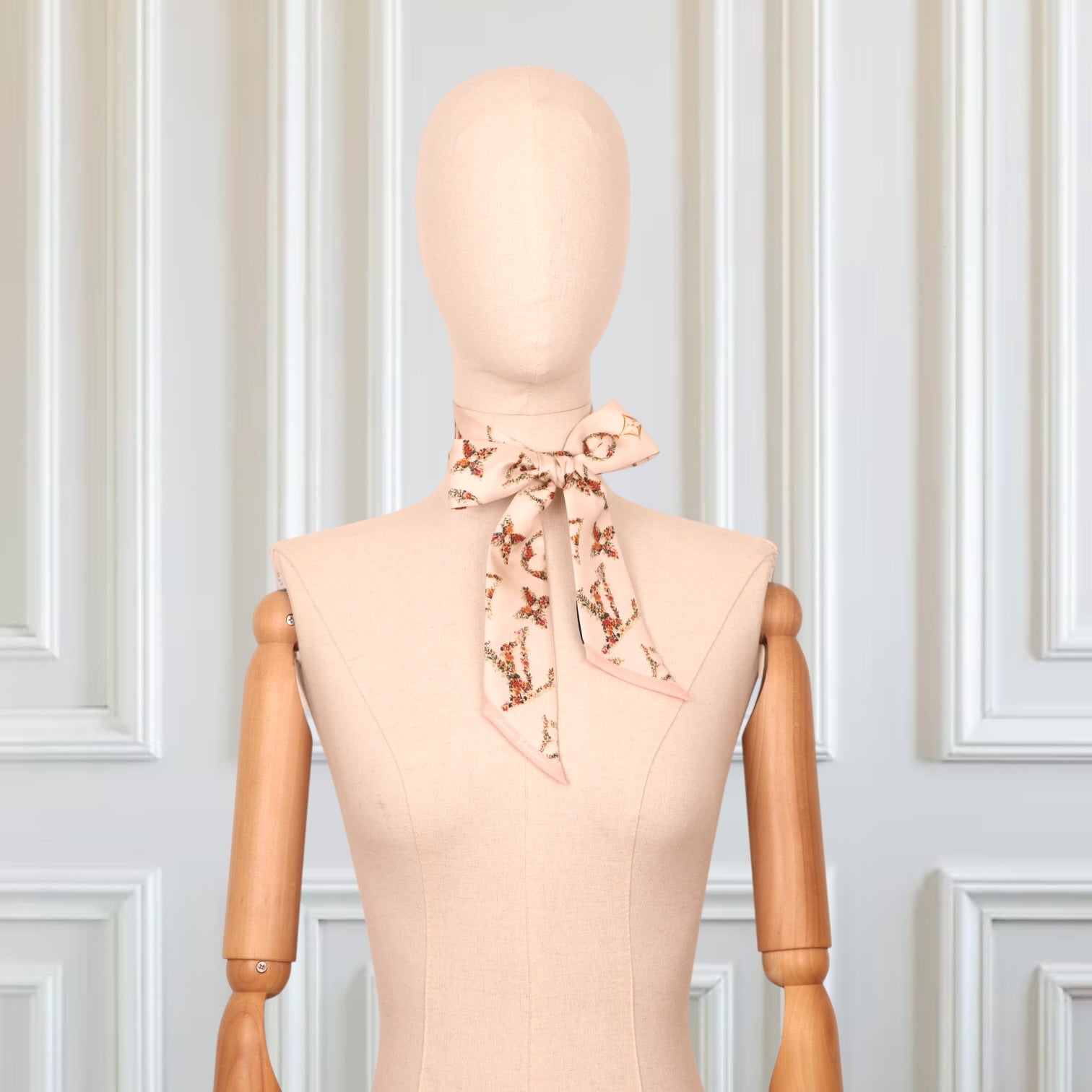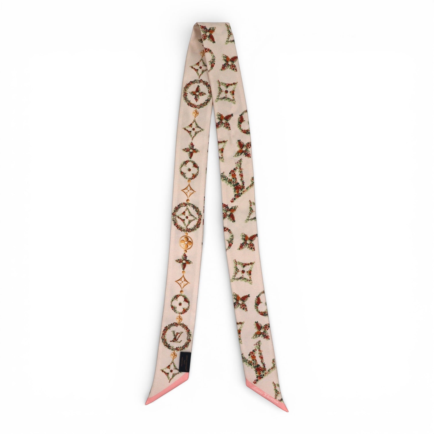 Die harmonische Farbwelt in soften Beige- und Rosétönen wird durch feine florale Details in Grün und Rot ergänzt. Goldene Akzente greifen die luxuriöse DNA der Maison auf und sorgen für einen edlen Gesamtlook.