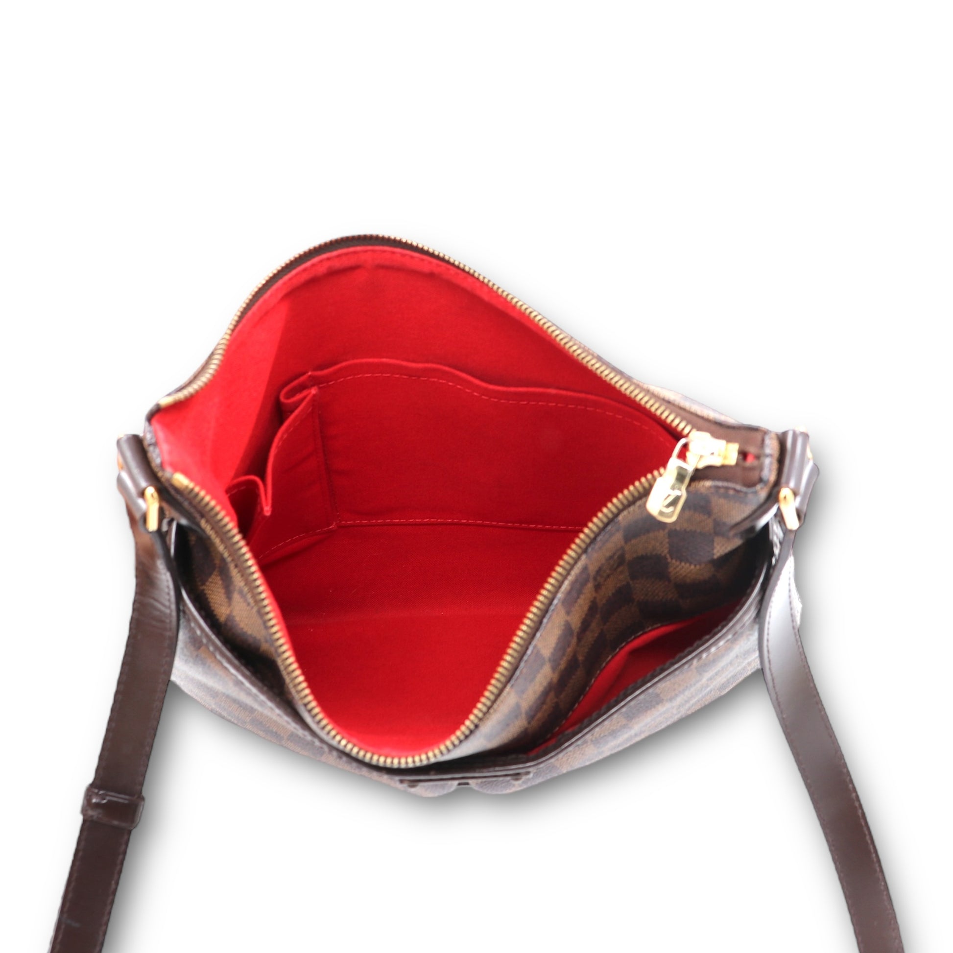 Elegante und zugleich praktische Louis Vuitton Bloomsbury MM aus dem ikonischen Damier Ebène Canvas. Dieses Modell überzeugt durch seine feminine, leicht plissierte Silhouette und den luxuriösen Mix aus Funktionalität und Stil – perfekt für den täglichen Gebrauch.