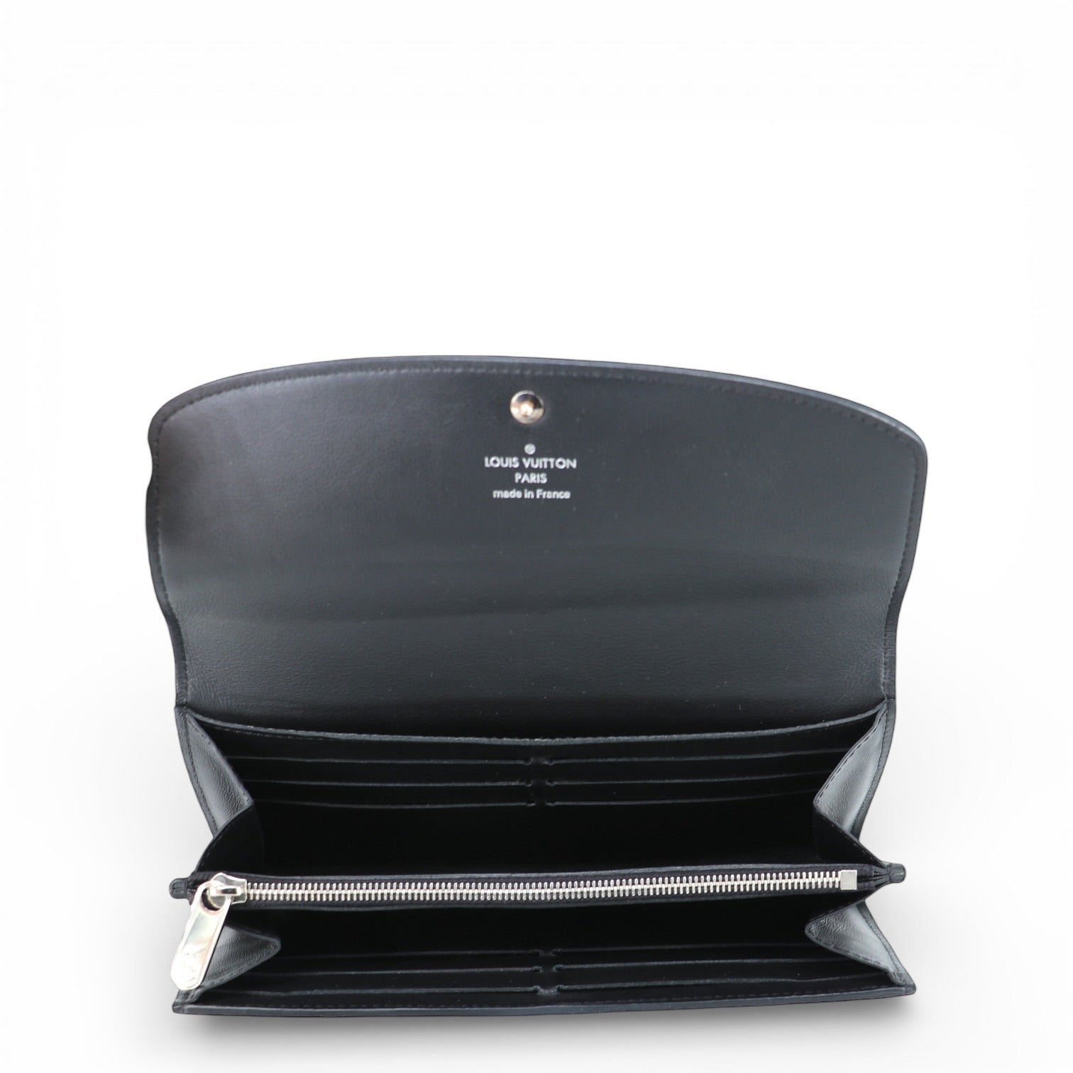 Silberfarbene Metallbeschläge setzen einen kühlen, modernen Akzent und harmonieren perfekt mit dem schwarzen Leder. Der Druckknopf auf der Front ist dezent mit Louis Vuitton graviert und rundet das Design stilvoll ab.
