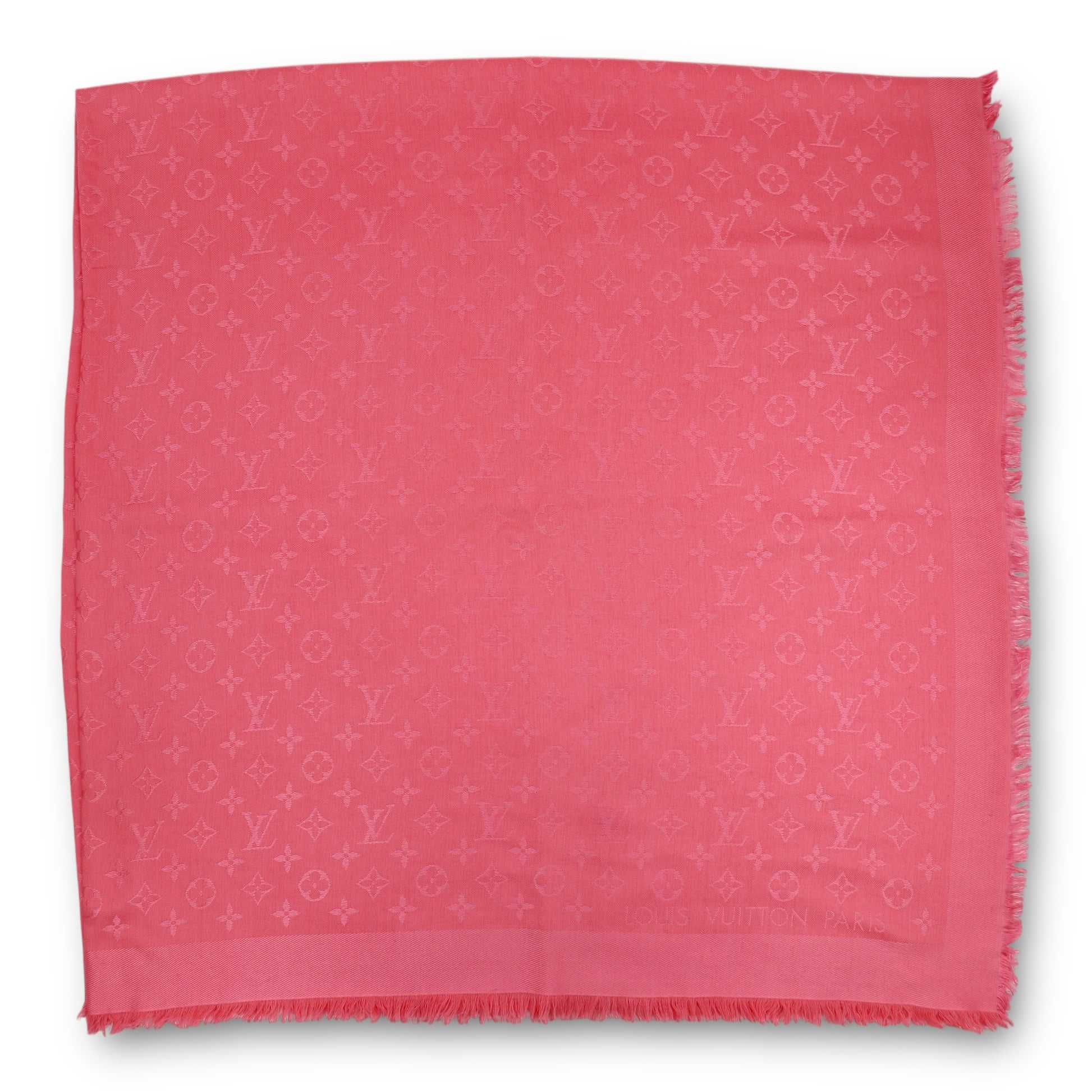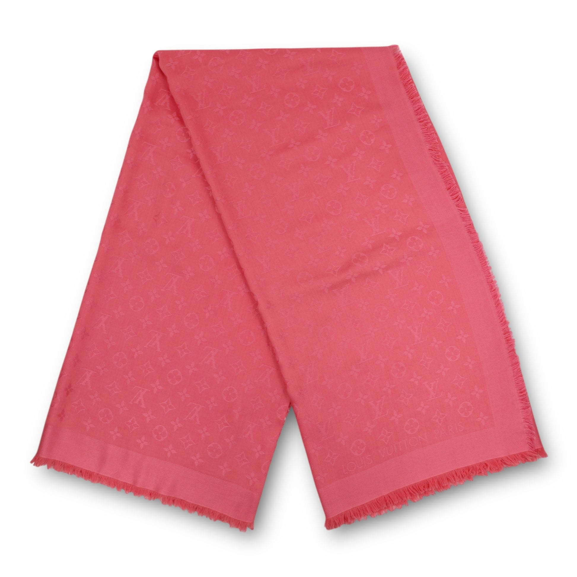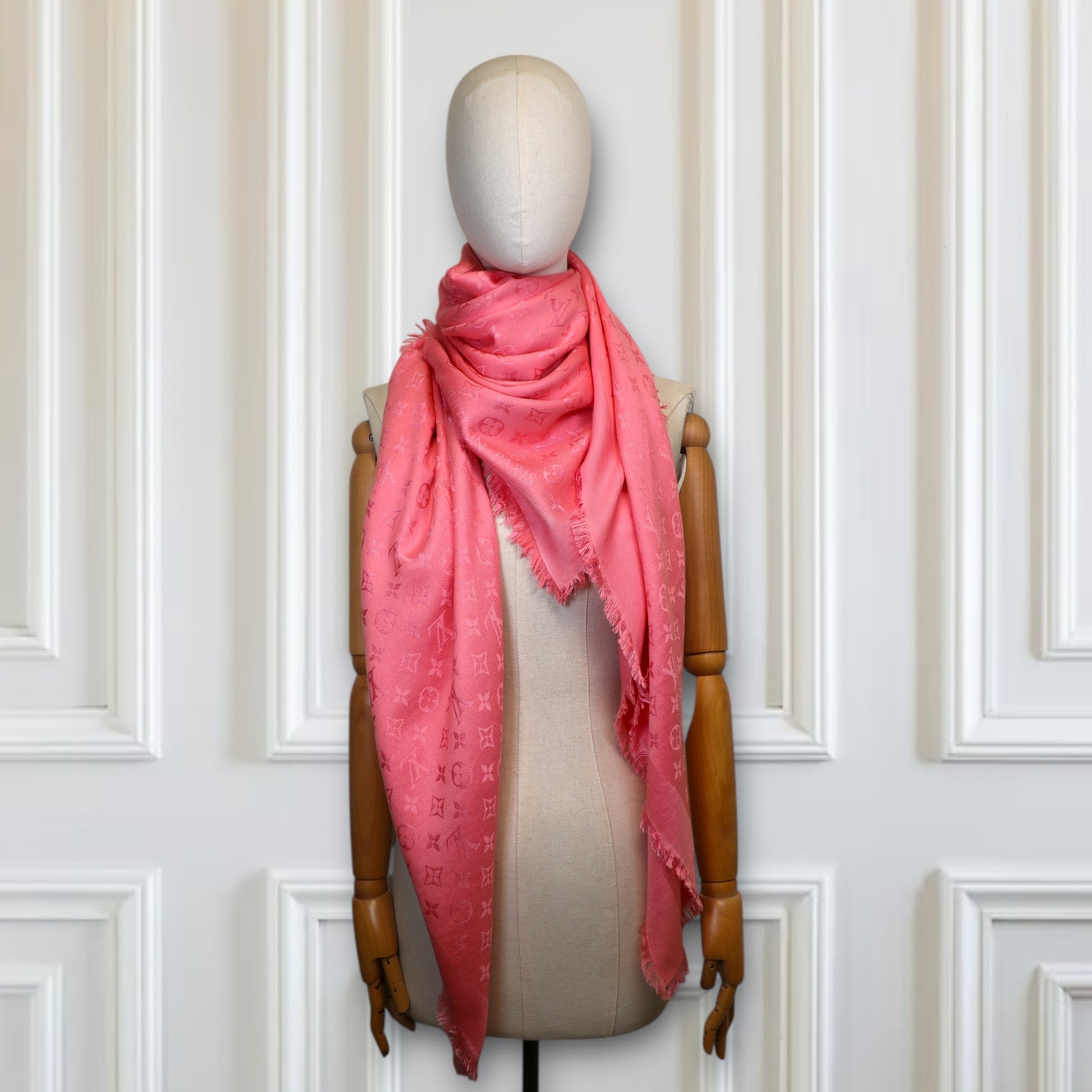 Das Design präsentiert sich in einem wunderschönen Korallton, der Frische und Eleganz ausstrahlt und jedem Outfit eine feminine, edle Note verleiht. Ton-in-Ton eingewebt zeigt sich das ikonische Louis-Vuitton-Monogramm mit den charakteristischen LV-Initialen und floralen Motiven. Die feine Jacquard-Webstruktur verleiht dem Tuch Tiefe und einen dezenten Glanz, der das hochwertige Material besonders schön zur Geltung bringt.