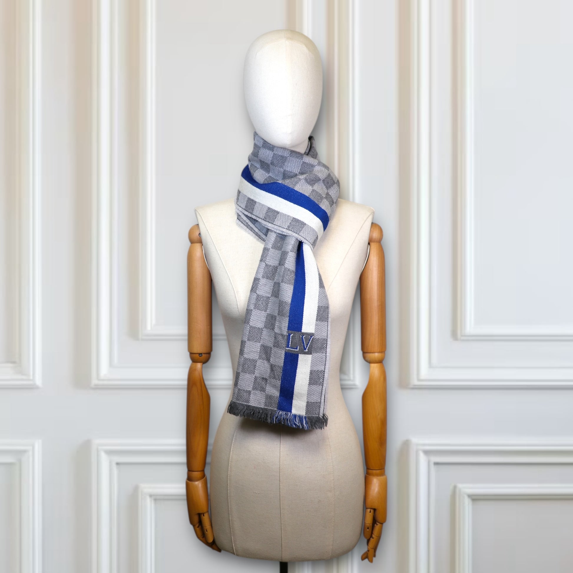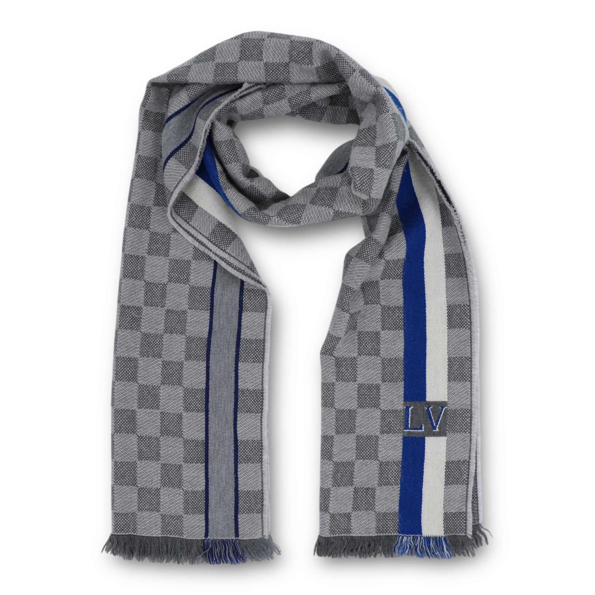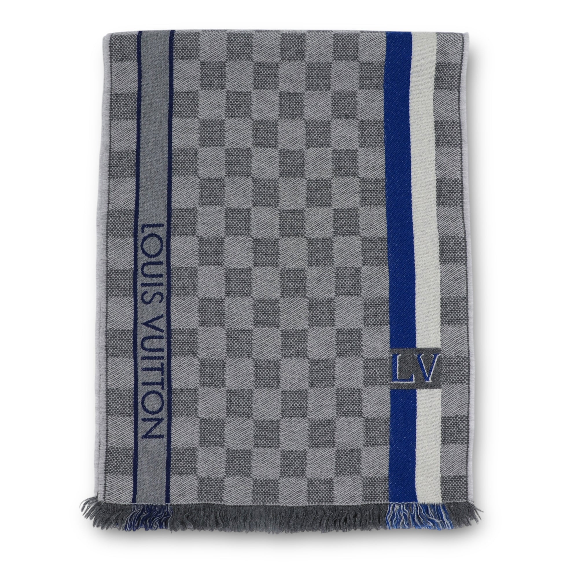 Das Design ist geprägt vom ikonischen Damier-Muster in edlen Grautönen, das dem Schal eine moderne und zugleich klassische Ausstrahlung verleiht. Vertikale Kontraststreifen in Blau und Off-White setzen stilvolle Akzente und unterstreichen den luxuriösen Charakter. Dezent eingewebte Louis-Vuitton-Schriftzüge sowie ein kleines LV-Logorunden das Erscheinungsbild harmonisch ab.