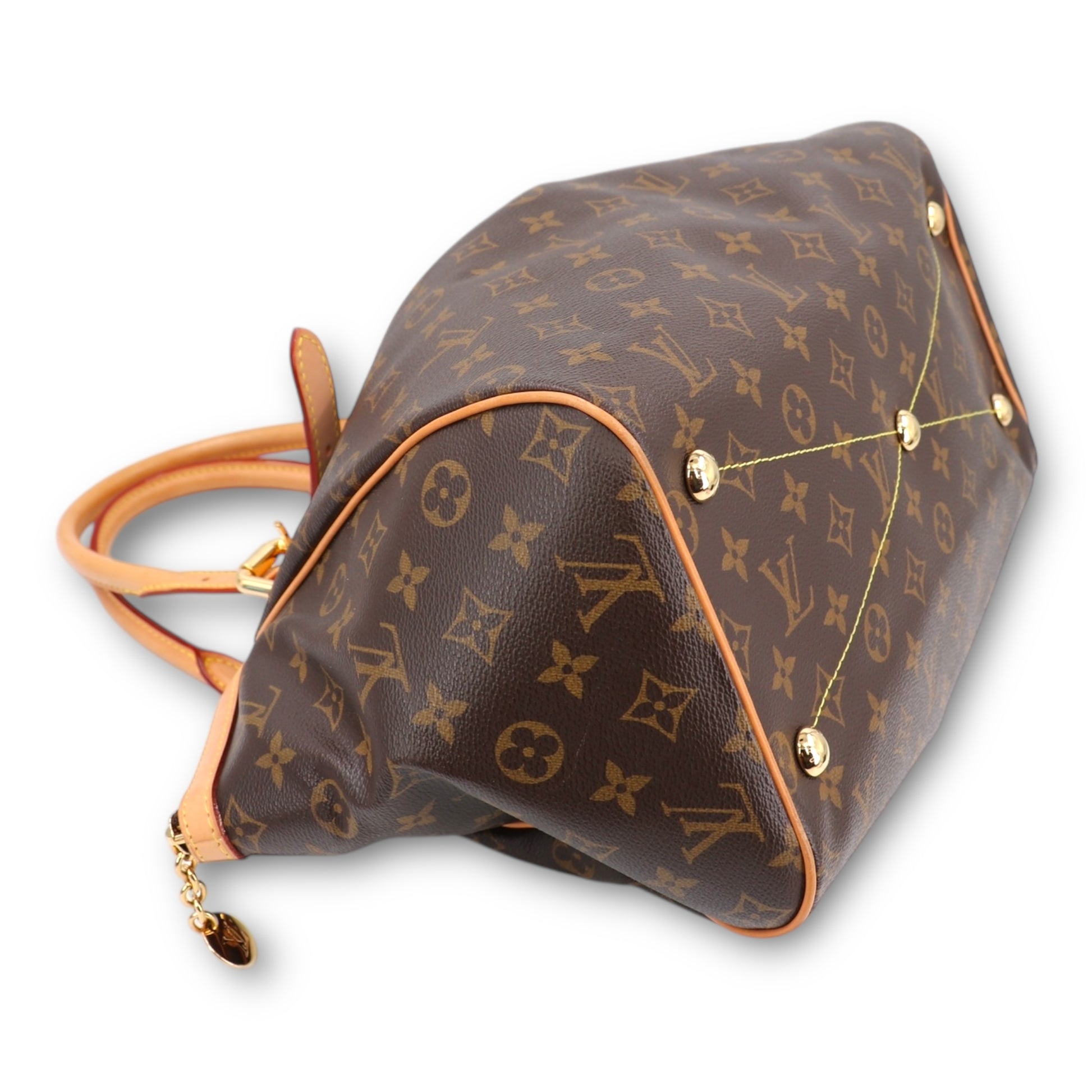 Gefertigt aus dem widerstandsfähigen Louis Vuitton Monogram Canvas, überzeugt die Tivoli durch ihre langlebige Qualität und den unverkennbaren LV-Look. Die goldfarbene Hardware setzt luxuriöse Akzente und harmoniert perfekt mit den Vachetta-Lederhenkeln, die sich beidseitig in der Höhe verstellen lassen – ideal für optimalen Tragekomfort.