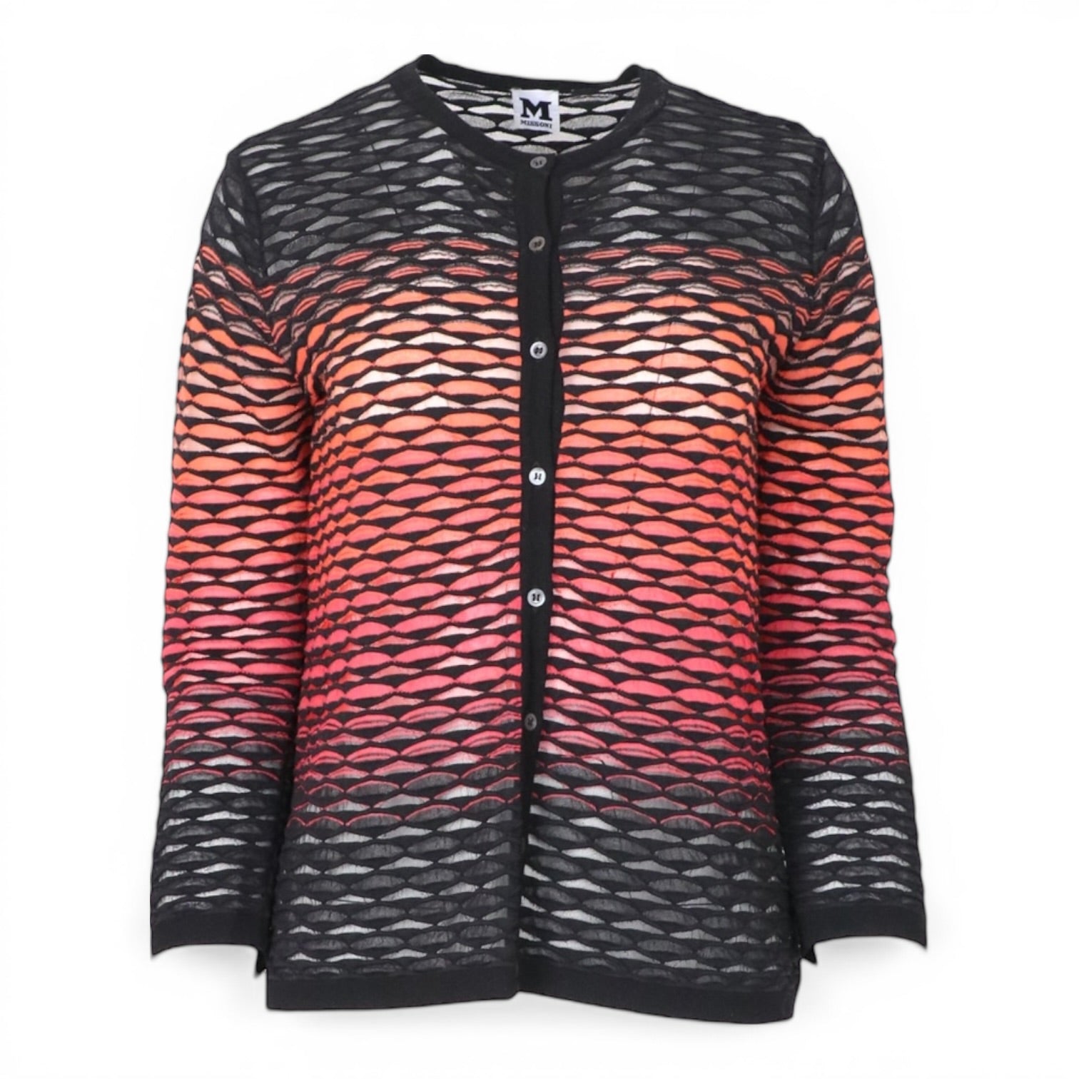 Auffälliger Cardigan von Missoni mit charakteristischem Strickmuster in Schwarz und leuchtenden Farbverläufen von Orange bis Pink. Die feine, luftige Struktur verleiht dem Modell eine besondere Leichtigkeit, während die klassische Knopfleiste und der Rundhalsausschnitt für zeitlose Eleganz sorgen. Ein stilvolles Statement-Piece, das jedem Outfit eine modische Note verleiht.