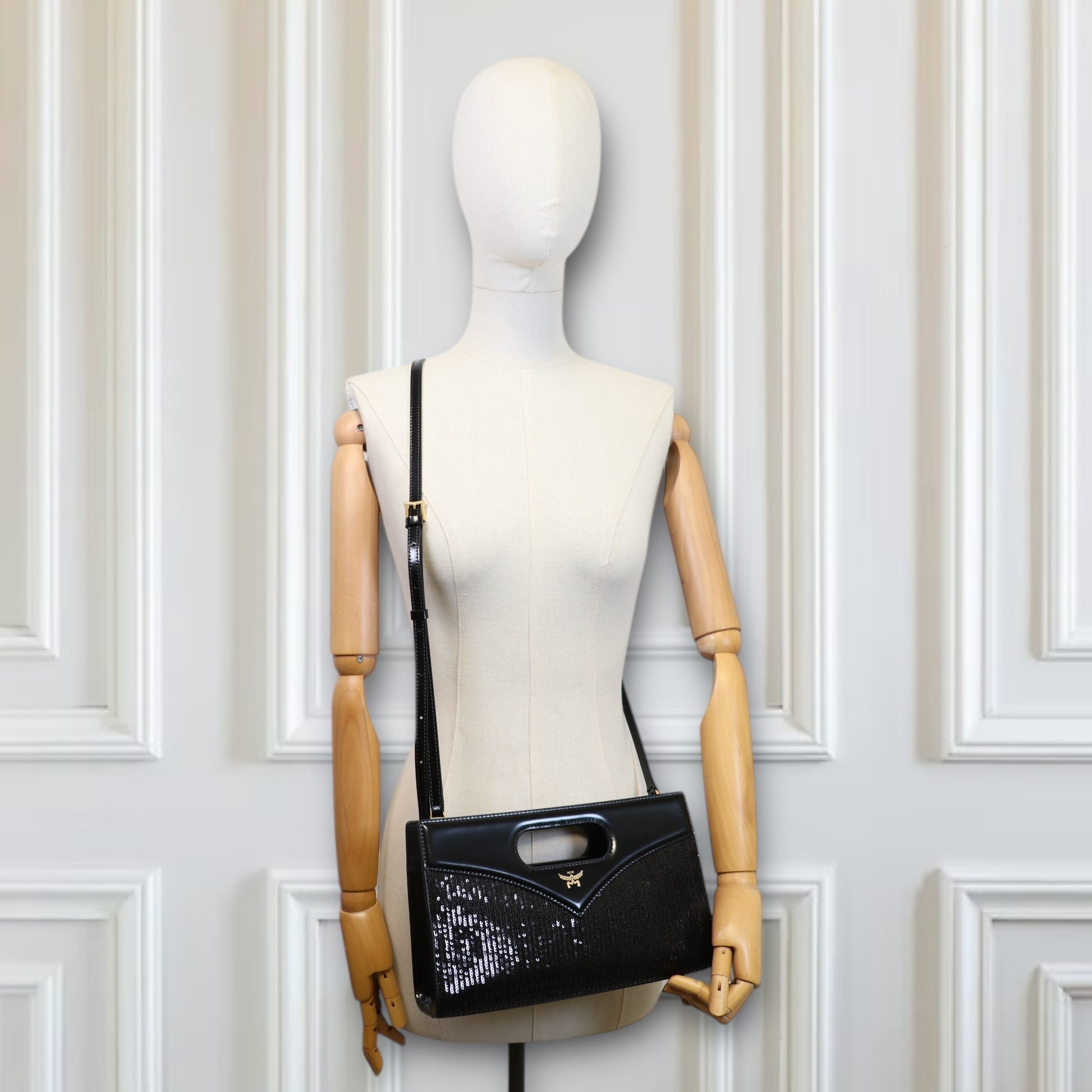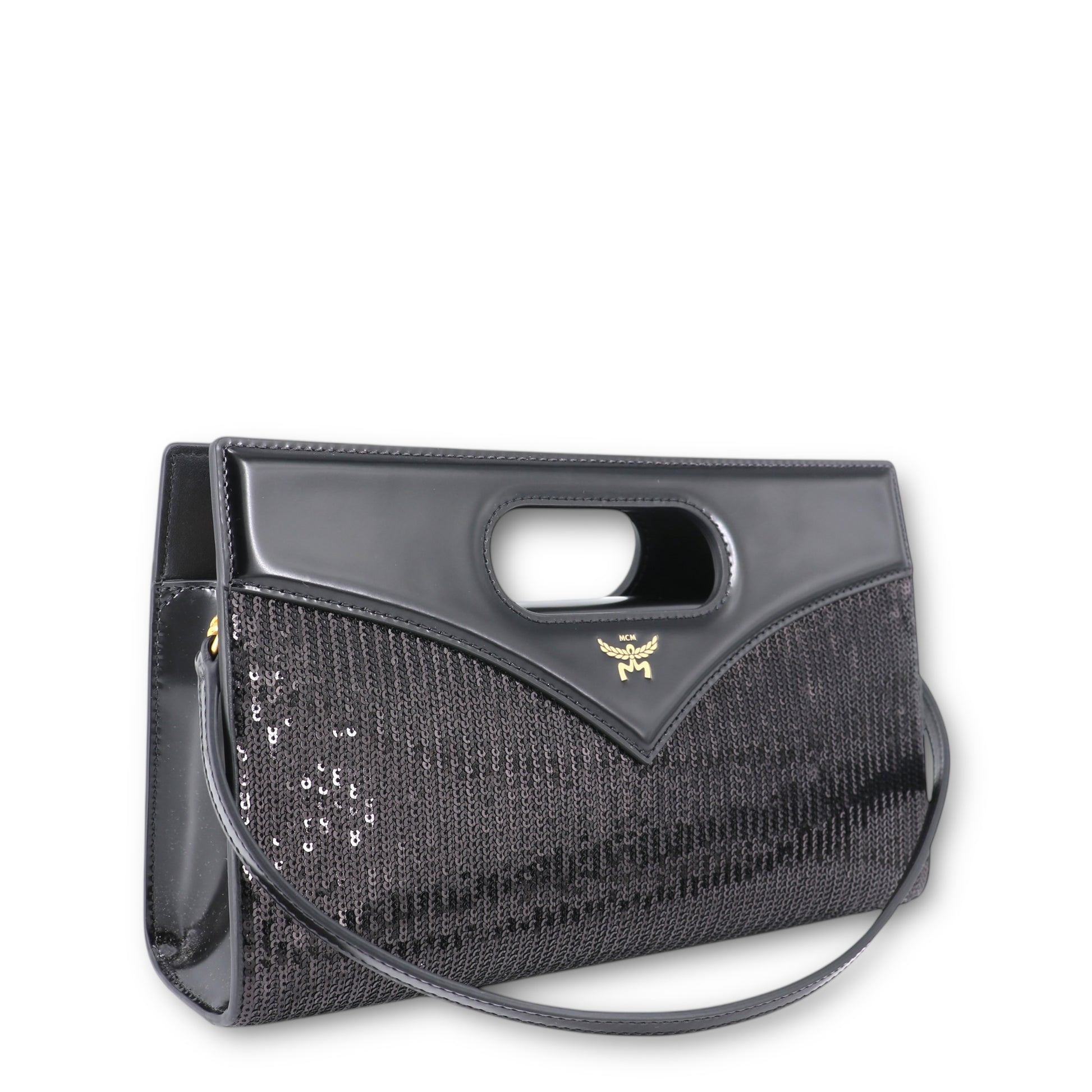 Der obere Überschlag aus glänzendem Lackleder ist in der charakteristischen Diamond-Form gestaltet und bildet einen stilvollen Kontrast zur strukturierten Paillettenfläche. Mittig auf der Front befindet sich das feine, goldfarbene MCM-Logo mit Lorbeerkranz, ein klassisches Markenzeichen des Hauses, das dem Design eine exklusive Note verleiht.
