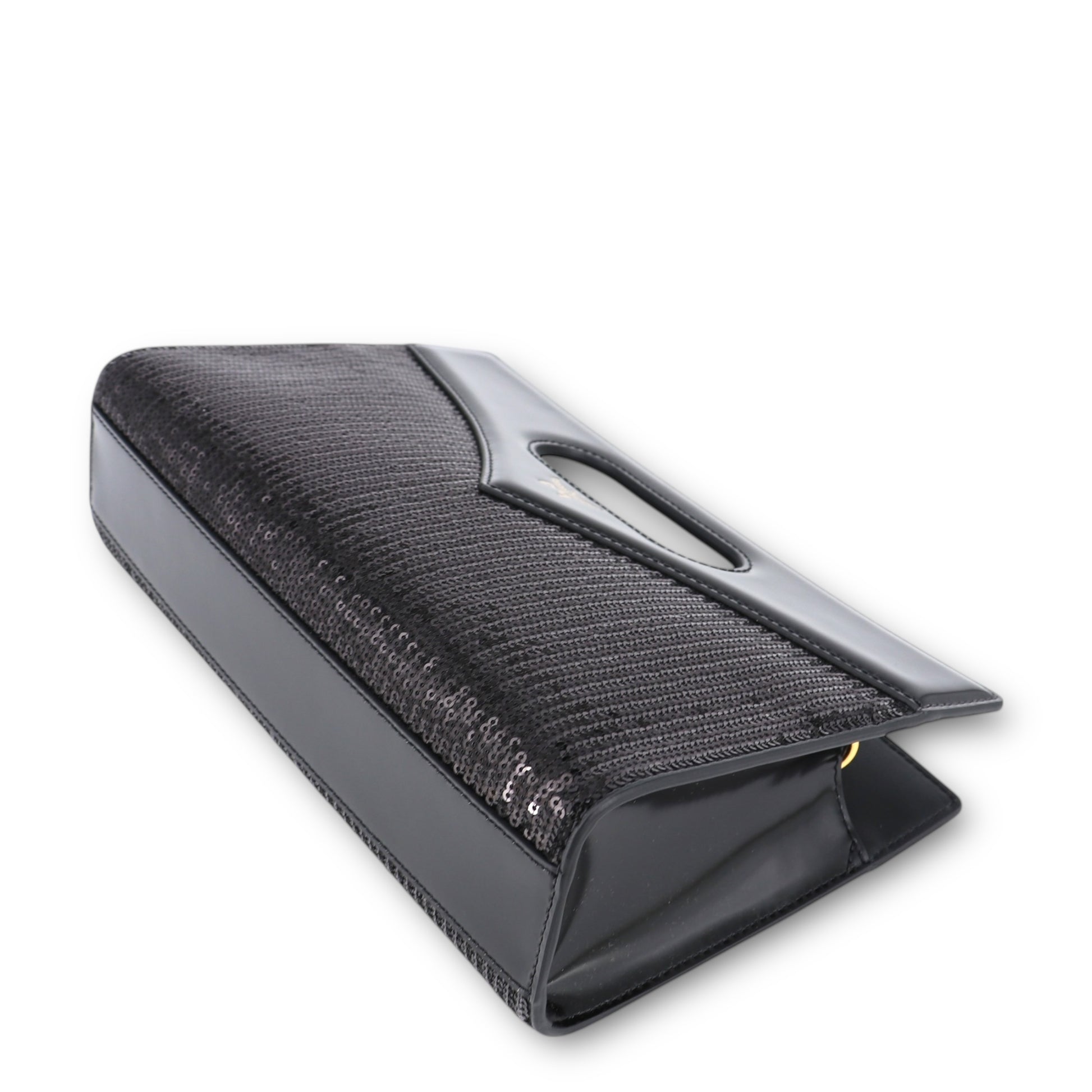Gefertigt aus feinstem schwarzem Lammleder, überzeugt die Tasche durch ihre besonders weiche, geschmeidige Haptik und ihre hochwertige Anmutung. Die Front ist kunstvoll mit einem Paillettenbesatz versehen, der bei jeder Bewegung subtil funkelt und der Tasche einen edlen, glamourösen Charakter verleiht – perfekt für Abendveranstaltungen, Dinner oder besondere Anlässe.